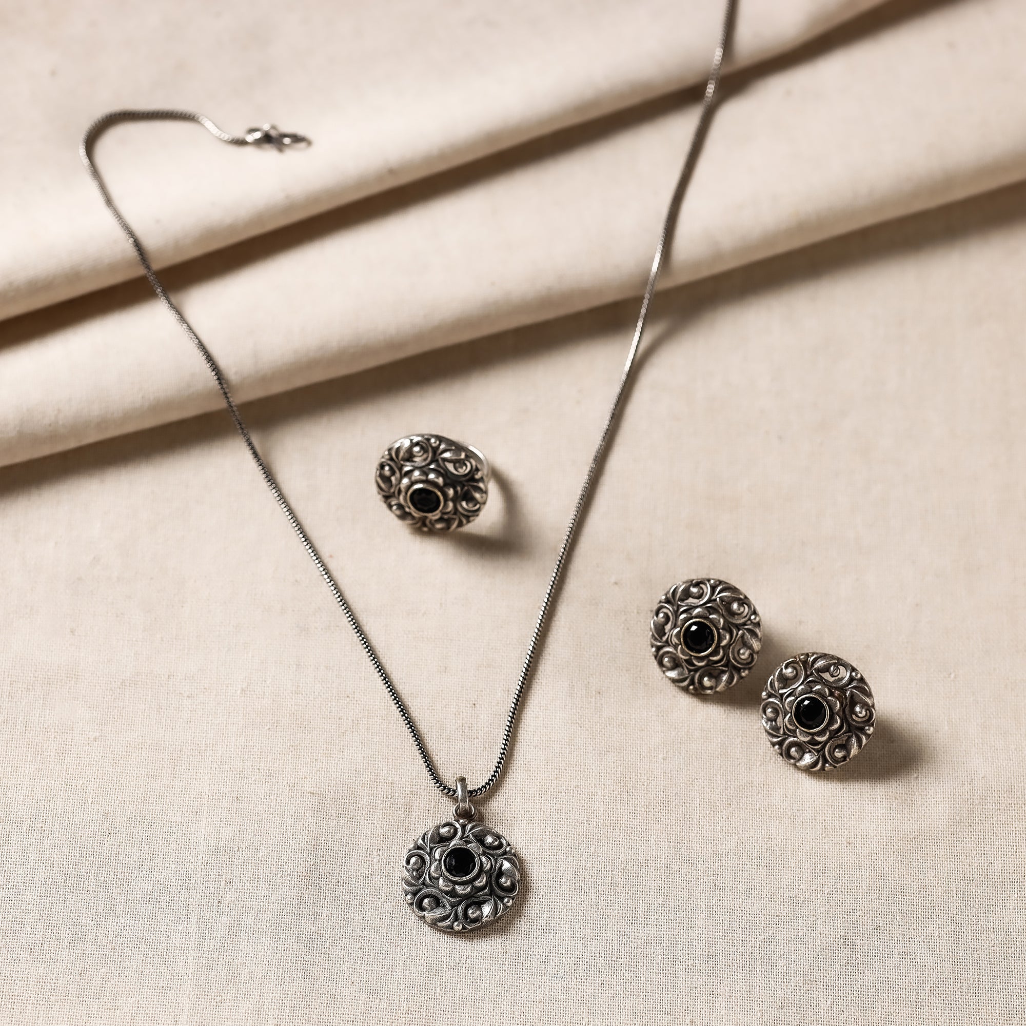 Antique silver finish oxidised brass base stone work necklace set with ring, made of high quality oxidised metal with rustic shine effect. Combining vintage charm with contemporary elegance. Dressing up for a special occasion or adding a touch of sophistication to your everyday look, this necklace set effortlessly elevates any outfit.