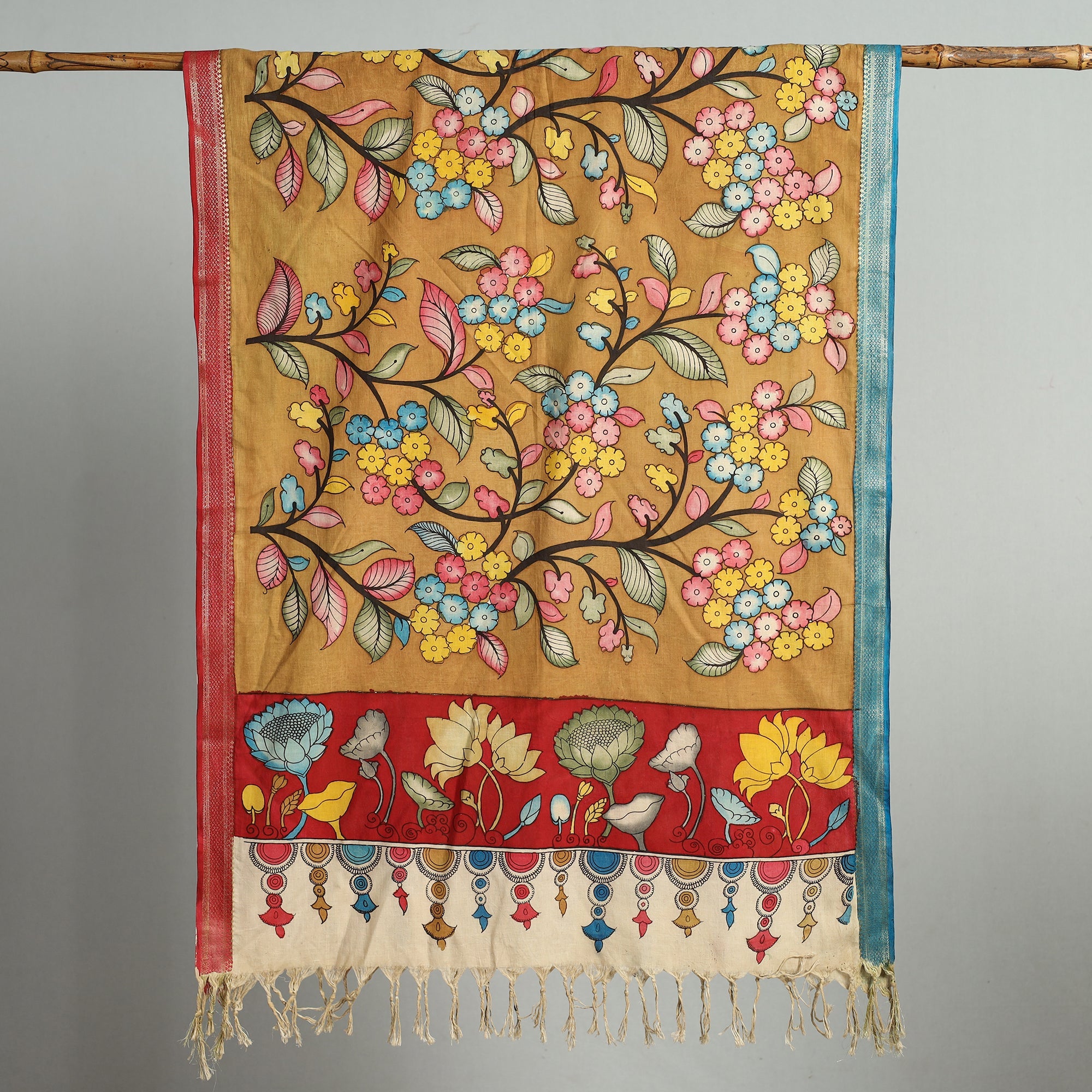 This exquisite brown srikalahasti pen work kalamkari cotton handpainted zari border dupatta with tassels made using natural colours. This masterpiece combines traditional craftsmanship with contemporary elegance. Hand-painted with intricate srikalahasti pen work kalamkari motifs, it boasts a luxurious zari border and charming tassels. Perfect for adding flair to any outfit, whether paired with ethnic wear for festive occasions or draped over casual attire for a touch of sophistication. Experience timeless beauty and cultural richness with every wear.