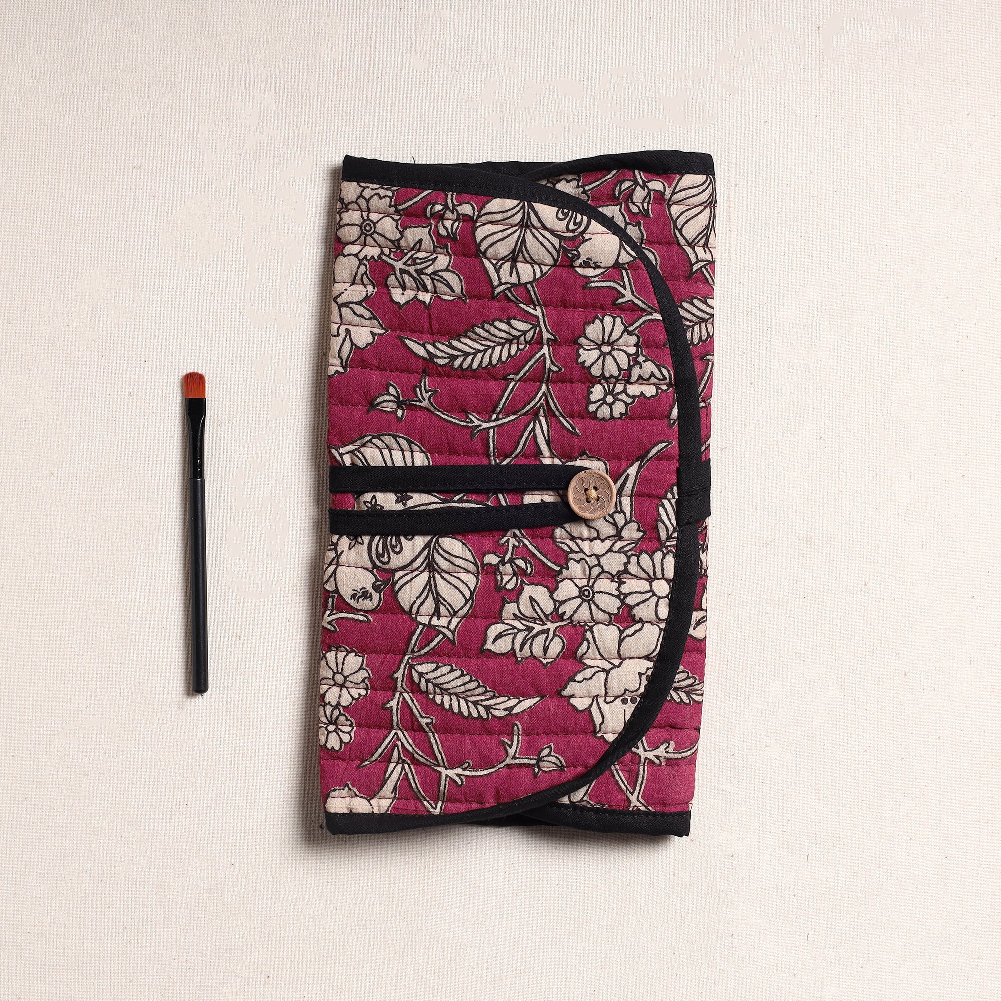 Handcrafted multipurpose segmented make-up brush wrap pouch or storage organizer made from Kalamkari printed cotton fabrics and foam, textured with handmade textiles from India. It has one big and five small pockets.