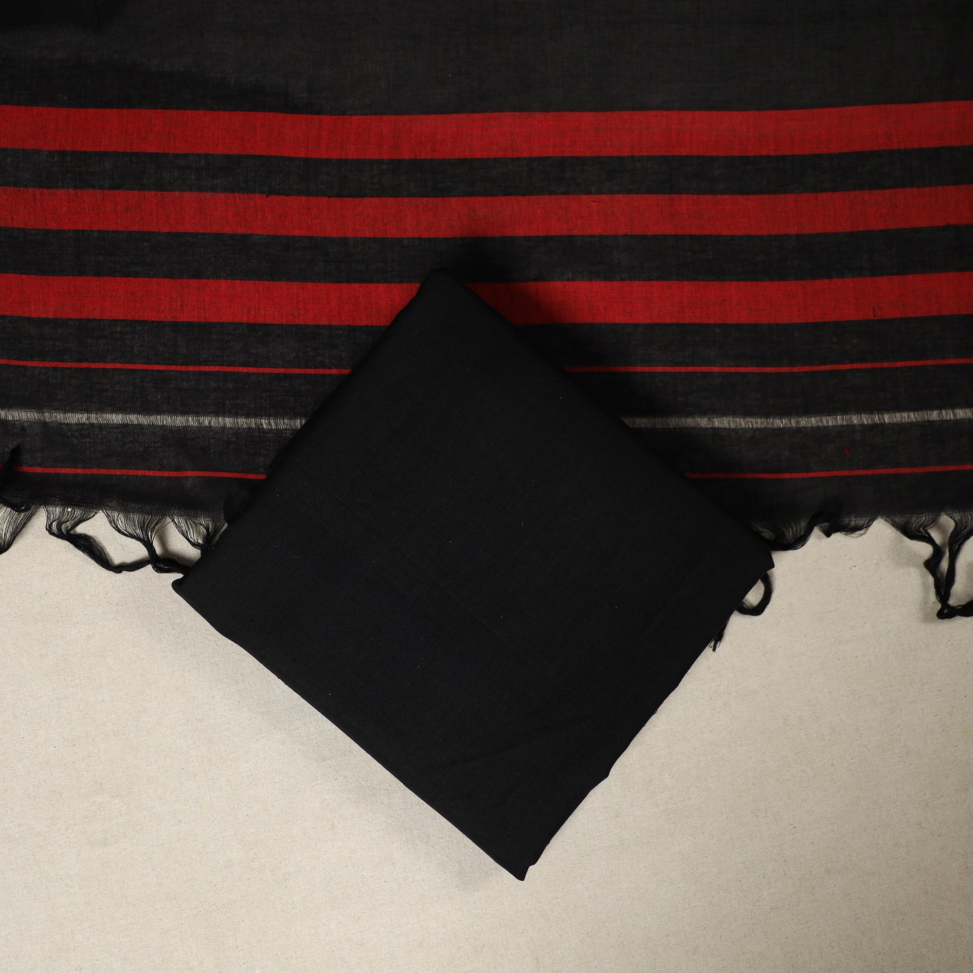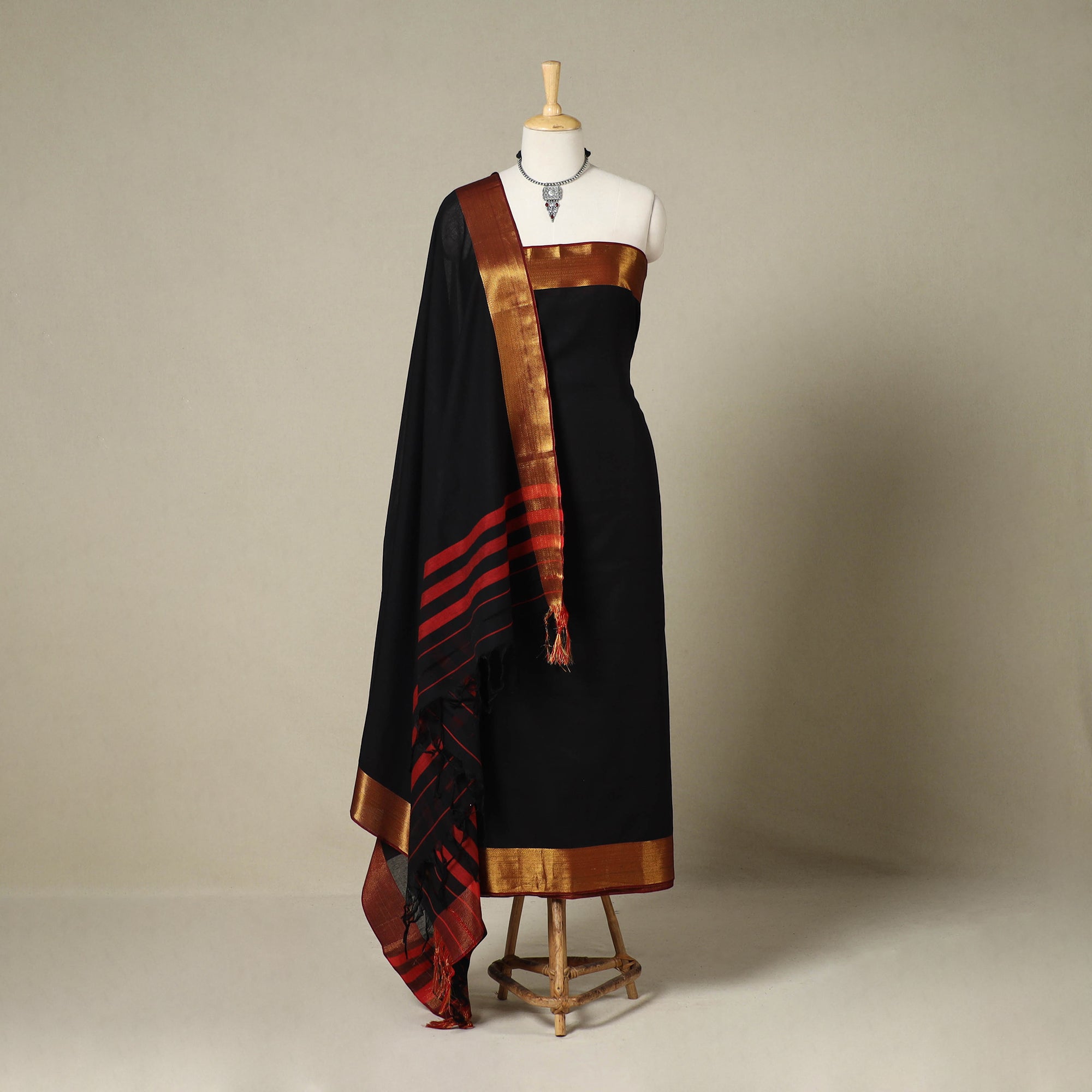 Fine-quality black cotton 3-piece suit material set from Dharwad, Karnataka. This set is a tribute to the rich textile heritage of the region, featuring traditional thread and zari-woven border work that adds a touch of sophistication. The set includes a beautifully crafted kurta piece, a matching bottom/salwar piece, and a coordinating dupatta. Crafted with precision and care, this suit material set offers both style and comfort. Whether you're attending a festive occasion or a casual gathering, this ensemble is sure to make a lasting impression.