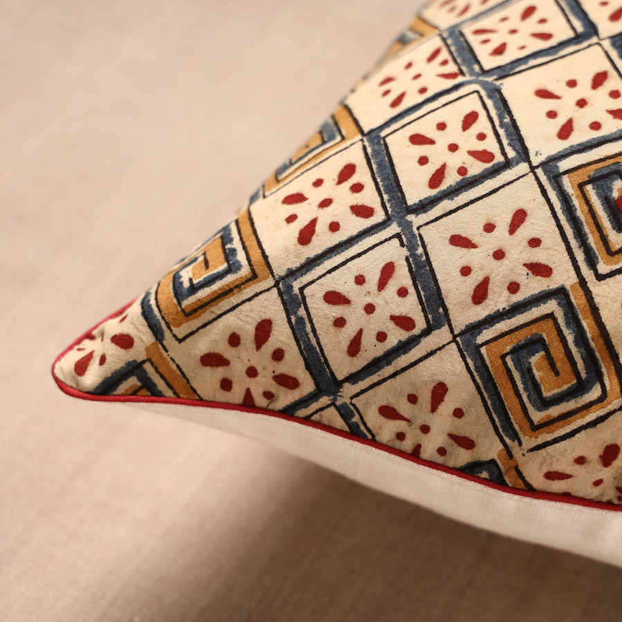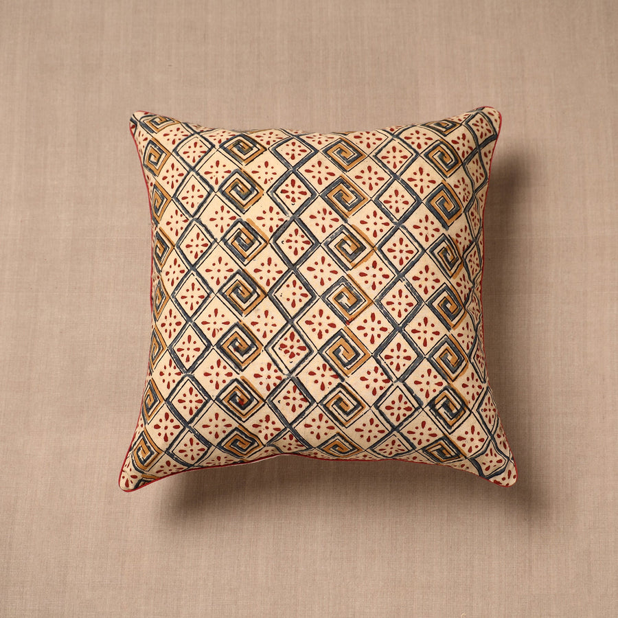 Fine-quality kalamakari hand-block-printed cotton cushion cover. Showcasing an assortment of hand block printed motifs inspired by traditional kalamkari painting. Kalamkari is the earliest and more complex technique of block printing.