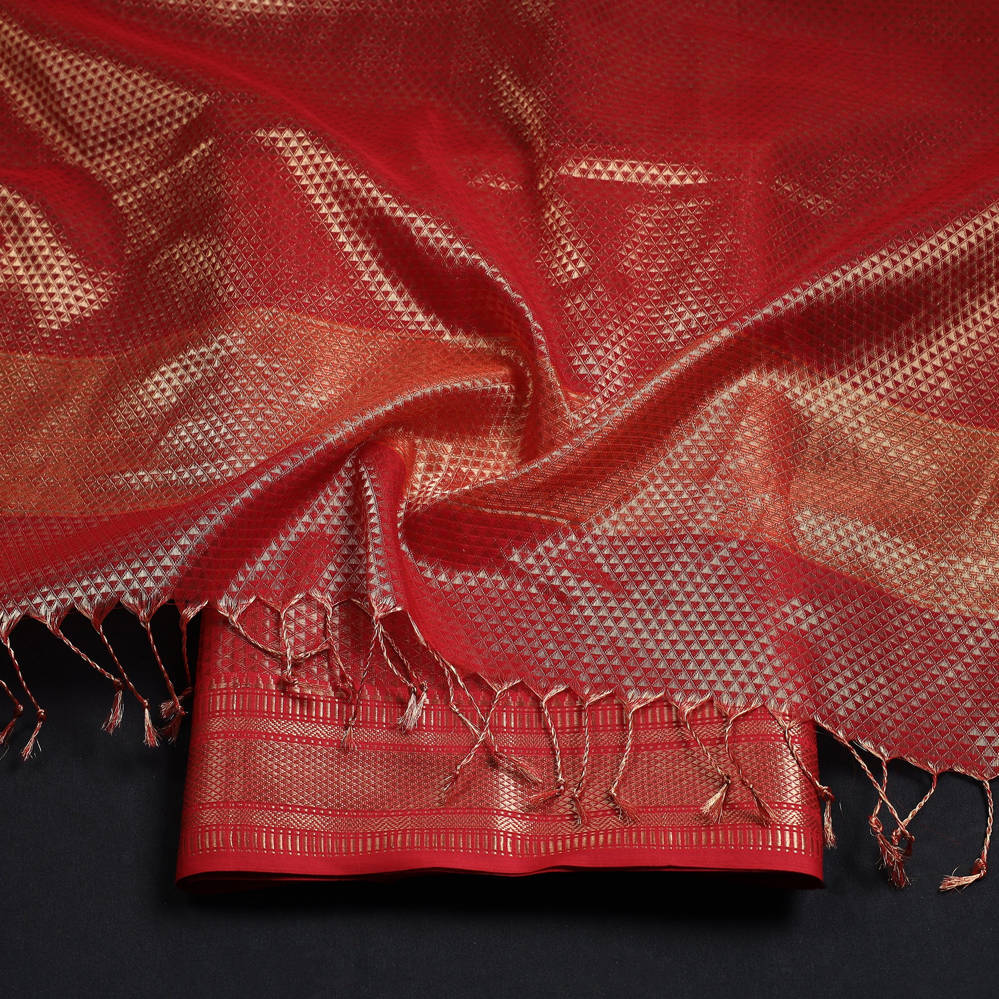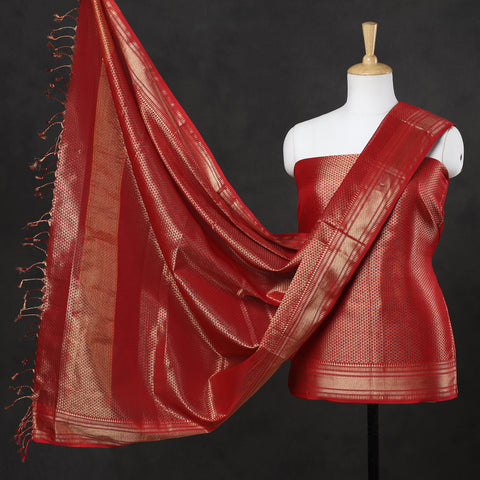 Experience timeless elegance with our traditional red maheshwari heavy tissue zari weave handloom mercerized cotton 2-piece suit material set. This elegant suit is skillfully handwoven by the master artisans of Maheshwar, a heritage town in India, using traditional techniques. The suit boasts a luxurious feel and intricate zari work, adding a touch of sophistication to your wardrobe. Unleash your creativity with this versatile 2-piece suit material set. Express your unique fashion sense by customizing the outfit to suit various occasions, from casual gatherings to festive celebrations.Red