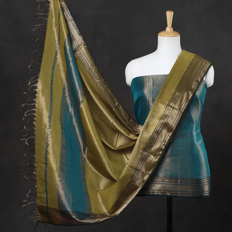 Experience timeless elegance with our traditional blue maheshwari heavy tissue zari weave handloom mercerized cotton 2-piece suit material set. This elegant suit is skillfully handwoven by the master artisans of Maheshwar, a heritage town in India, using traditional techniques. The suit boasts a luxurious feel and intricate zari work, adding a touch of sophistication to your wardrobe. Unleash your creativity with this versatile 2-piece suit material set. Express your unique fashion sense by customizing the outfit to suit various occasions, from casual gatherings to festive celebrations.