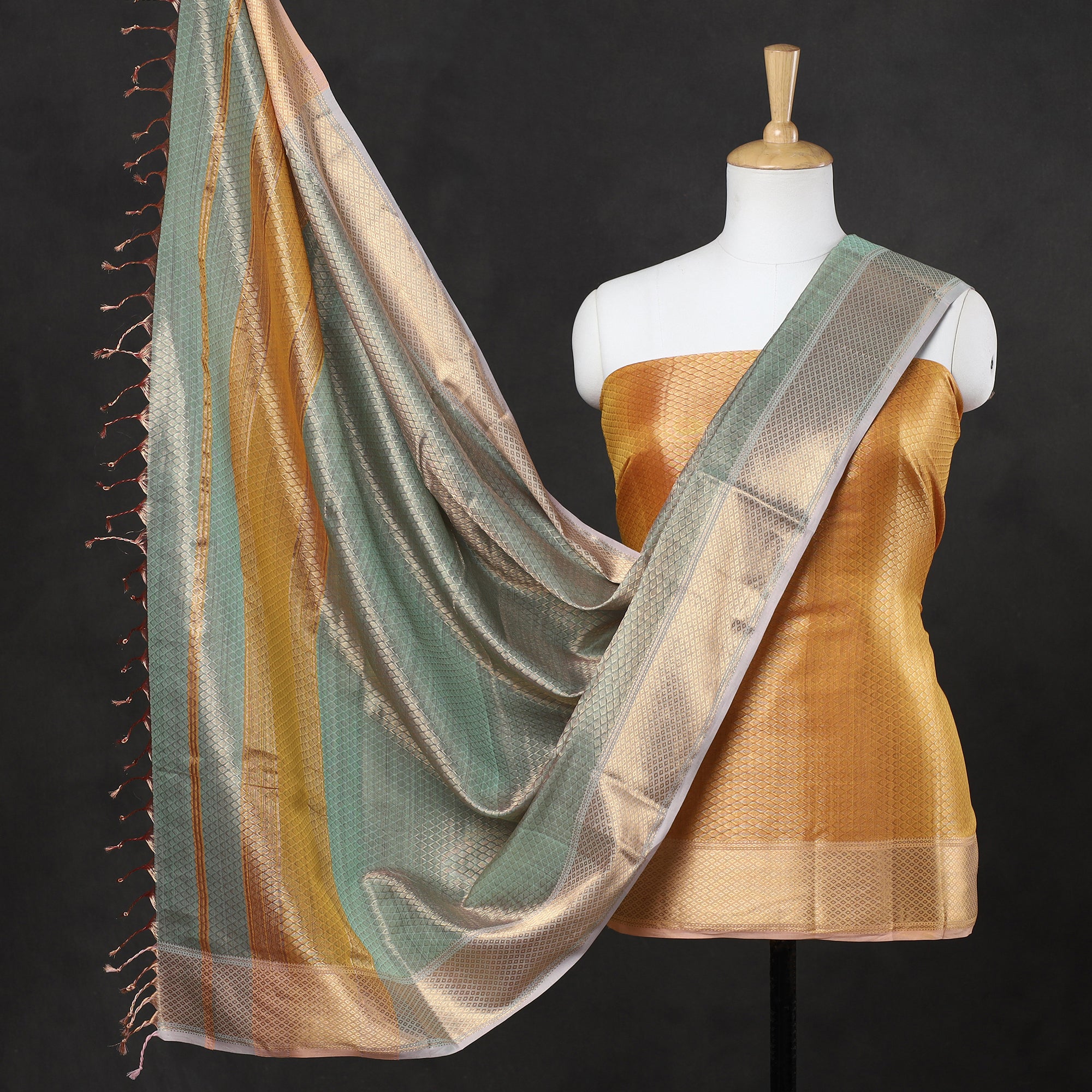 Experience timeless elegance with our traditional yellow maheshwari heavy tissue zari weave handloom mercerized cotton 2-piece suit material set. This elegant suit is skillfully handwoven by the master artisans of Maheshwar, a heritage town in India, using traditional techniques. The suit boasts a luxurious feel and intricate zari work, adding a touch of sophistication to your wardrobe. Unleash your creativity with this versatile 2-piece suit material set. Express your unique fashion sense by customizing the outfit to suit various occasions, from casual gatherings to festive celebrations.