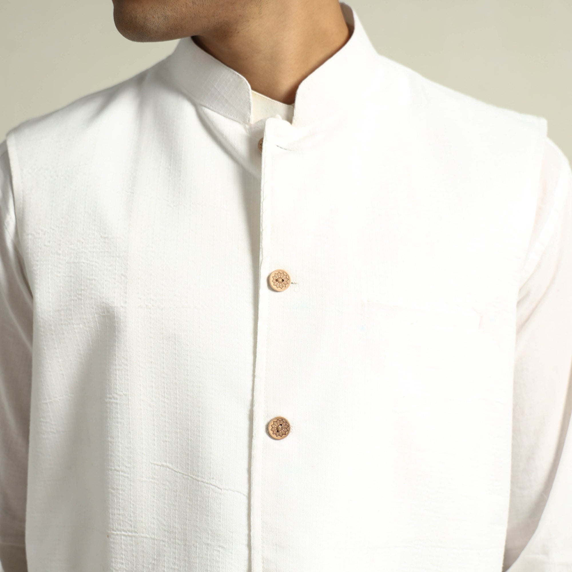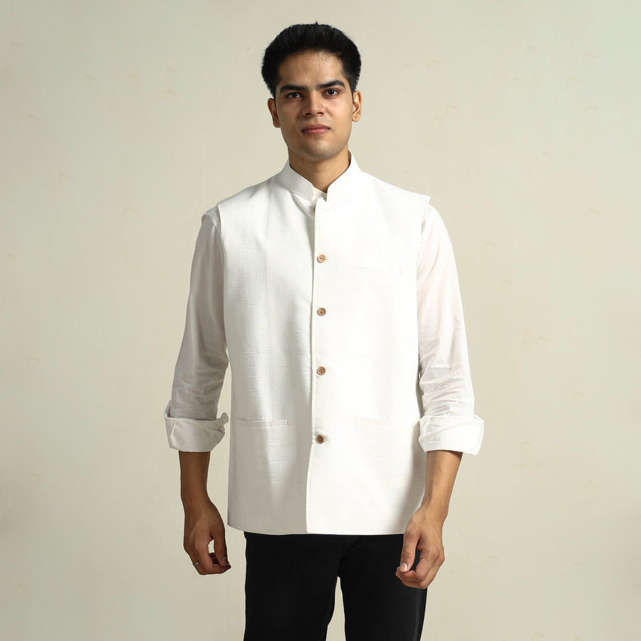 This stylish nehru jacket is made from comfortable plain running stitch cotton fabric. It features a distinctive chinese collar, three outer pockets, a sleeveless design, and a full-button placket. Perfect for dressing up any casual or formal outfit, this uniquely designed cotton nehru jacket is a must-have addition to any fashion-forward wardrobe.