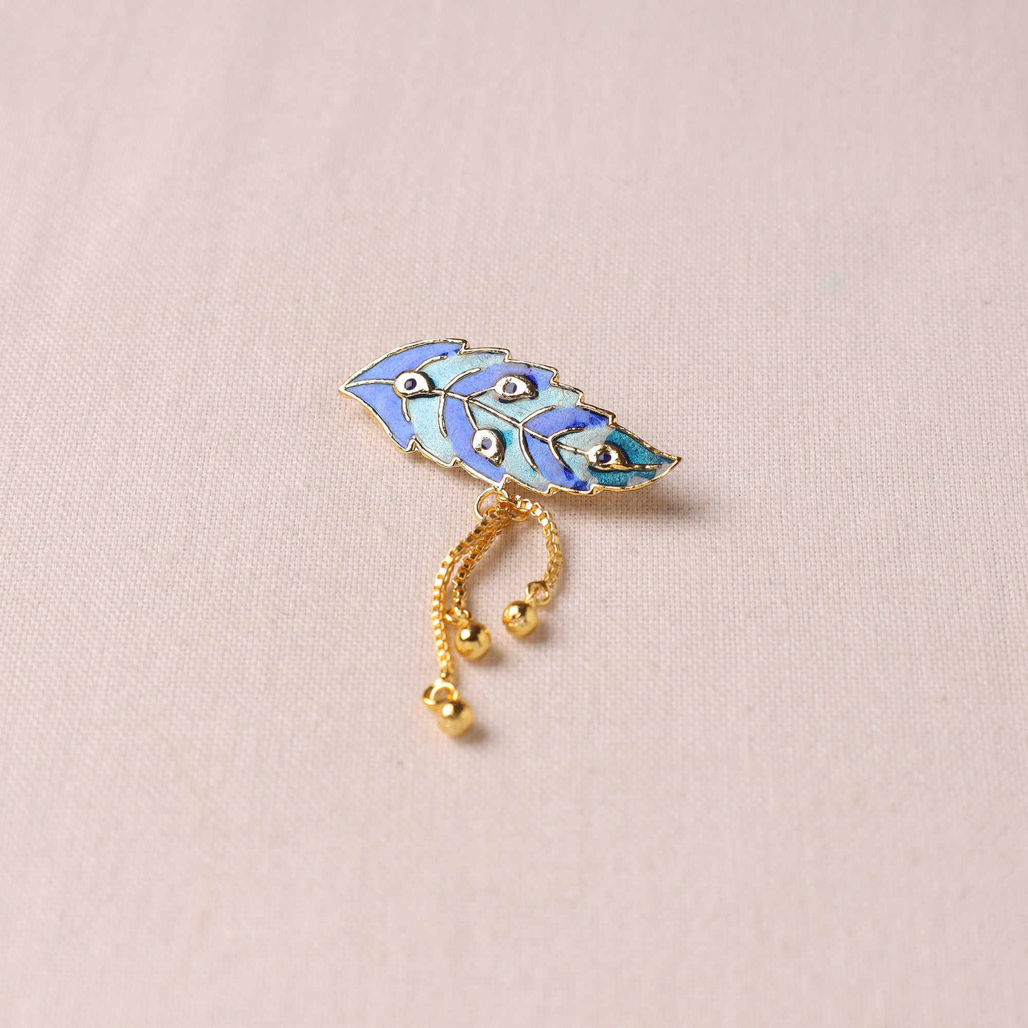 Indulge in the beauty of these hand-crafted treasures and let them become a reflection of your personal style. With their exquisite craftsmanship and attention to detail, Sukhomoy Mukherjee's blue paka meenakari saree pins are a testament to the artistry and skill of the artisans. Embrace the elegance and allure they bring, making a statement with every saree you drape. Meenakari is the art of coloring and ornamenting the surface of metals by fusing over it brilliant colors that are decorated in an intricate design. The Mughals invented the art of enamel or meenawork metal-craft and it was popular with both the Mughals and the Hindu princes of Rajasthan where it was used for creating precious objects and enriching jewellery.