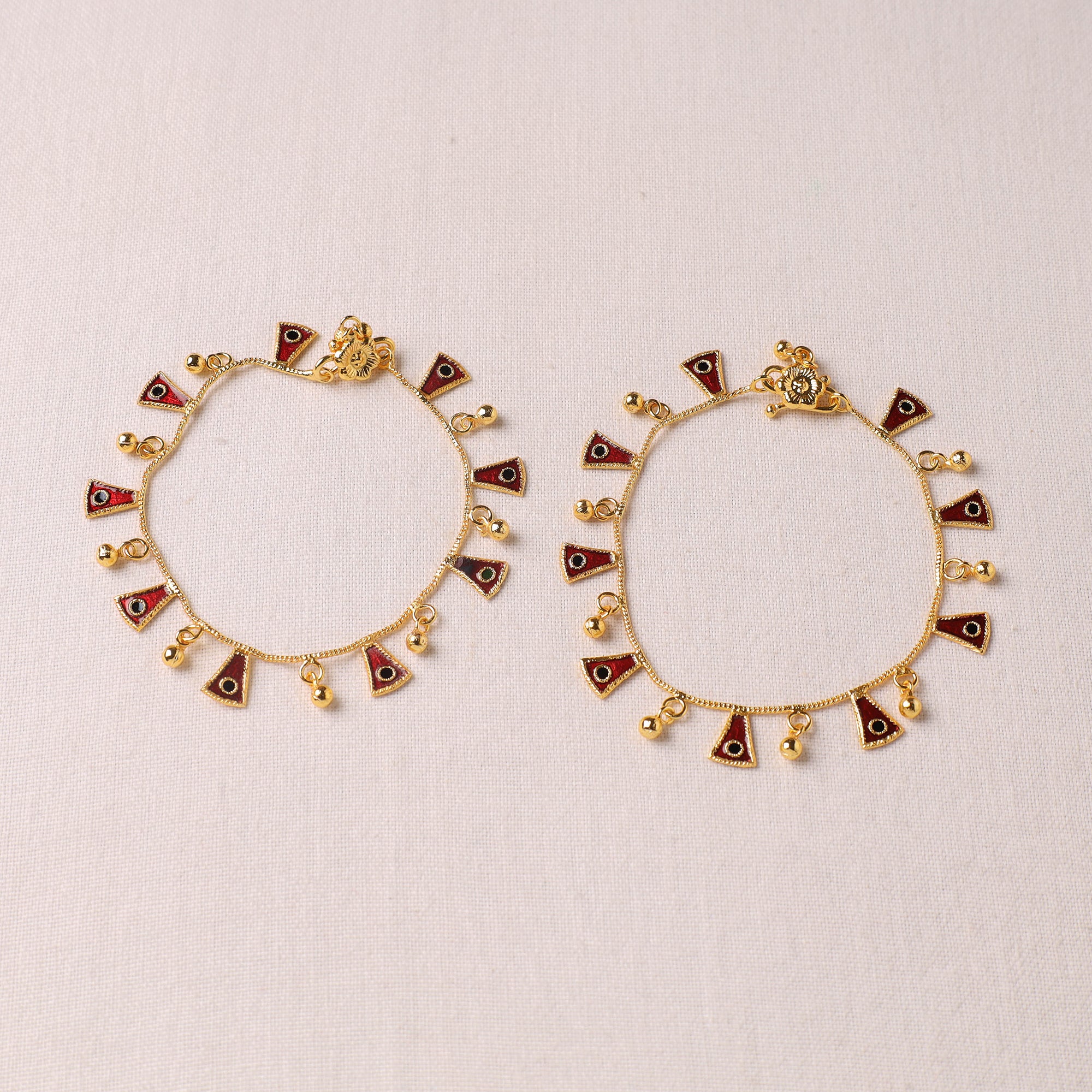Indulge in the beauty of these hand-crafted treasures and let them become a reflection of your personal style. With their exquisite craftsmanship and attention to detail, Sukhomoy Mukherjee's paka meenakari anklet are a testament to the artistry and skill of the artisans. Embrace the elegance and allure they bring, making a statement with every anklet you drape. Meenakari is the art of coloring and ornamenting the surface of metals by fusing over it brilliant colors that are decorated in an intricate design. The Mughals invented the art of enamel or meenawork metal-craft and it was popular with both the Mughals and the Hindu princes of Rajasthan where it was used for creating precious objects and enriching jewellery.