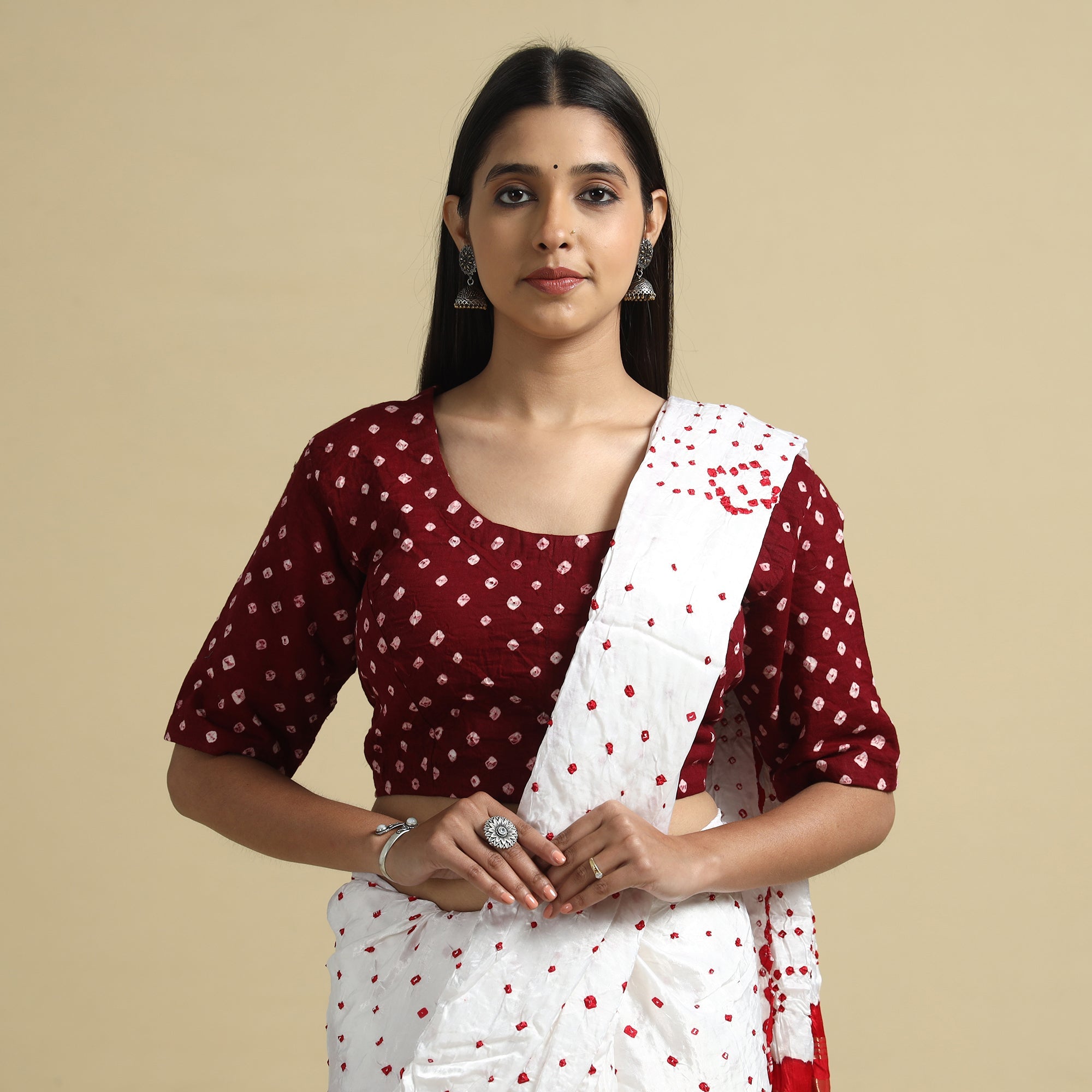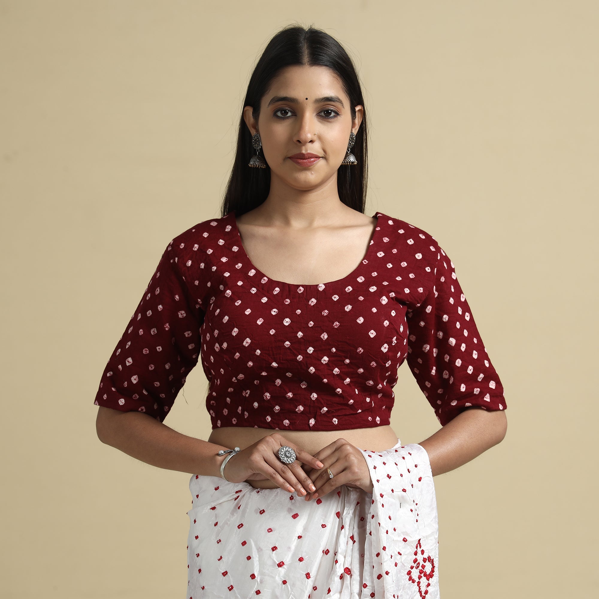 | Material | This bandhani tie-dye blouse is seamlessly stitched with padded comfort for a cozy, stylish, and relaxed fit. It features elegant half sleeves that provide balanced coverage, making it perfect for any occasion. The hook locks on the back add convenience. Its standout features include exquisite design and premium craftsmanship, making it a must-have addition to your wardrobe. |