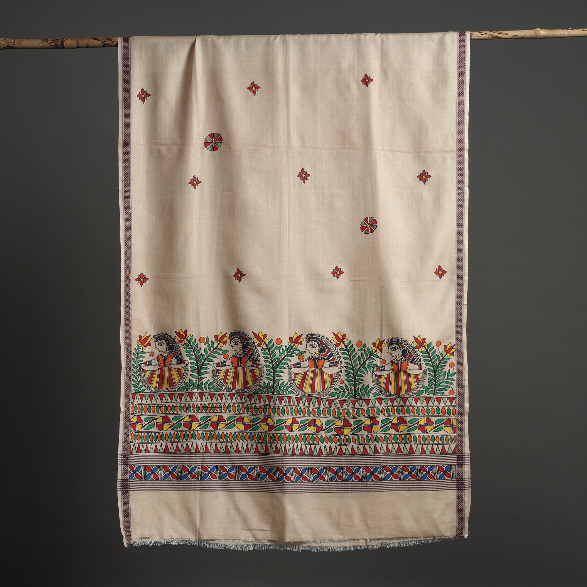 Enhance your style with this artistic and beautiful beige madhubani handpainted tussar cotton handloom dobby border dupatta with tassels. This dupatta is made from a blend of tussar silk and cotton, combining the lustrous sheen of silk with the comfortable feel of cotton. This dupatta is skillfully handpainted with intricate madhubani artwork by master artisan Hira Devi from Bihar, showcasing the rich cultural heritage of the region. Madhubani - Mithila painting (also called Madhubani art or Mithila painting) is practiced in the Mithila region of India. Painting is done with fingers, twigs, brushes, nib pens, and matchsticks, using fabric colors, and is characterized by eye-catching geometrical patterns.