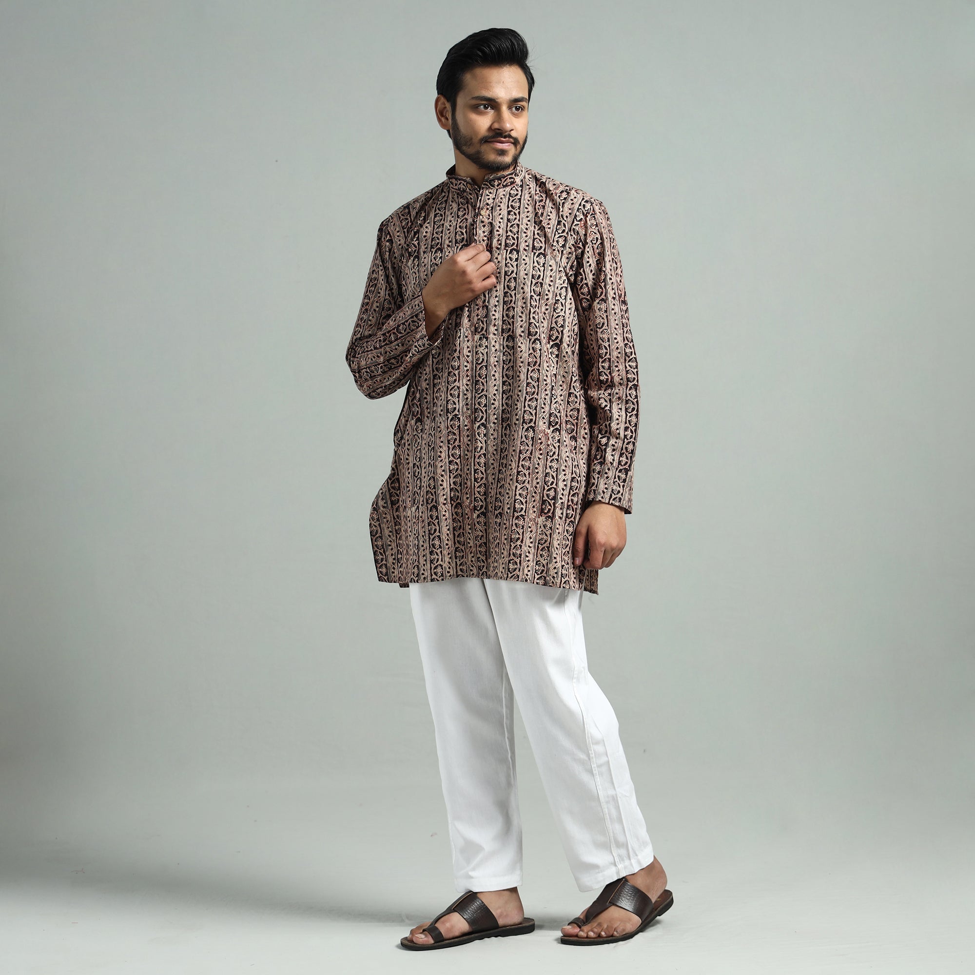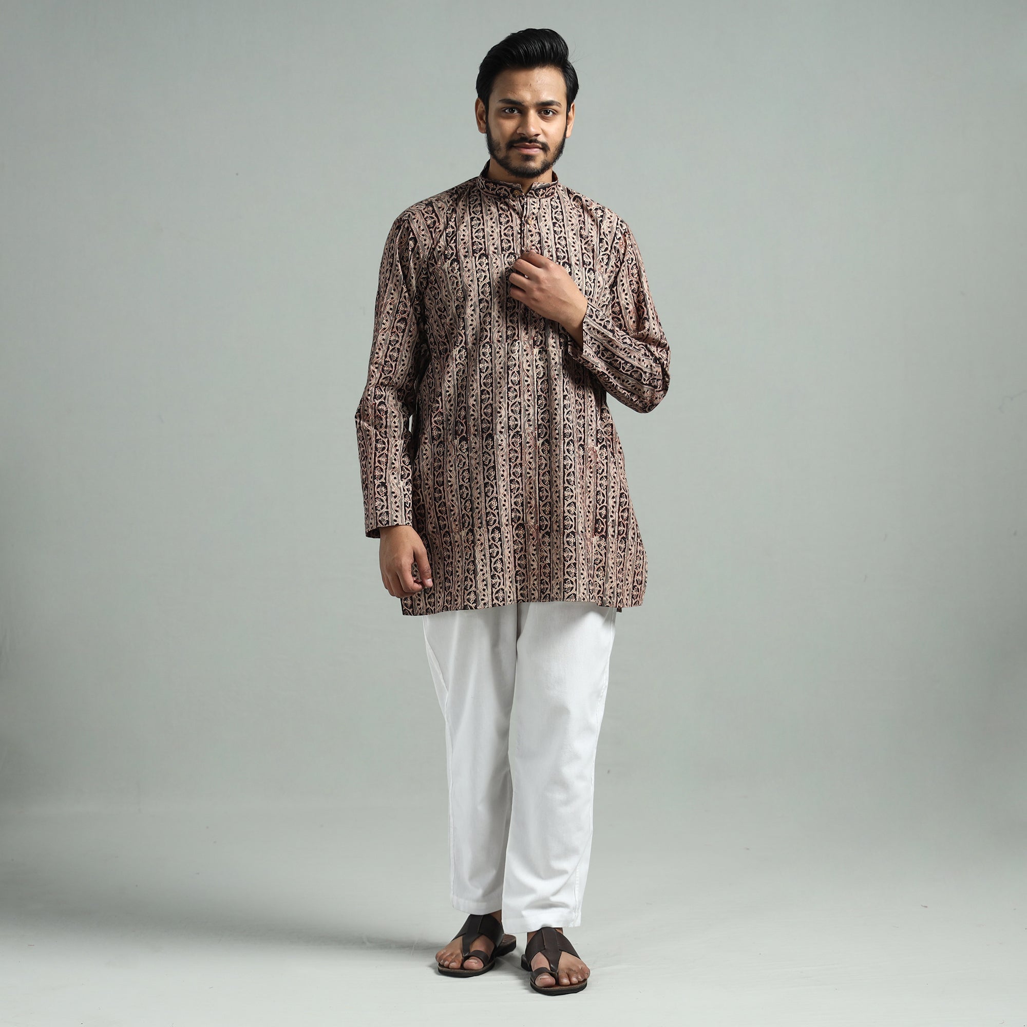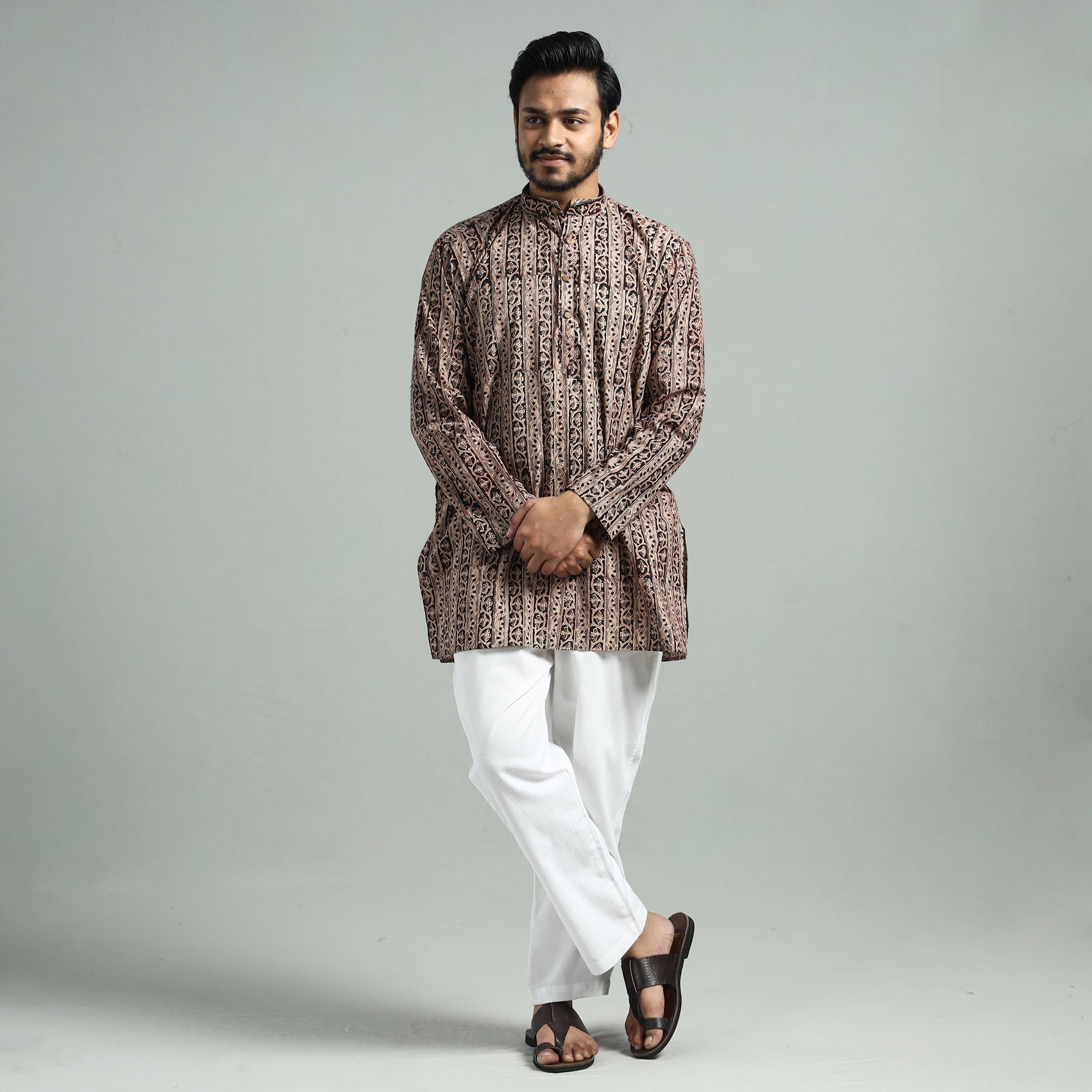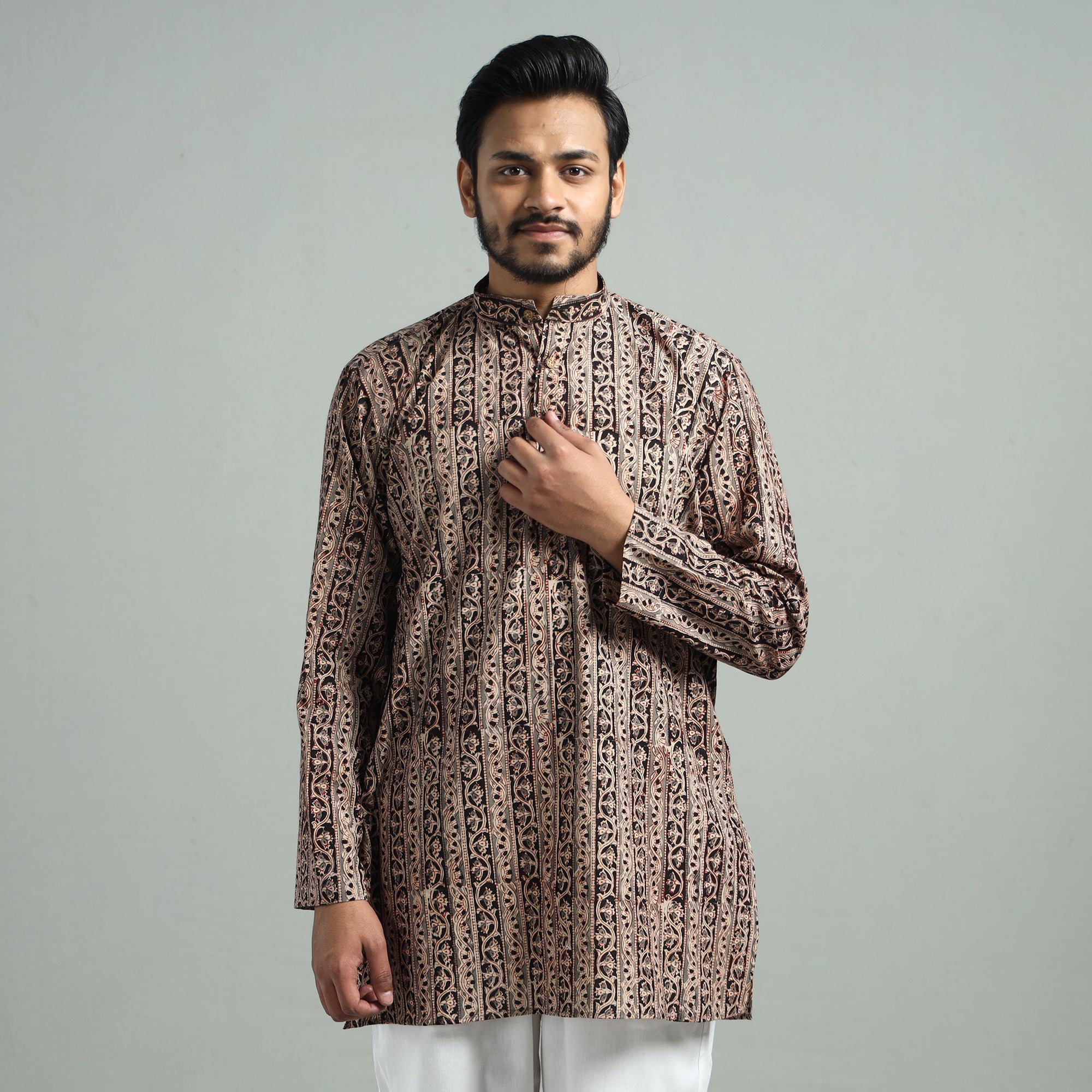 This traditional kalamkari hand block printed men short kurta is made using naturally dyed cotton fabric. The naturally dyed fabric ensures a breathable and soft feel, providing the utmost comfort for all-day wear. Each kurta is a masterpiece, handcrafted by skilled artisans using the age-old technique of hand block Kalamkari printing. The kurta boasts a Chinese collar, full sleeves, a front button placket, and crisp wooden buttons. The intricate details include a patch pocket on the front, adding both functionality and charm to your wardrobe. This kurta is perfect for your daily outings and casual occasions.