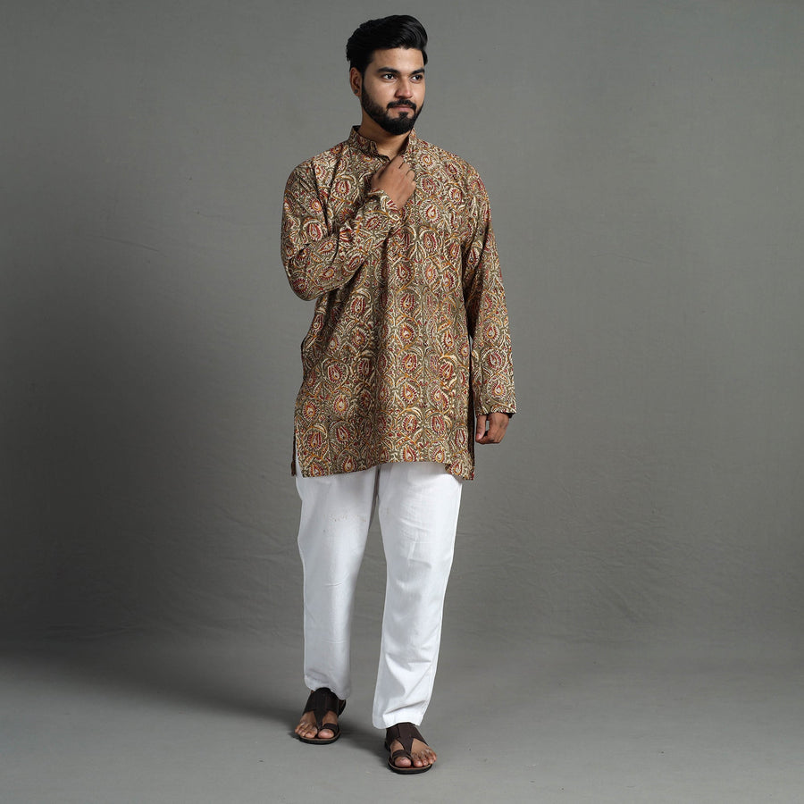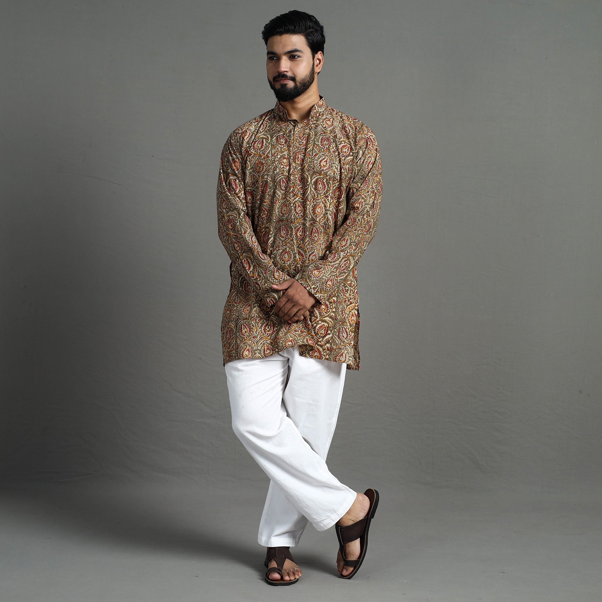 This traditional kalamkari hand block printed men short kurta is made using naturally dyed cotton fabric. The naturally dyed fabric ensures a breathable and soft feel, providing the utmost comfort for all-day wear. Each kurta is a masterpiece, handcrafted by skilled artisans using the age-old technique of hand block Kalamkari printing. The kurta boasts a Chinese collar, full sleeves, a front button placket, and crisp wooden buttons. The intricate details include a patch pocket on the front, adding both functionality and charm to your wardrobe. This kurta is perfect for your daily outings and casual occasions.