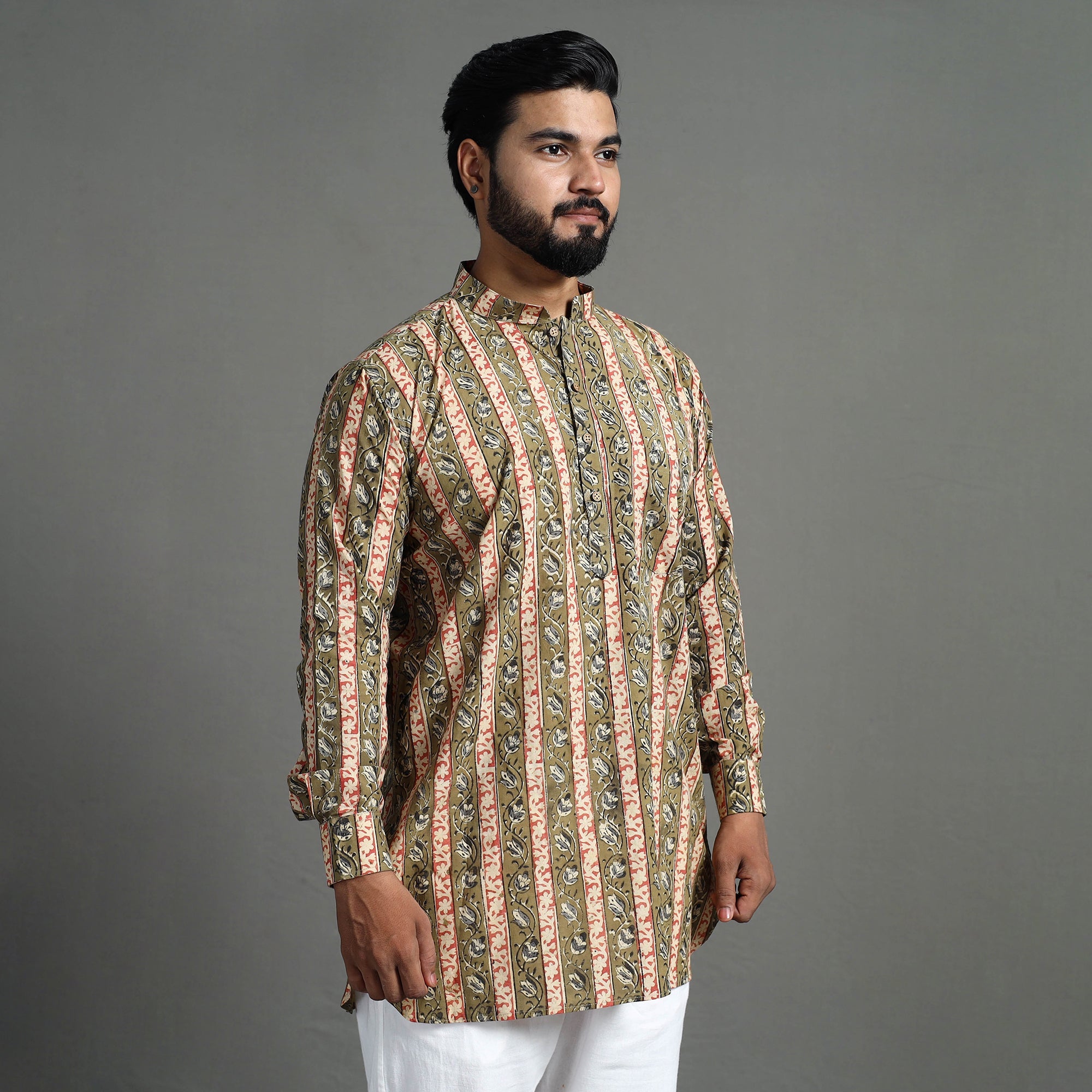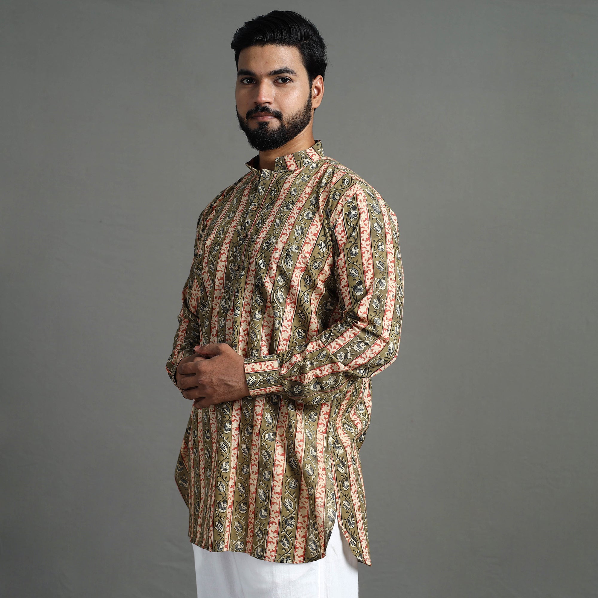 This traditional kalamkari hand block printed men short kurta is made using naturally dyed cotton fabric. The naturally dyed fabric ensures a breathable and soft feel, providing the utmost comfort for all-day wear. Each kurta is a masterpiece, handcrafted by skilled artisans using the age-old technique of hand block Kalamkari printing. The kurta boasts a Chinese collar, full sleeves, a front button placket, and crisp wooden buttons. The intricate details include a patch pocket on the front, adding both functionality and charm to your wardrobe. This kurta is perfect for your daily outings and casual occasions.