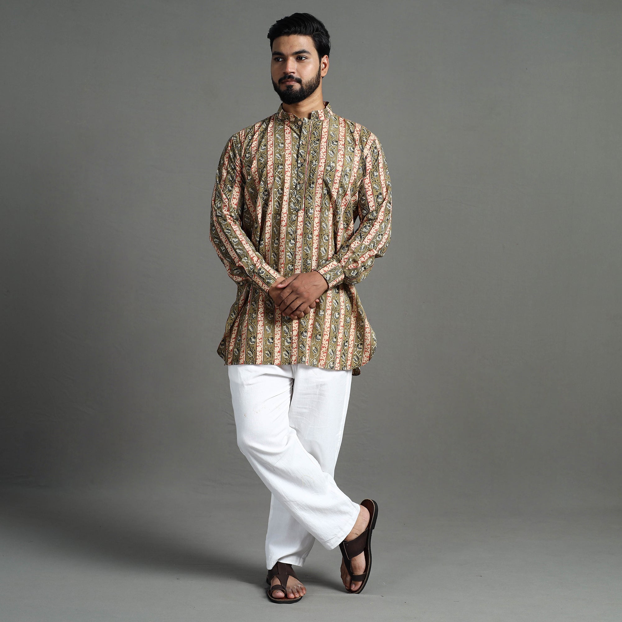 Get the kurta look by adding a modern twist of skinny jeans or chinos, white sneakers or leather sandals to matching bottoms and a watch. You can even remove sunglasses or wide-framed glasses with this look.