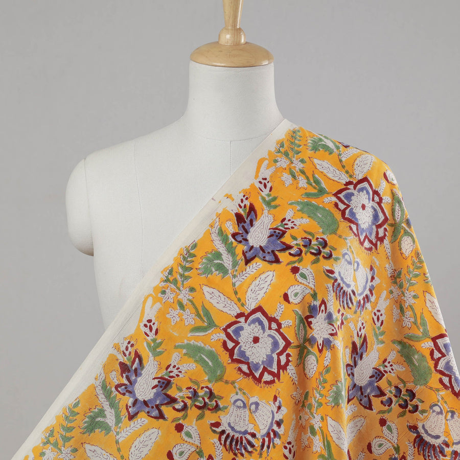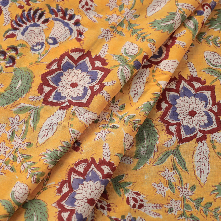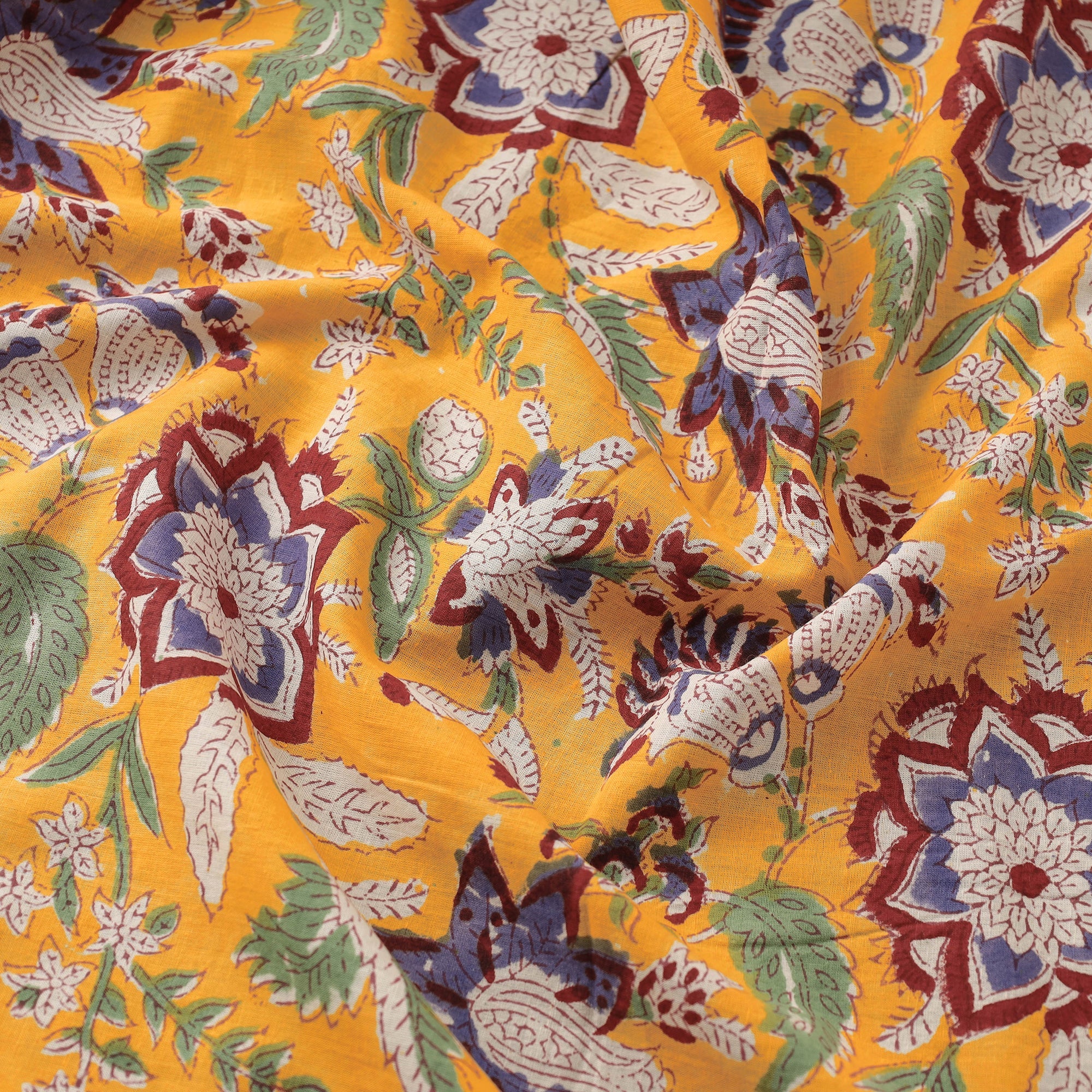 Experience the rich heritage of turmeric yellow floral sanganeri hand block prints with this fine quality cotton fabric. Originating from Rajasthan, this technique is known for its intricate designs and vibrant colors. This fabric is dyed with bleed-free VAT dyes, ensuring lasting beauty. Perfect for creating unique clothing and home decor pieces.