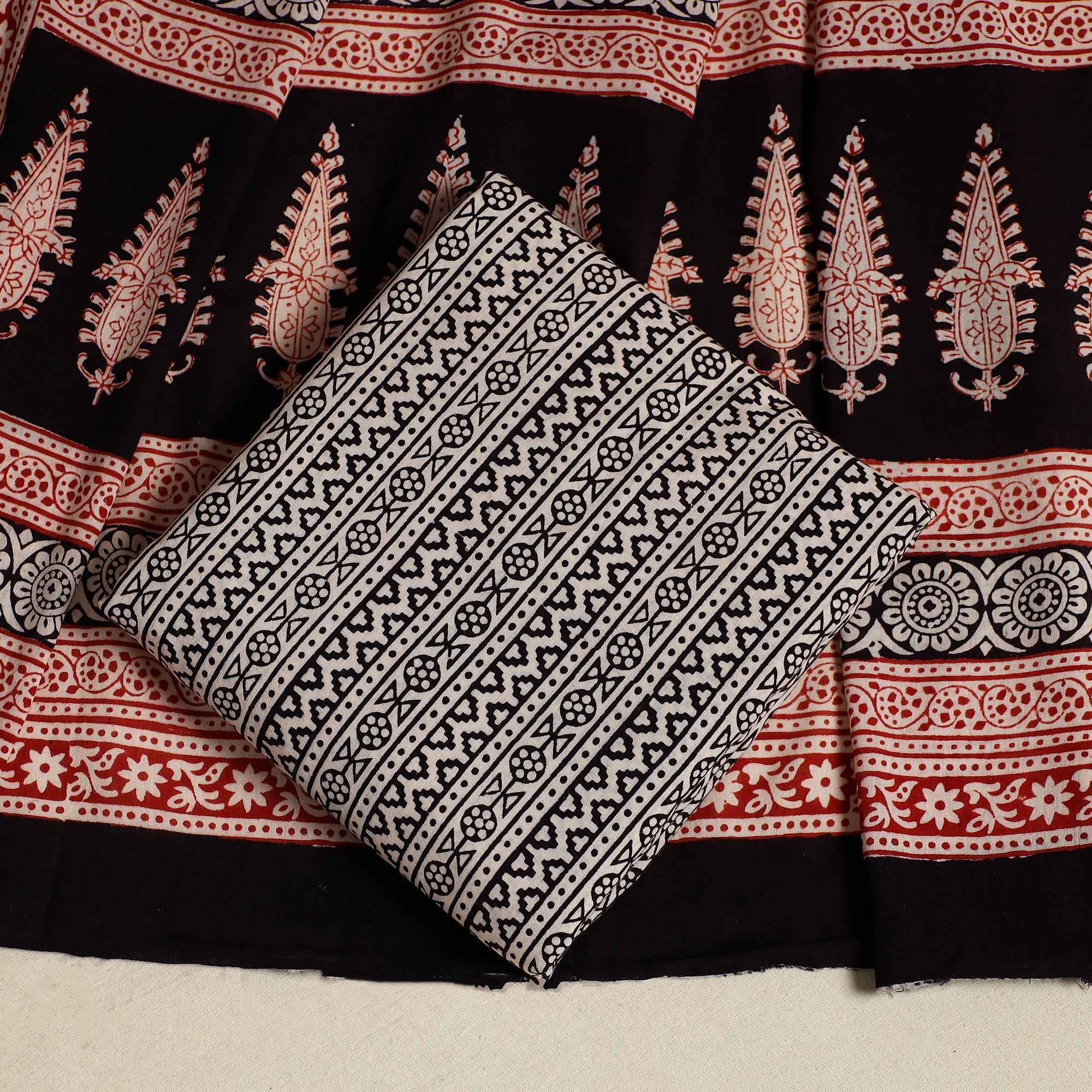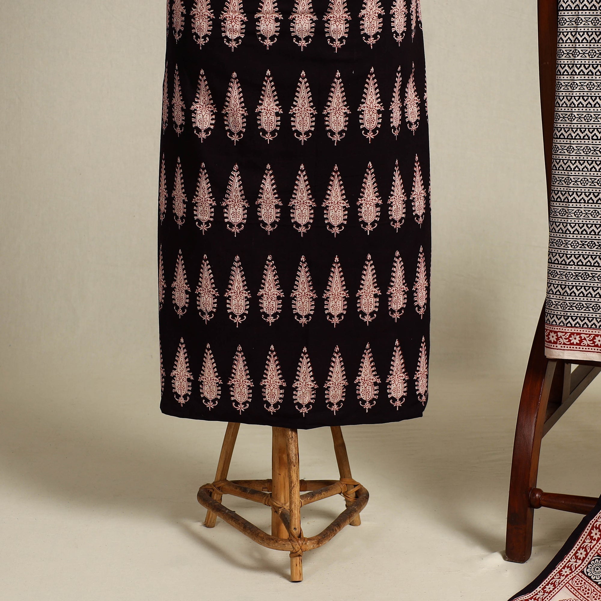 This finest quality black bagh hand block printed cotton 3-piece suit material with mul cotton dupatta is made using natural dyes through traditional processes by master artisan Umar Faruk Khatri, practiced in Bagh, the Dhar district of Madhya Pradesh. The suit material ensures supreme comfort, its soft and breathable cotton, making it ideal for all-day wear. The use of natural dyes enhances its eco-friendliness and lends a unique charm to each piece. Embrace the elegance of this ensemble at various occasions, from casual outings to festive gatherings.