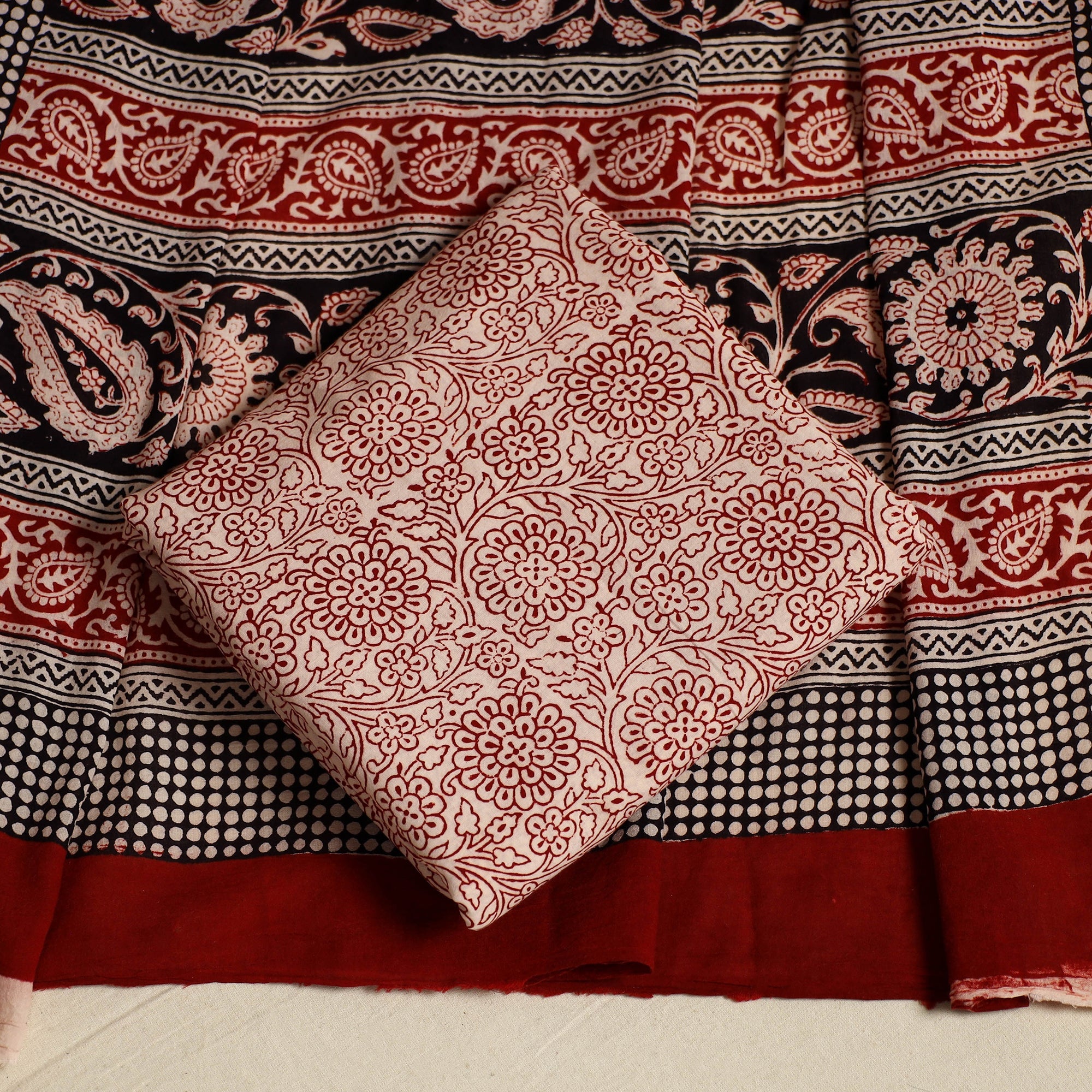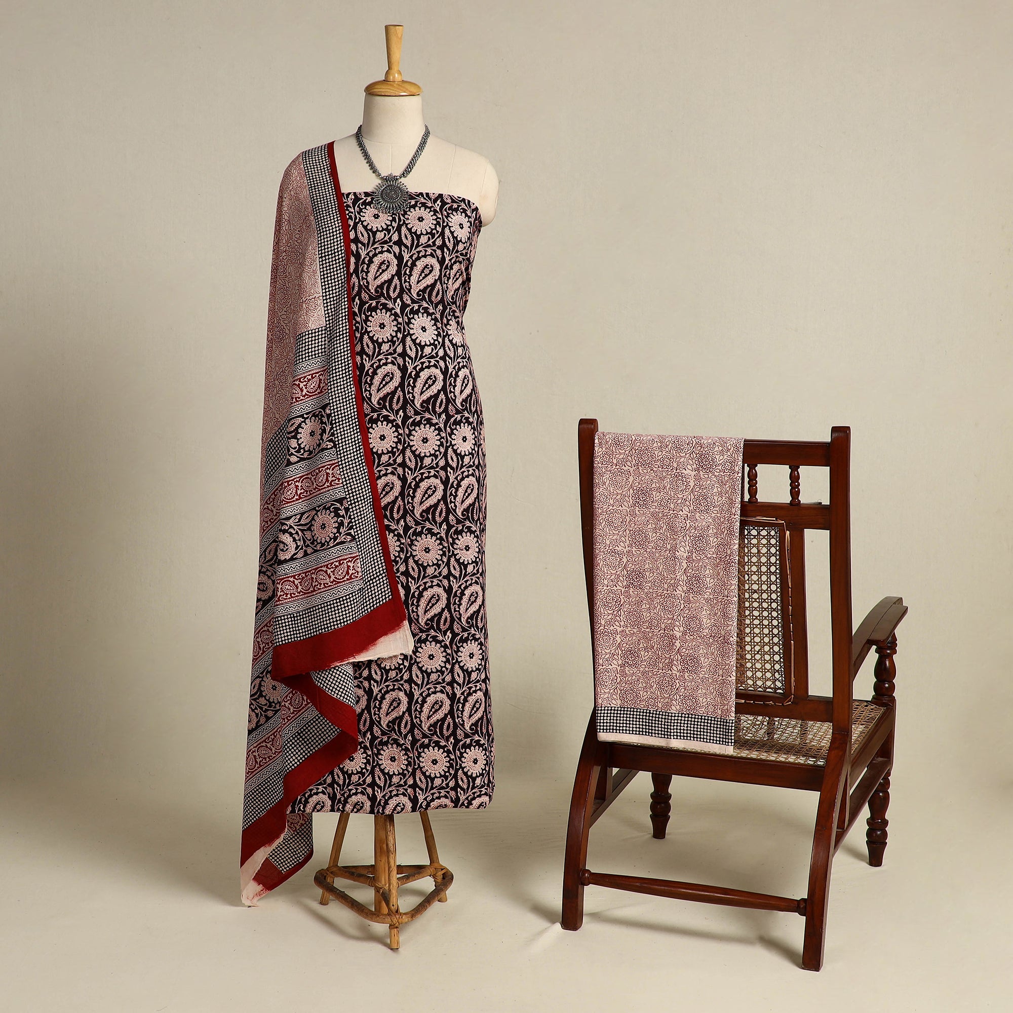 This finest quality black bagh hand block printed cotton 3-piece suit material with mul cotton dupatta is made using natural dyes through traditional processes by master artisan Umar Faruk Khatri, practiced in Bagh, the Dhar district of Madhya Pradesh. The suit material ensures supreme comfort, its soft and breathable cotton, making it ideal for all-day wear. The use of natural dyes enhances its eco-friendliness and lends a unique charm to each piece. Embrace the elegance of this ensemble at various occasions, from casual outings to festive gatherings.