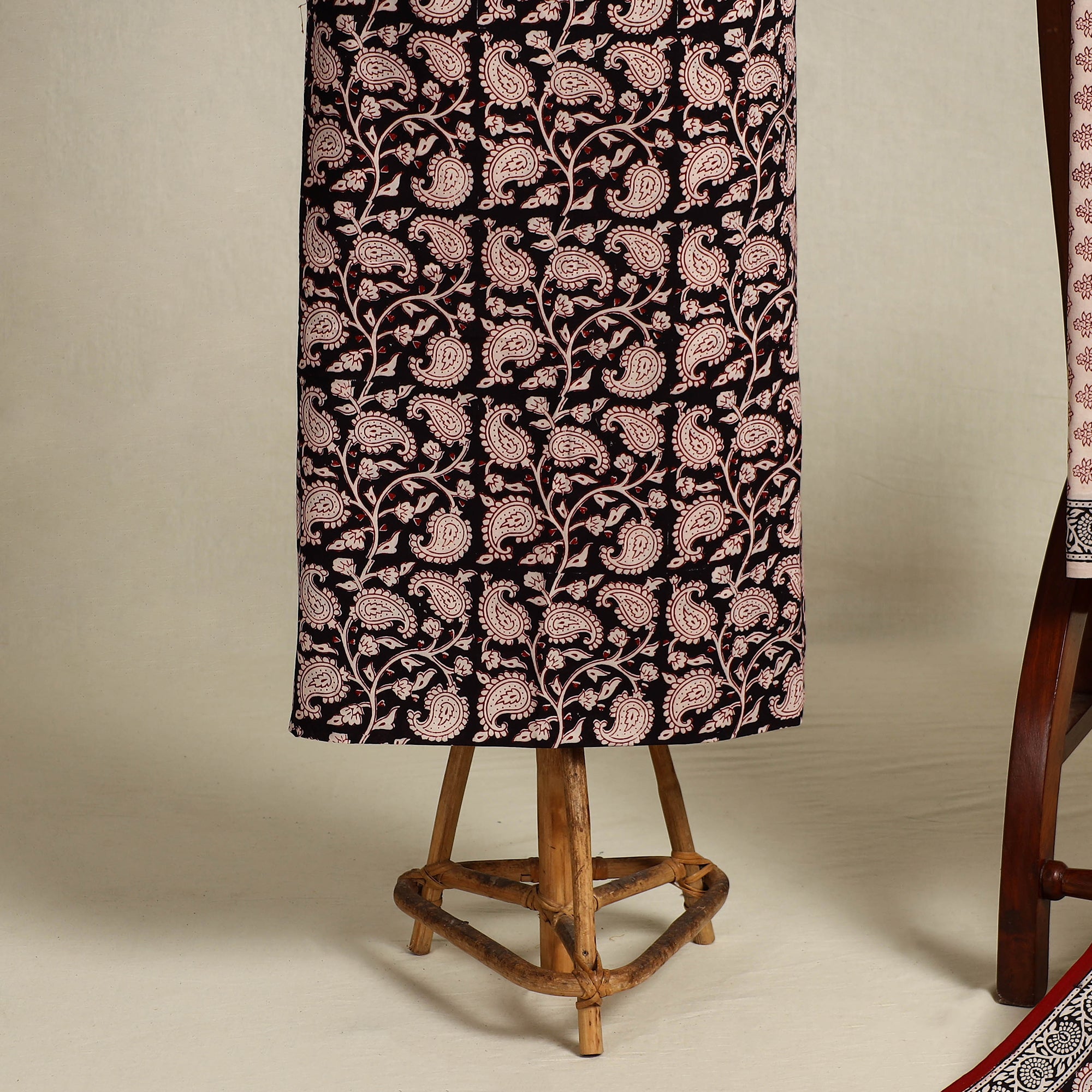 This finest quality black bagh hand block printed cotton 3-piece suit material with mul cotton dupatta is made using natural dyes through traditional processes by master artisan Umar Faruk Khatri, practiced in Bagh, the Dhar district of Madhya Pradesh. The suit material ensures supreme comfort, its soft and breathable cotton, making it ideal for all-day wear. The use of natural dyes enhances its eco-friendliness and lends a unique charm to each piece. Embrace the elegance of this ensemble at various occasions, from casual outings to festive gatherings.
