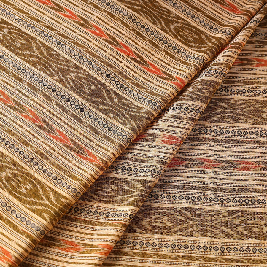 Fine-quality sambalpuri ikat weaving cotton fabric from Odisha with traditional motifs like shankha (shell), chakra (wheel), and phula (flower) by master artisans from the eastern states of India. Ikat (Ikkat) is a dyeing technique used to pattern textiles that employs a resist dyeing process similar to tie-dye on either the warp or weft fibers prior to dyeing. Ikat has lovely patterns and is world-famous for its extremely beautiful colors, textures, and designs. Indian Ikat is always admired by fashion designers around the world.