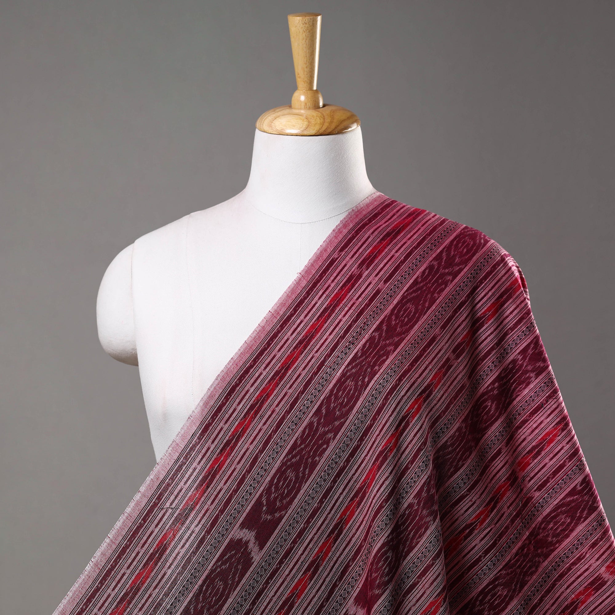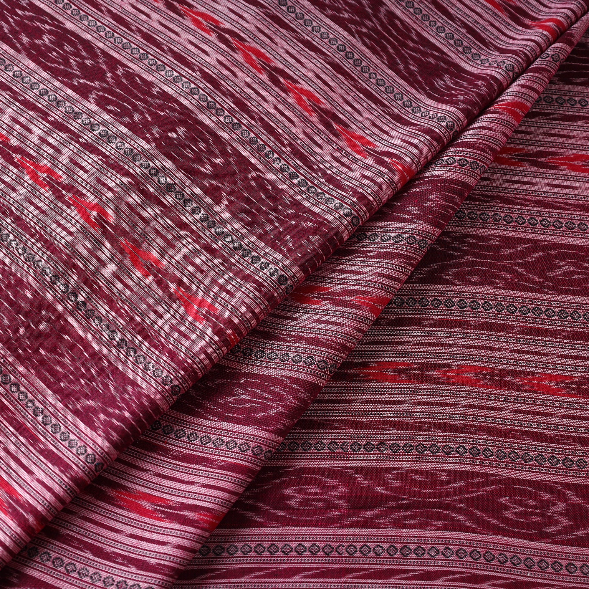 Fine-quality sambalpuri ikat weaving cotton fabric from Odisha with traditional motifs like shankha (shell), chakra (wheel), and phula (flower) by master artisans from the eastern states of India. Ikat (Ikkat) is a dyeing technique used to pattern textiles that employs a resist dyeing process similar to tie-dye on either the warp or weft fibers prior to dyeing. Ikat has lovely patterns and is world-famous for its extremely beautiful colors, textures, and designs. Indian Ikat is always admired by fashion designers around the world.