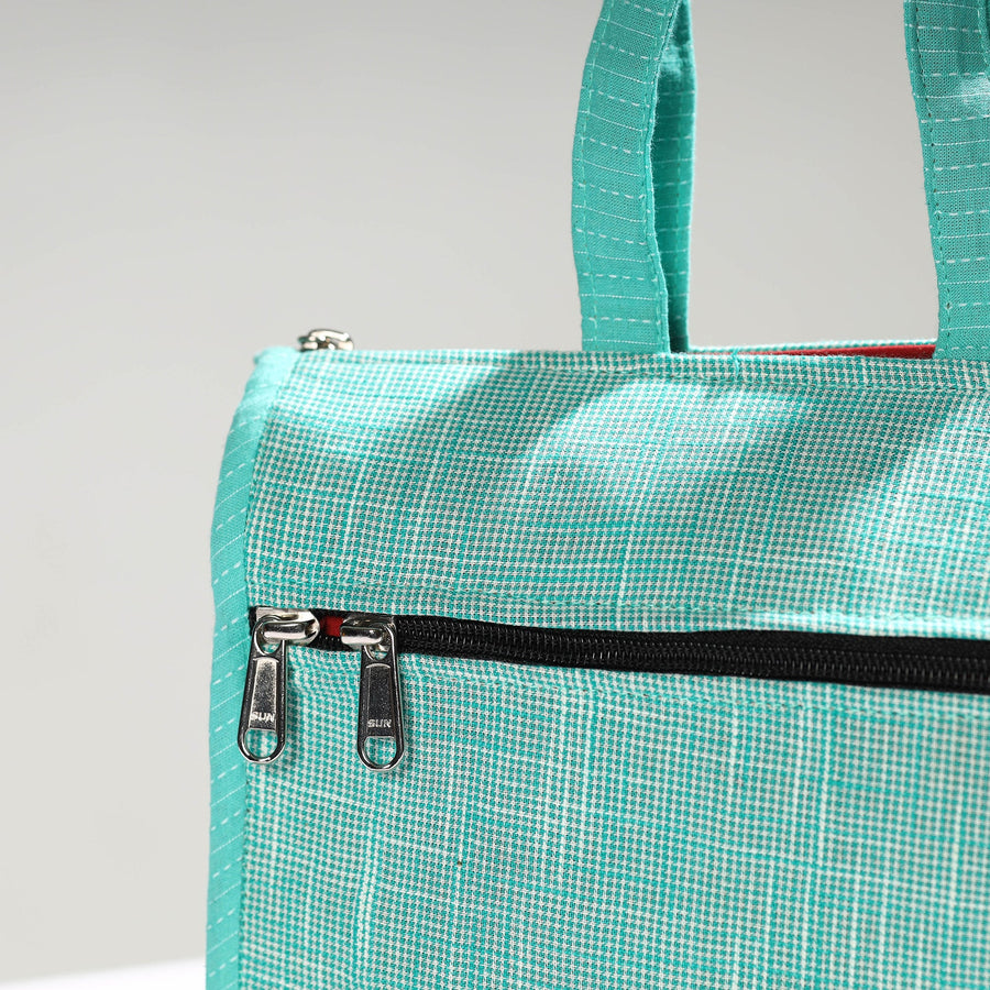 Experience timeless beauty with our green handcrafted jacquard cotton hand bag. The carefully crafted, intricate jacquard pattern exudes sophistication. Perfect for daily use, it offers ample space for essentials, as well as an internal zipped pocket and a convenient front pocket, which makes it a stylish and functional accessory.
