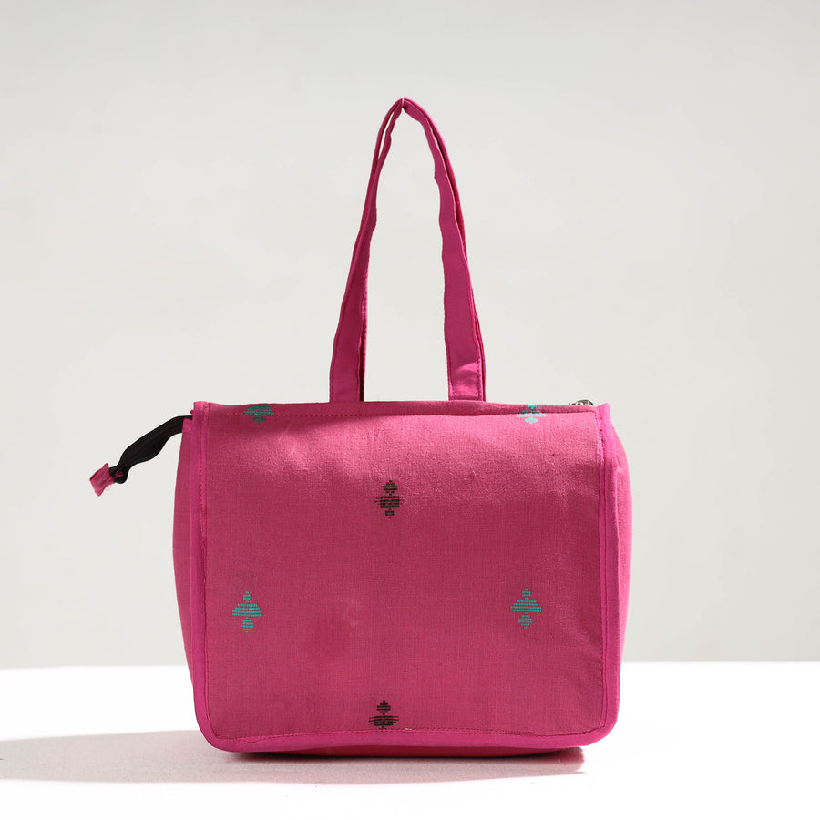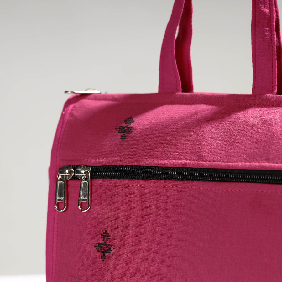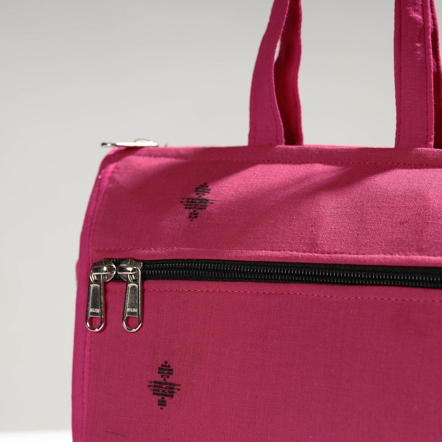 Experience timeless beauty with our handcrafted pink jacquard cotton hand bag. The carefully crafted, intricate jacquard pattern exudes sophistication. Perfect for daily use, it offers ample space for essentials, as well as an internal zipped pocket and a convenient front pocket, which makes it a stylish and functional accessory.