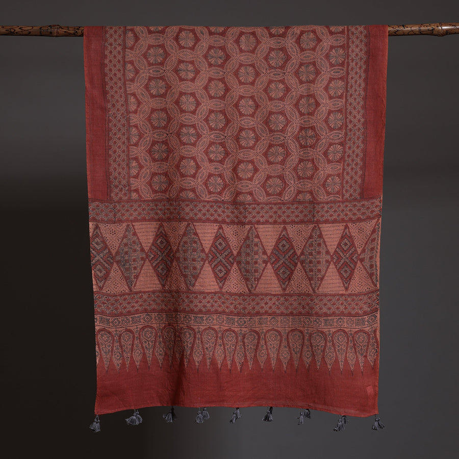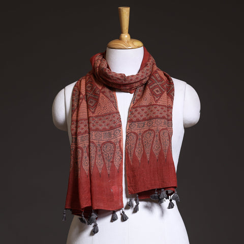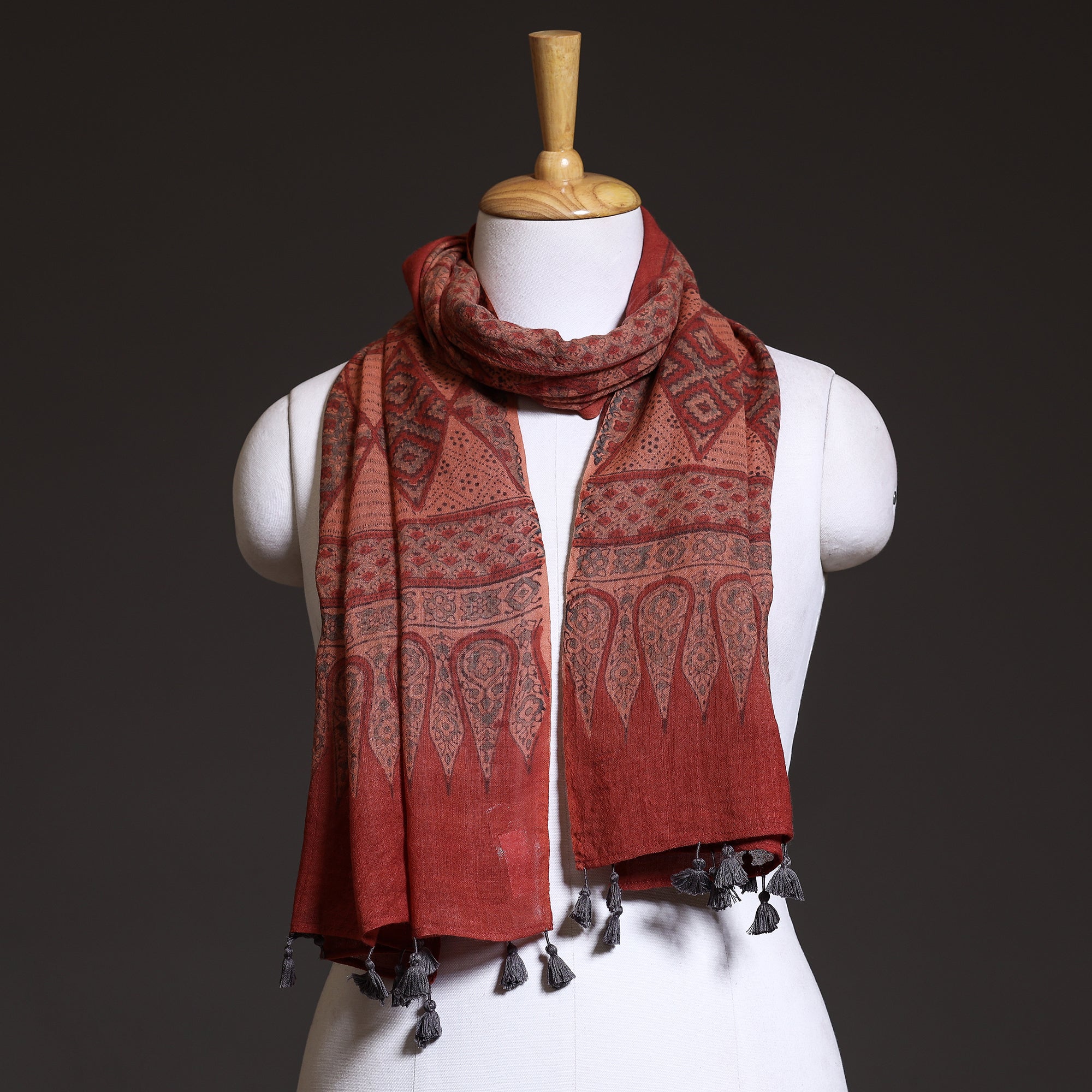 Elevate your style with this fine-quality red ajrakh hand-block-printed pure wool stole. This stole is made using natural dyes through the traditional techniques of hand block printing by the master artisan of Sufiyan Ismail Khatri, from the Kutch region of Gujarat. The pure wool construction offers exceptional warmth and softness, making it perfect for cold weather. This stole can elevate any outfit. It's versatile and suitable for both formal and casual occasions, adding a touch of traditional Indian artistry to your style.