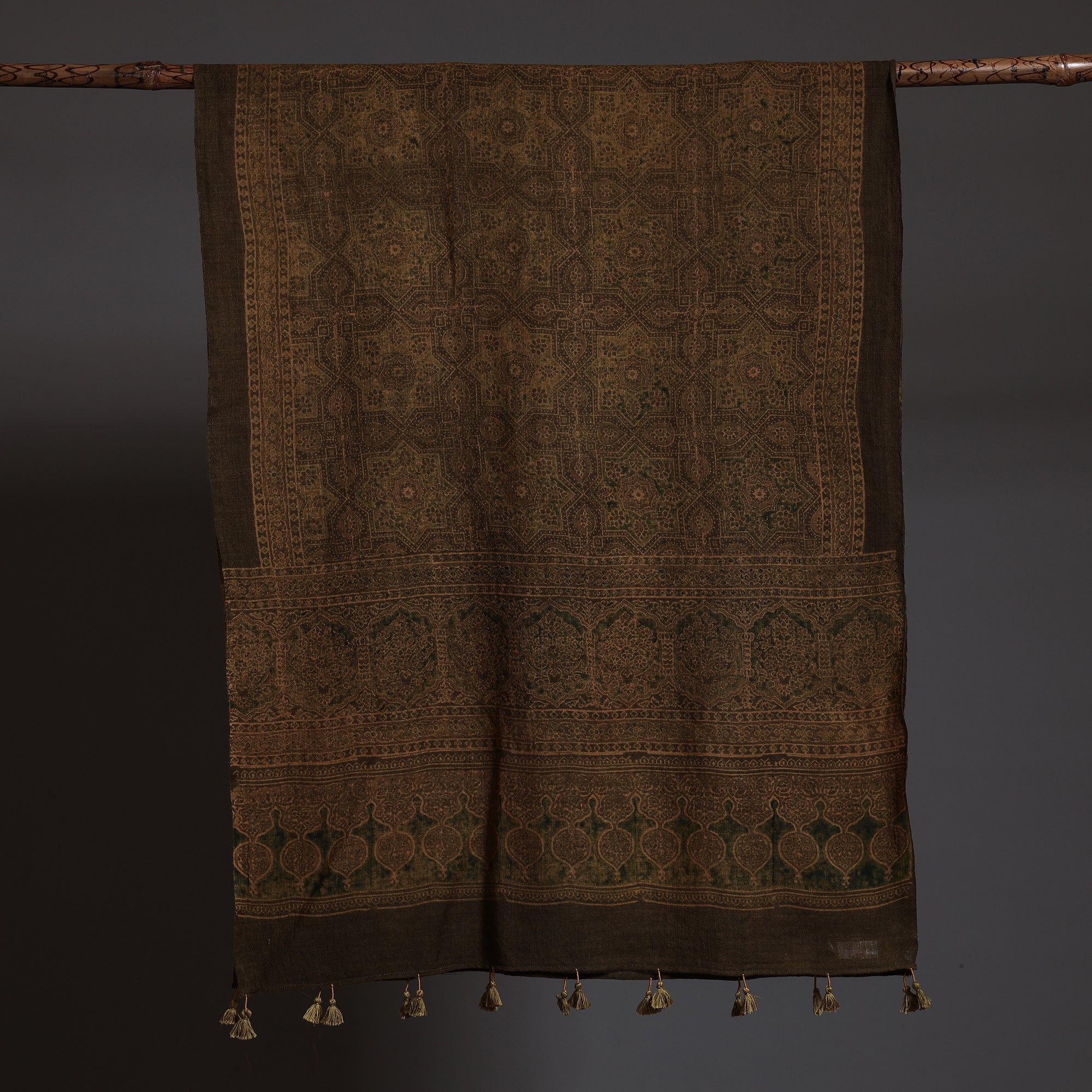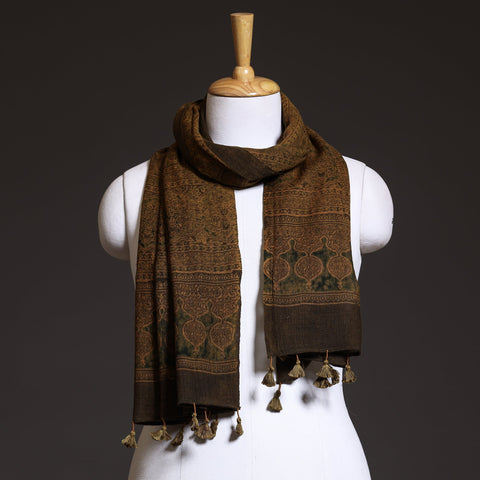 Elevate your style with this fine-quality brown ajrakh hand-block-printed pure wool stole. This stole is made using natural dyes through the traditional techniques of hand block printing by the master artisan of Sufiyan Ismail Khatri, from the Kutch region of Gujarat. The pure wool construction offers exceptional warmth and softness, making it perfect for cold weather. This stole can elevate any outfit. It's versatile and suitable for both formal and casual occasions, adding a touch of traditional Indian artistry to your style.