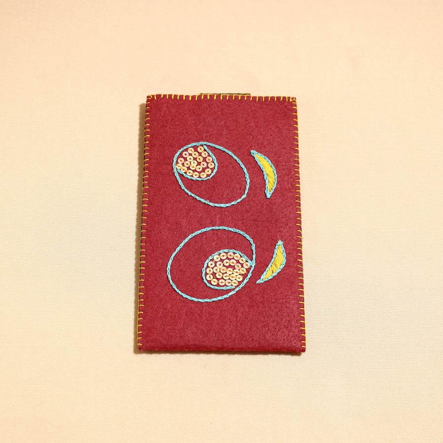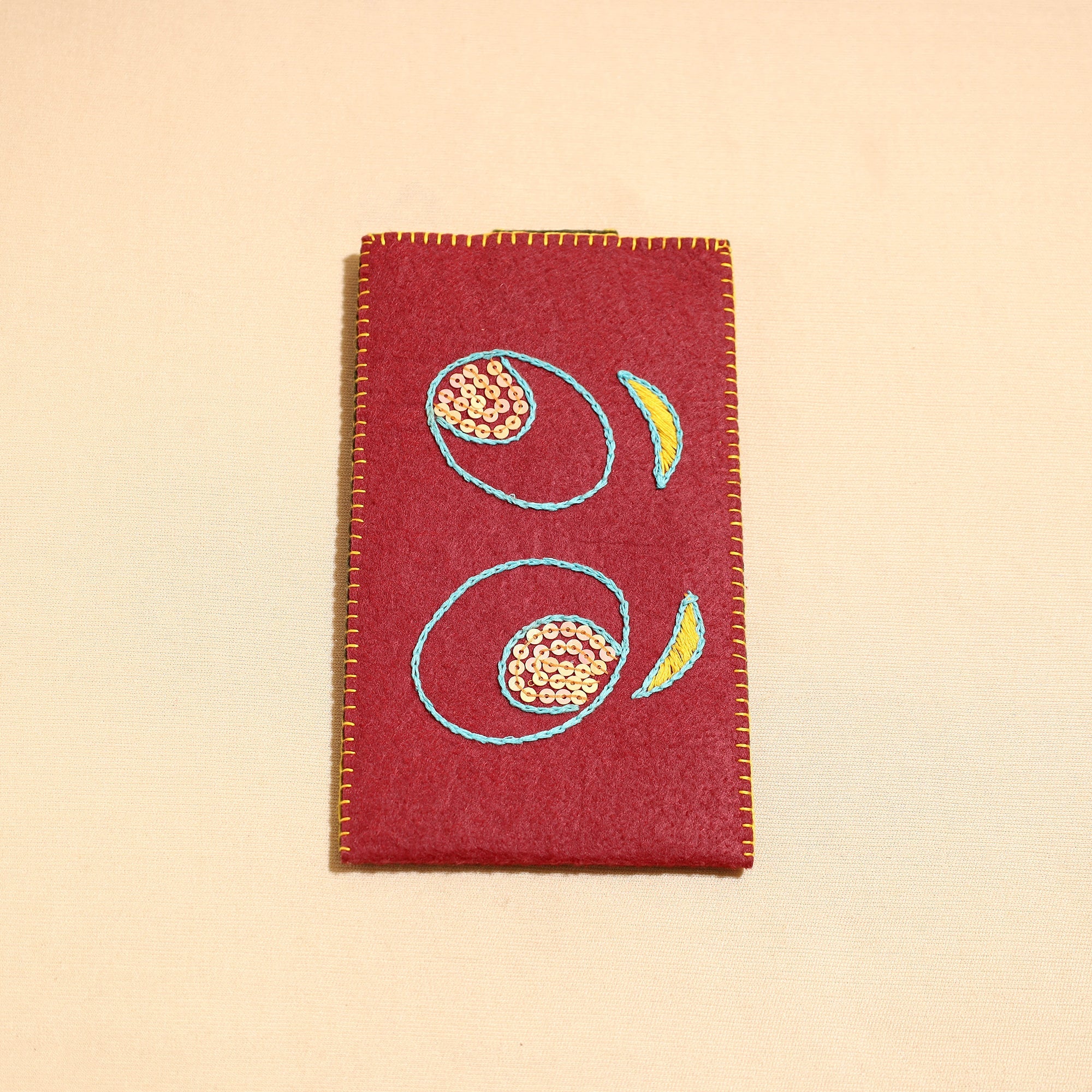Handcrafted maroon embroidered felt mobile pouch by With Love Kanika. This intricately designed pouch offers both functionality and elegance. With a convenient velcro lock, it offers a stylish and practical solution to safeguard your phone. The pouch is not just a fashion statement but also a functional accessory, ensuring your device stays scratch-free and easily accessible on the go.
