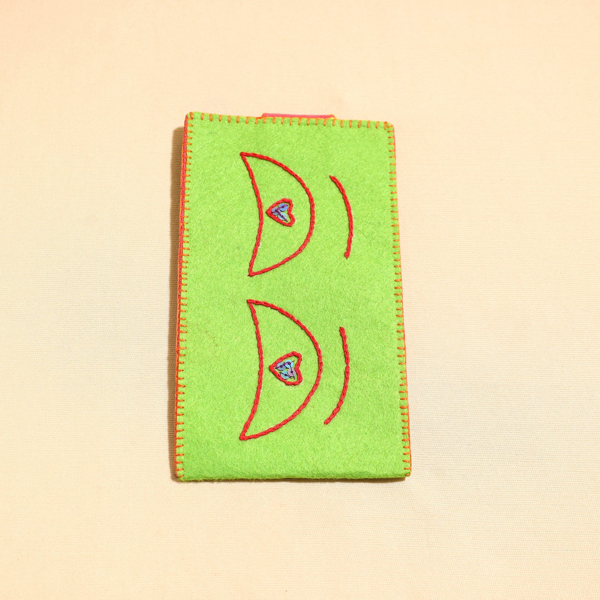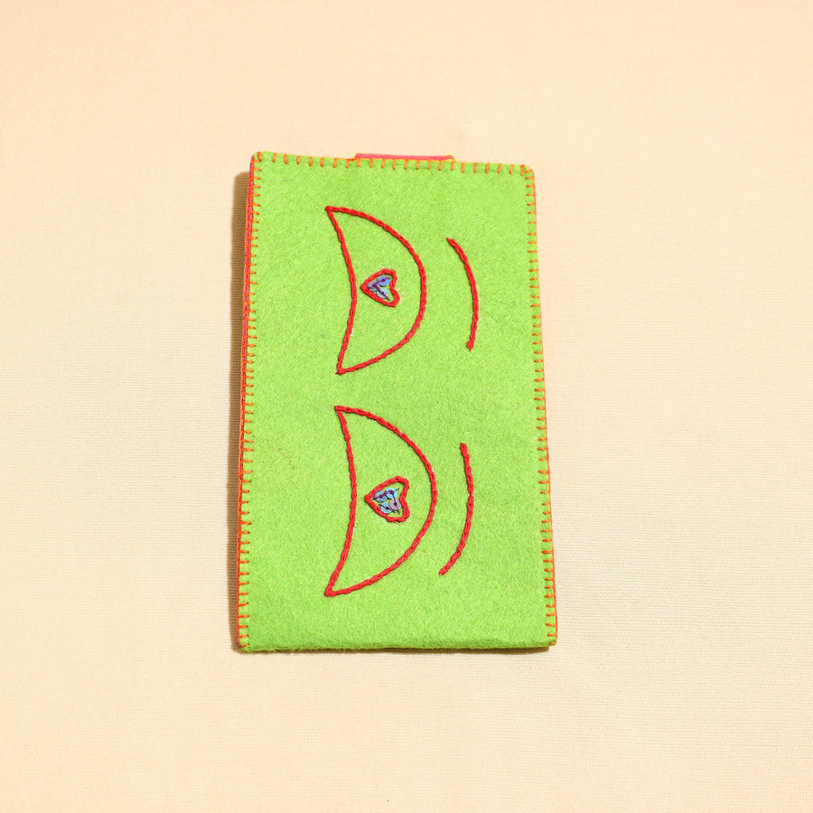 Handcrafted green embroidered felt mobile pouch by With Love Kanika. This intricately designed pouch offers both functionality and elegance. With a convenient velcro lock, it offers a stylish and practical solution to safeguard your phone. The pouch is not just a fashion statement but also a functional accessory, ensuring your device stays scratch-free and easily accessible on the go.