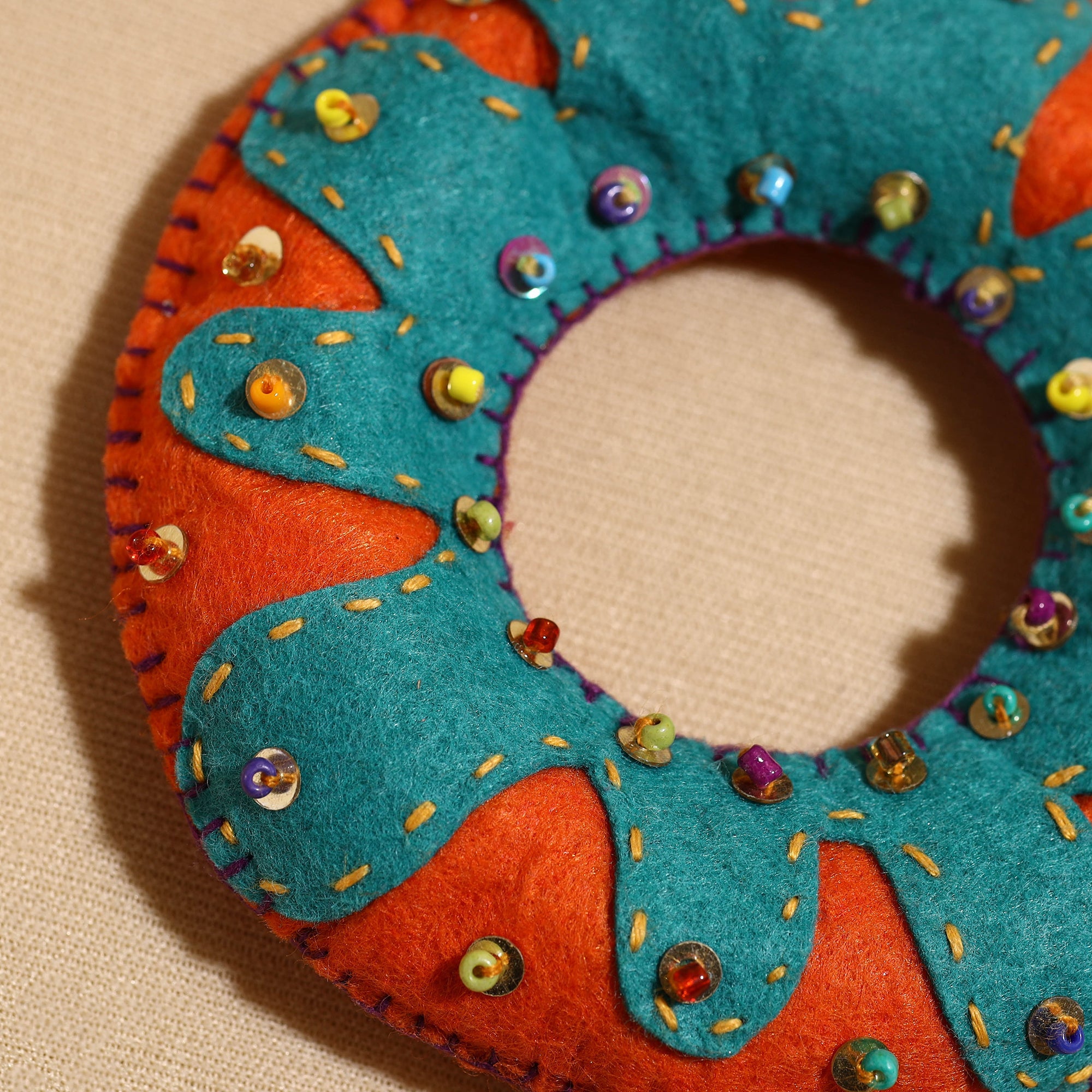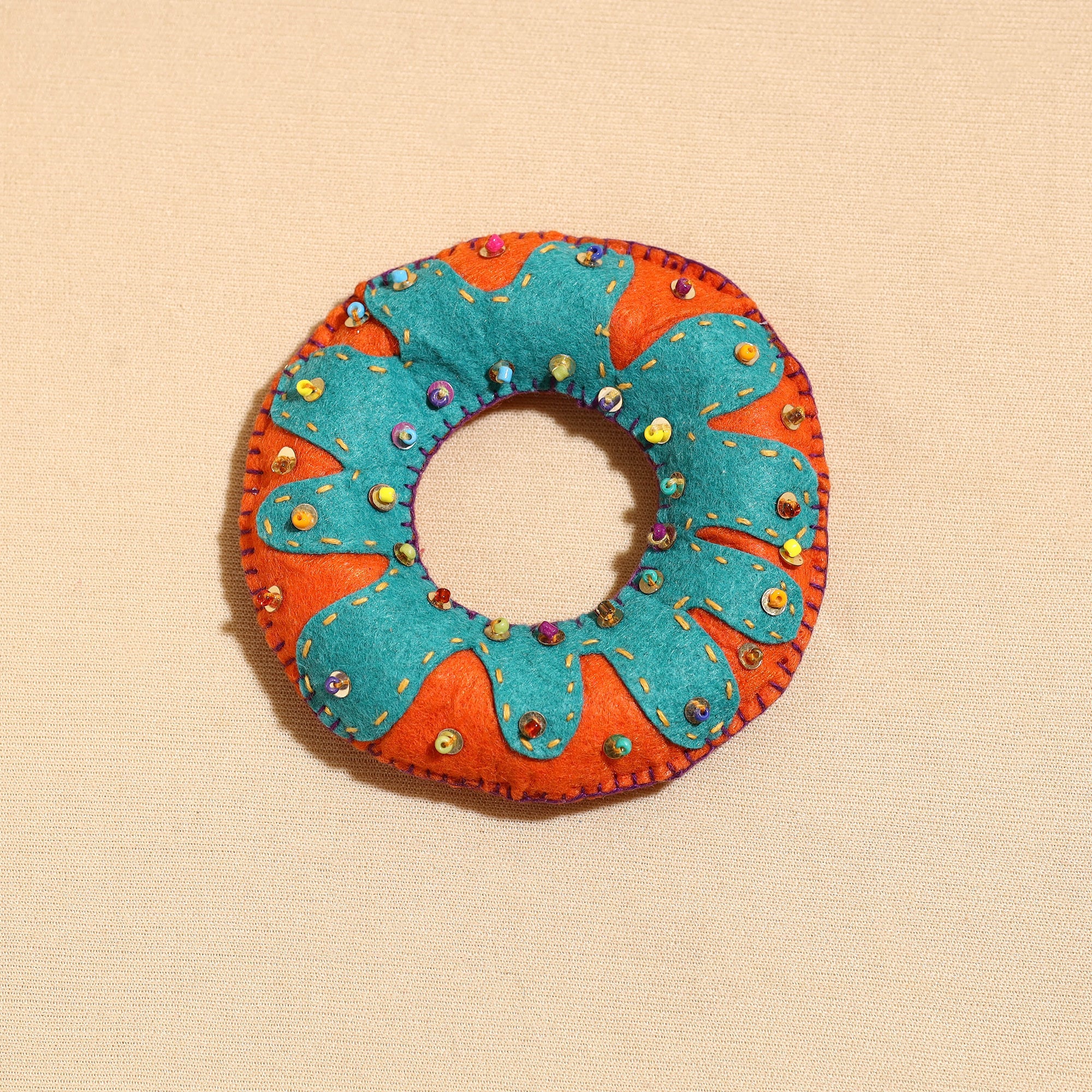 Handcrafted embroidered felt and beadwork donut paperweight, handmade by With Love Kanika. This unique and attractive item acts as a functional paperweight, keeping your documents organized in style while adding a touch of beauty to your space.