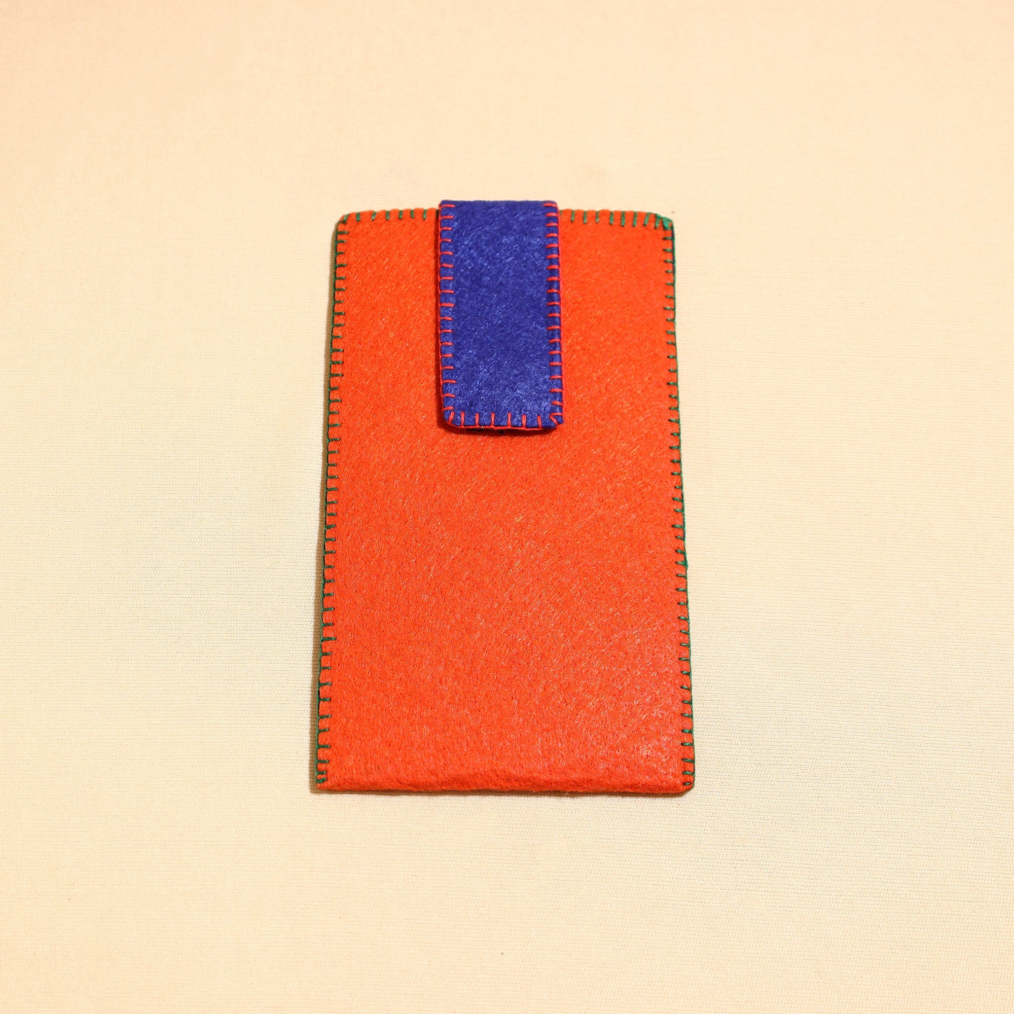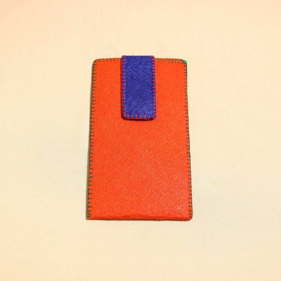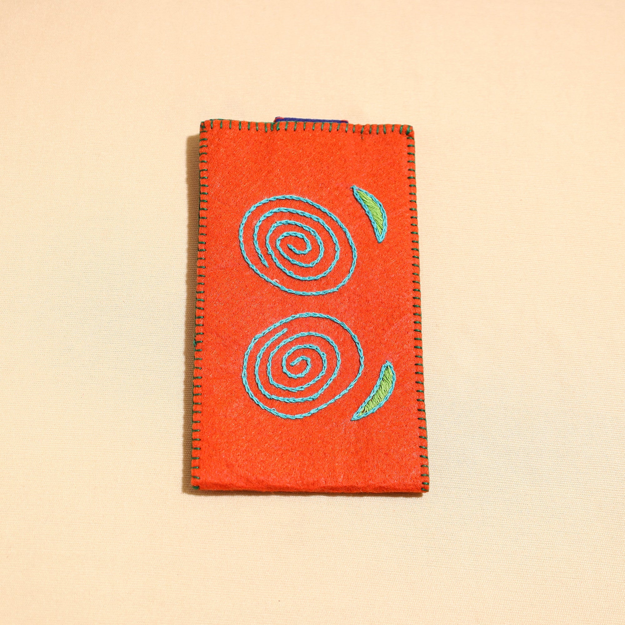 Handcrafted orange embroidered felt mobile pouch by With Love Kanika. This intricately designed pouch offers both functionality and elegance. With a convenient velcro lock, it offers a stylish and practical solution to safeguard your phone. The pouch is not just a fashion statement but also a functional accessory, ensuring your device stays scratch-free and easily accessible on the go.