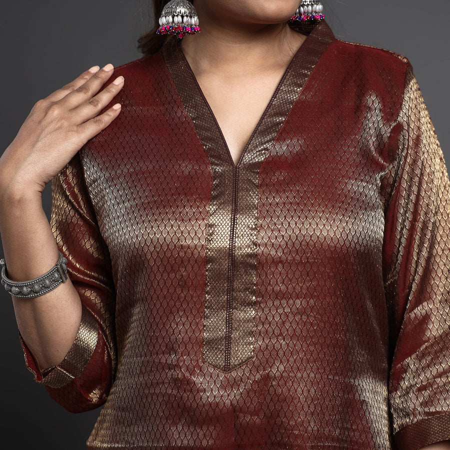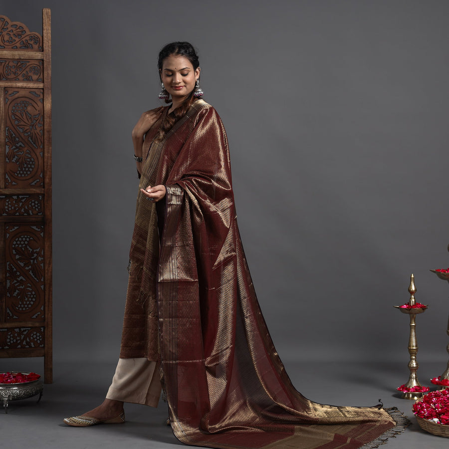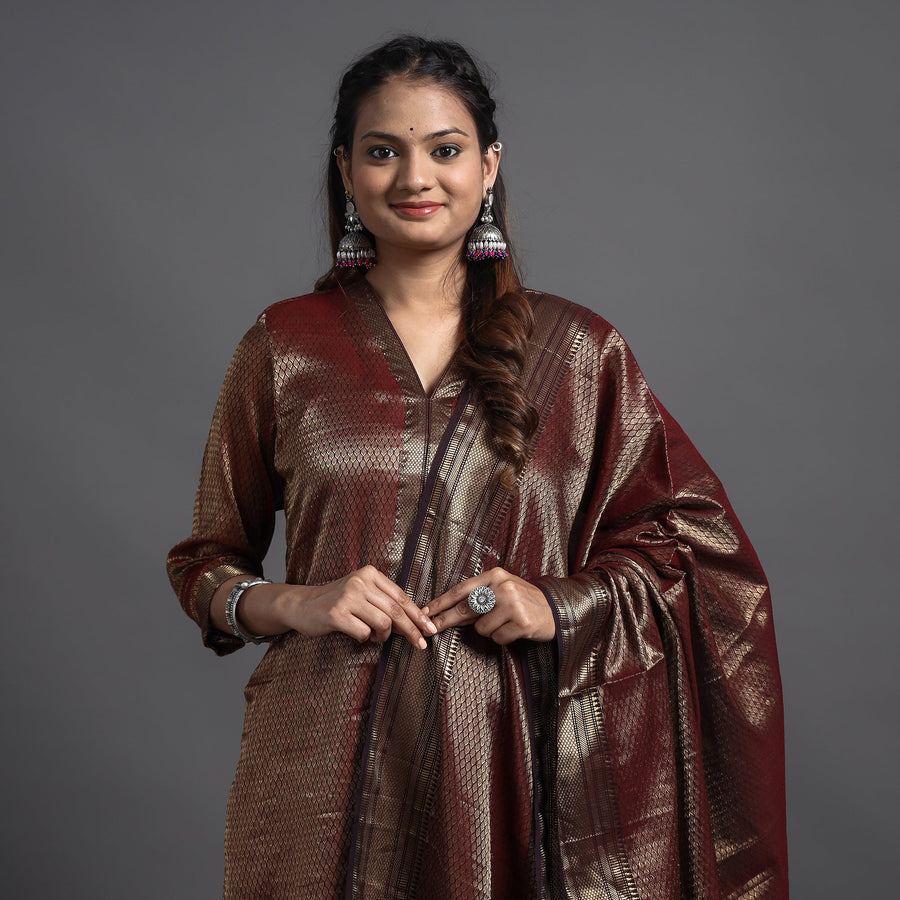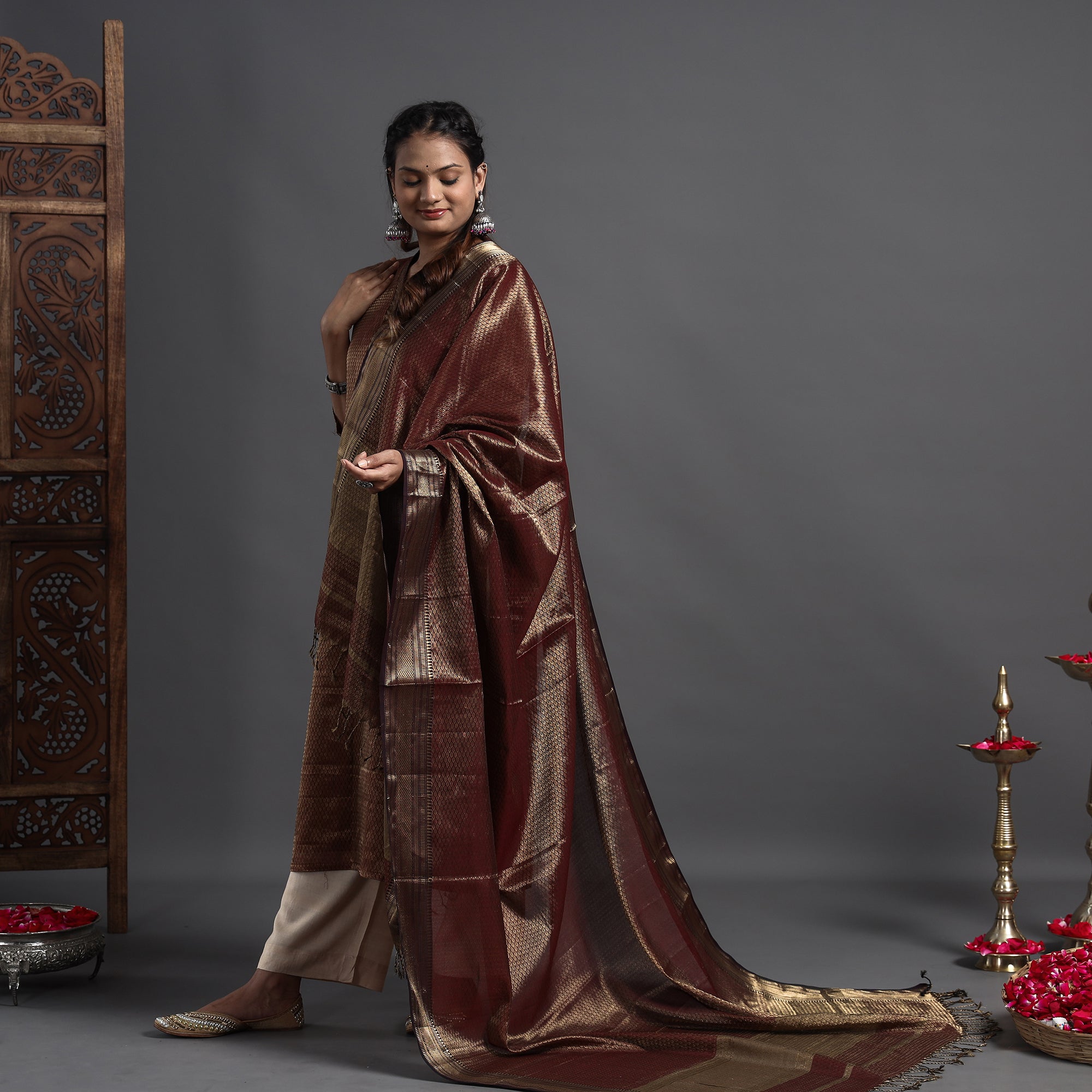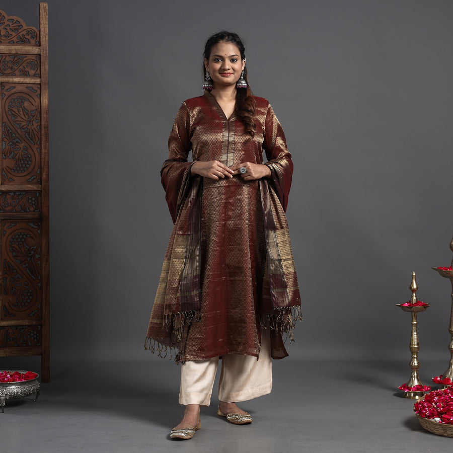 Elevate your ethnic wardrobe with the timeless charm of the traditional maheshwari tissue zari work cotton handloom kurta with dupatta set. This elegant suit set is skillfully handwoven by the master artisans of Maheshwar, a heritage town in India, using traditional techniques. It boasts a luxurious feel and intricate zari work, adding a touch of sophistication to your wardrobe. The kurta also features a convenient one-side pocket, perfect for carrying small essentials. This set has a traditional charm with its elegant design, making it an ideal choice for celebrations.