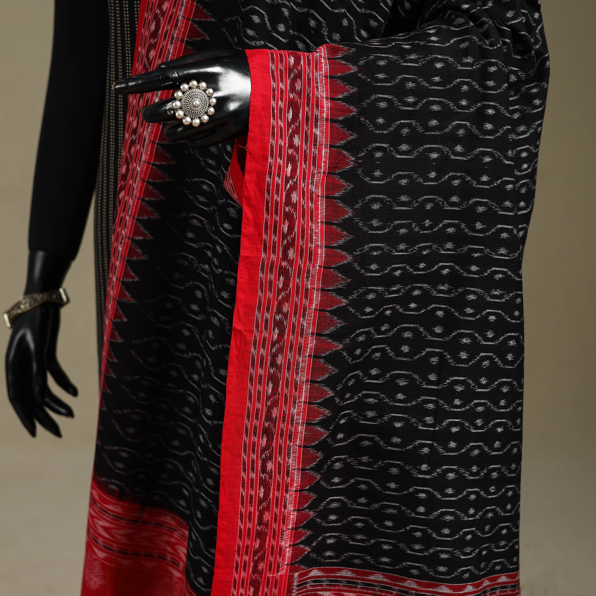 Black sambalpuri ikat weave handloom cotton dupatta from Odisha. Handcrafted by master artisans, this dupatta showcases the artistry of eastern India. Ikat, a dyeing technique known for its stunning patterns and vibrant colors, adds a touch of elegance to this piece. Embrace the beauty of Indian ikat, cherished by fashion designers worldwide.