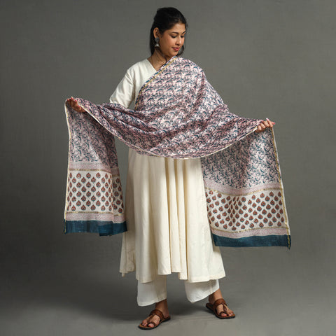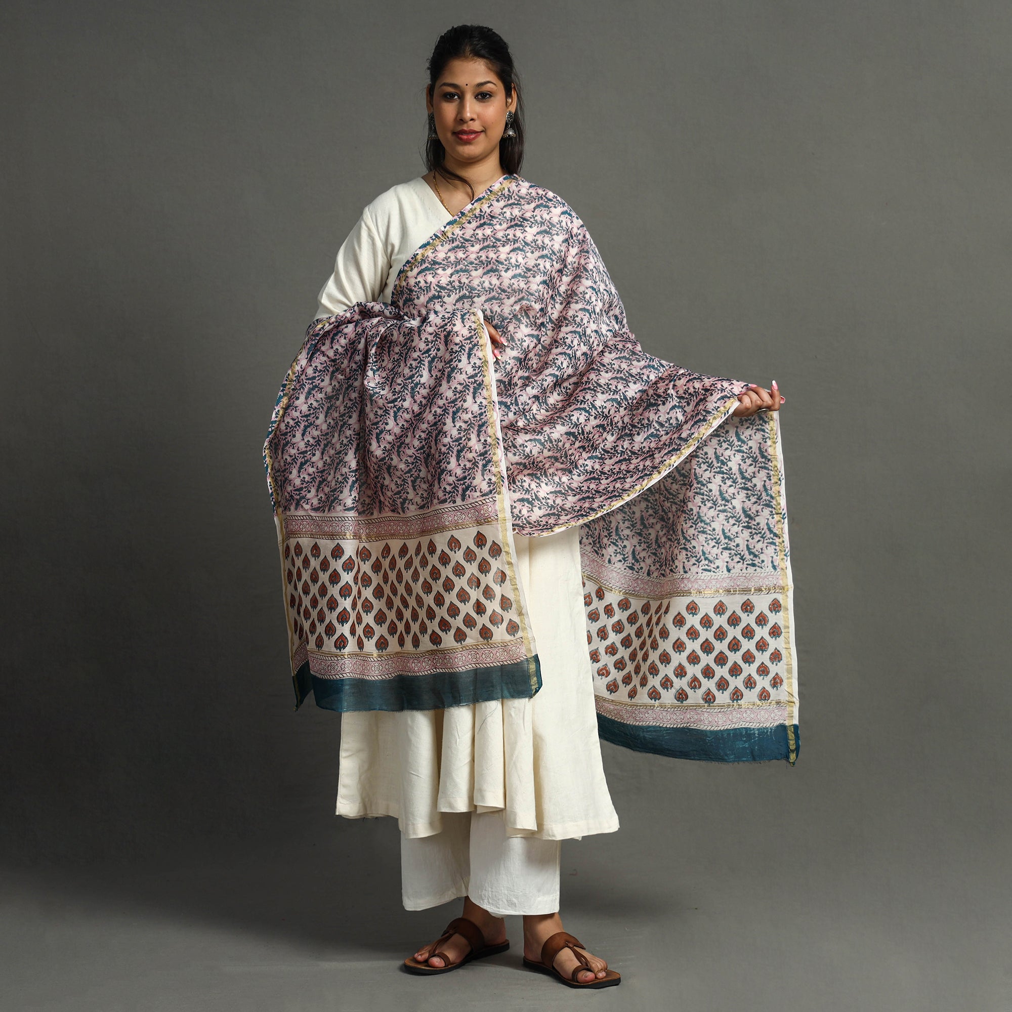 Experience the rich heritage of Rajasthan with our sanganeri hand block printed handloom chanderi silk dupatta with zari border. This dupatta is meticulously crafted from luxurious Chanderi silk-cotton, known for its gossamer looks and amazing feel. The bleed-free VAT dyes ensure lasting vibrancy. The elaborate detailing of the flowers and petals showcases the artistry of this hand-block printing technique originating from Sanganer, Rajasthan. Embrace timeless elegance and support artisanal craftsmanship with this unique accessory.
