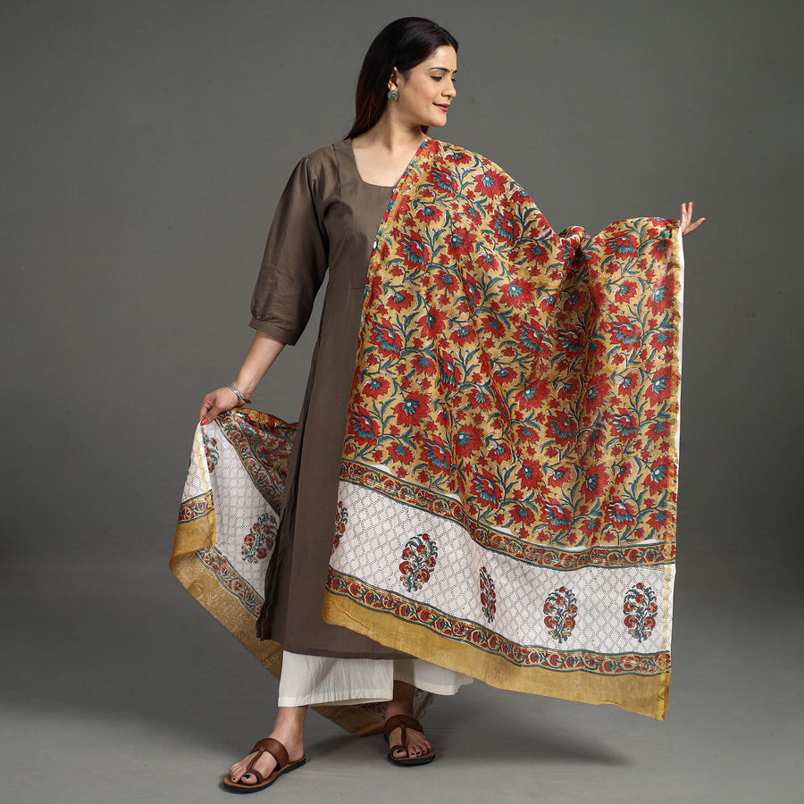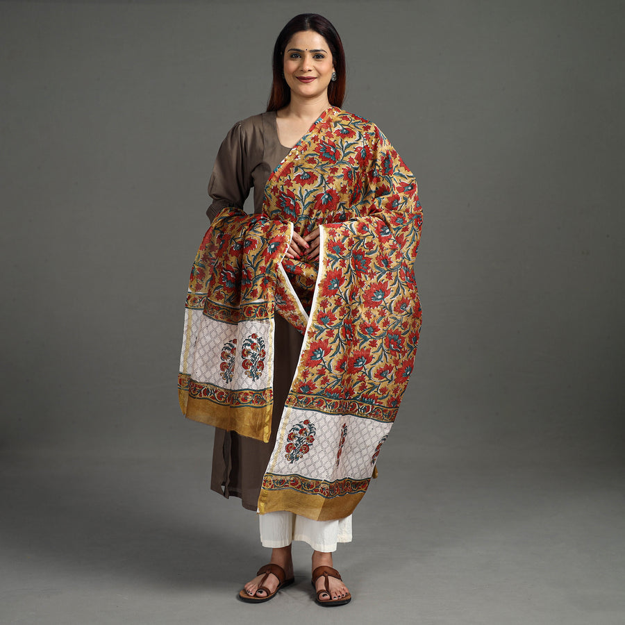 Experience the rich heritage of Rajasthan with our sanganeri hand block printed handloom chanderi silk dupatta with zari border. This dupatta is meticulously crafted from luxurious Chanderi silk-cotton, known for its gossamer looks and amazing feel. The bleed-free VAT dyes ensure lasting vibrancy. The elaborate detailing of the flowers and petals showcases the artistry of this hand-block printing technique originating from Sanganer, Rajasthan. Embrace timeless elegance and support artisanal craftsmanship with this unique accessory.
