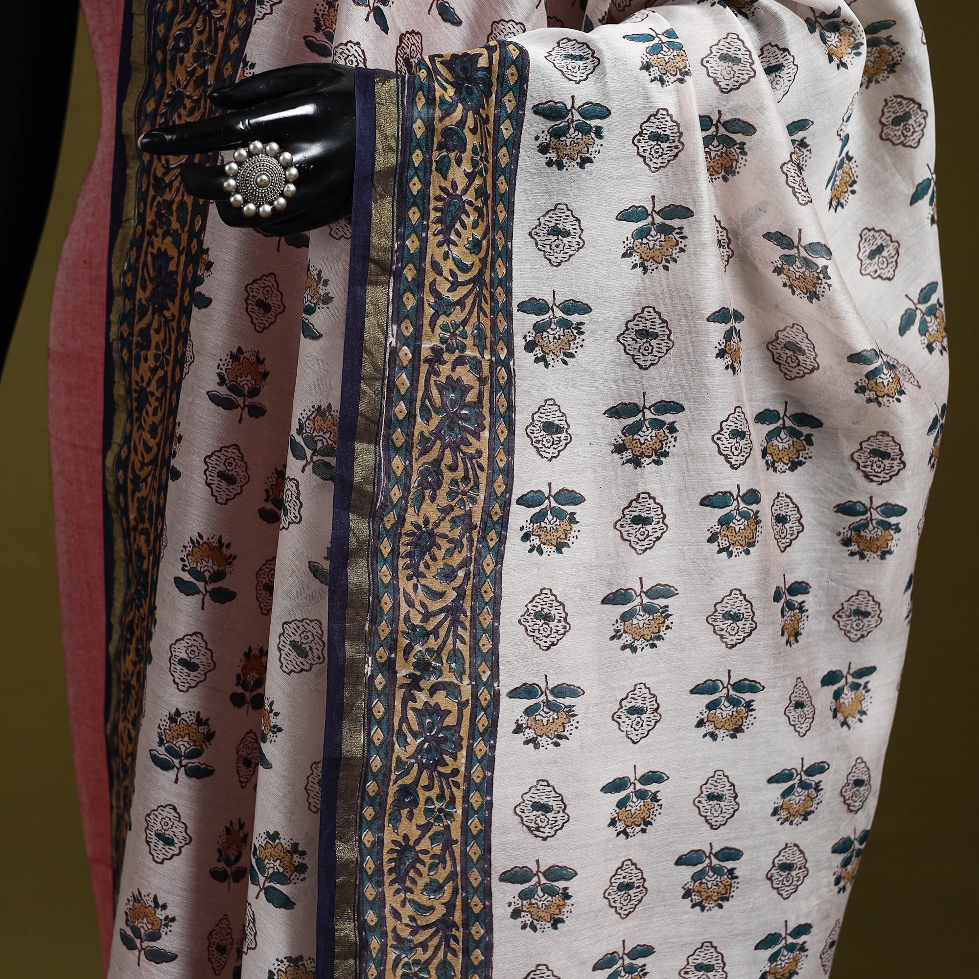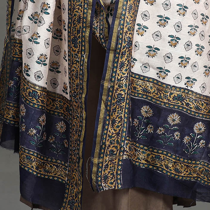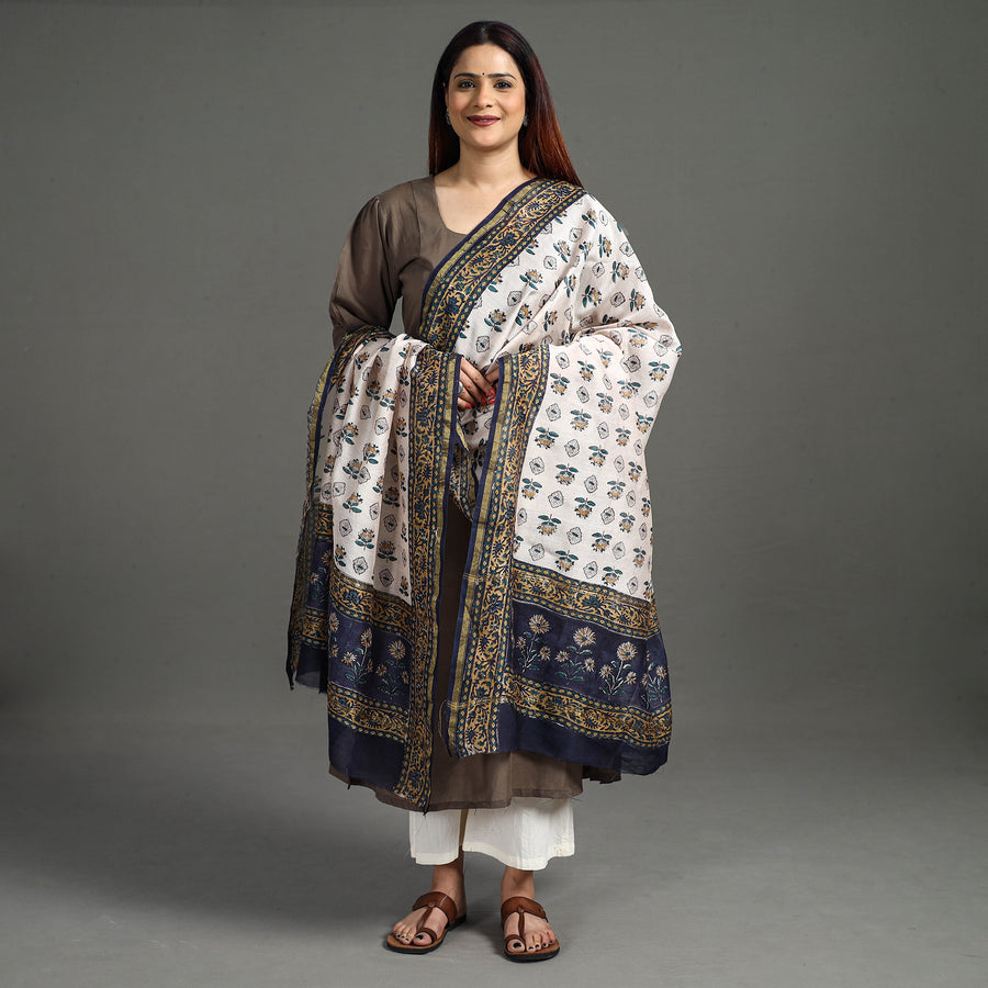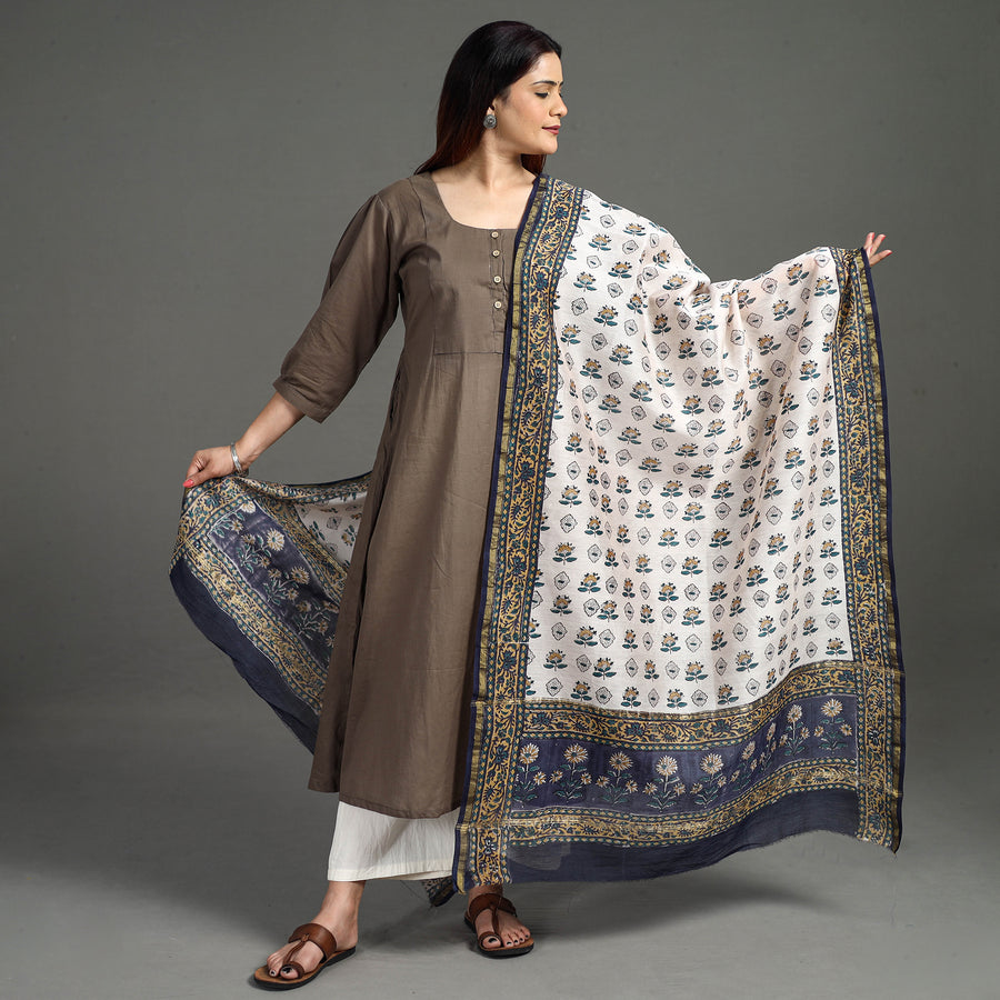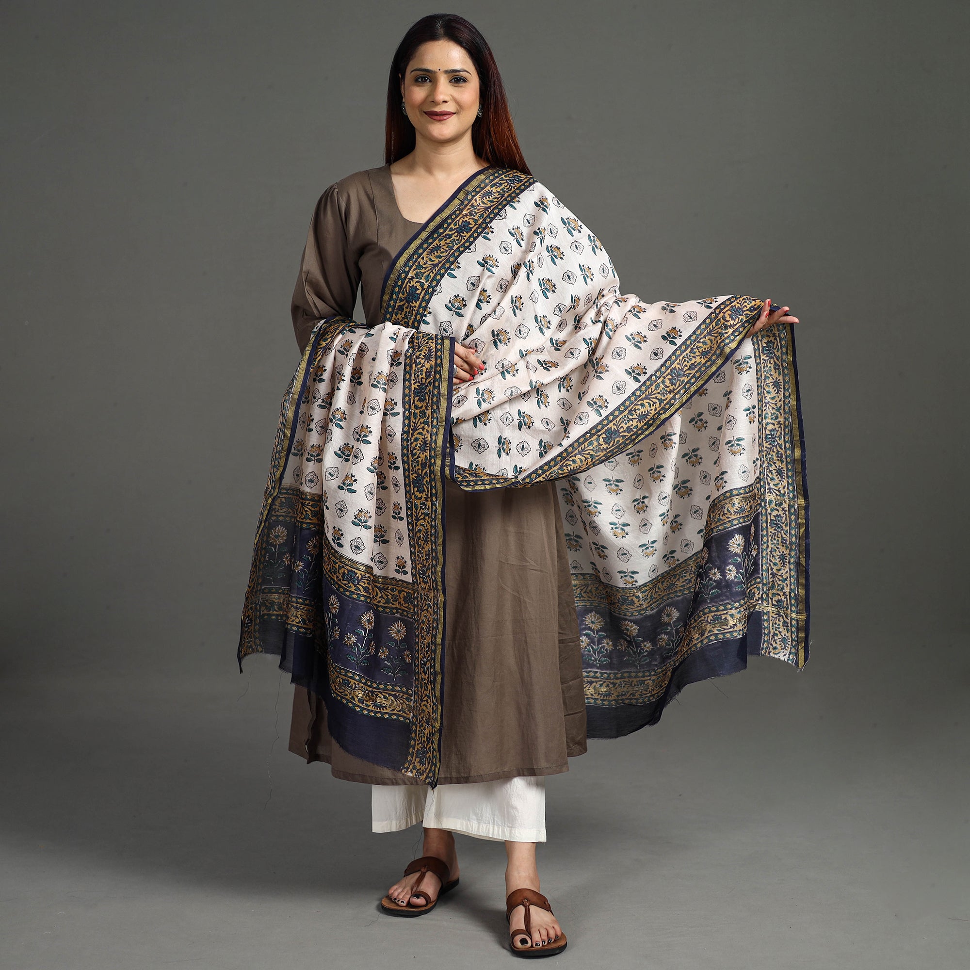 Experience the rich heritage of Rajasthan with our sanganeri hand block printed handloom chanderi silk dupatta with zari border. This dupatta is meticulously crafted from luxurious Chanderi silk-cotton, known for its gossamer looks and amazing feel. The bleed-free VAT dyes ensure lasting vibrancy. The elaborate detailing of the flowers and petals showcases the artistry of this hand-block printing technique originating from Sanganer, Rajasthan. Embrace timeless elegance and support artisanal craftsmanship with this unique accessory.