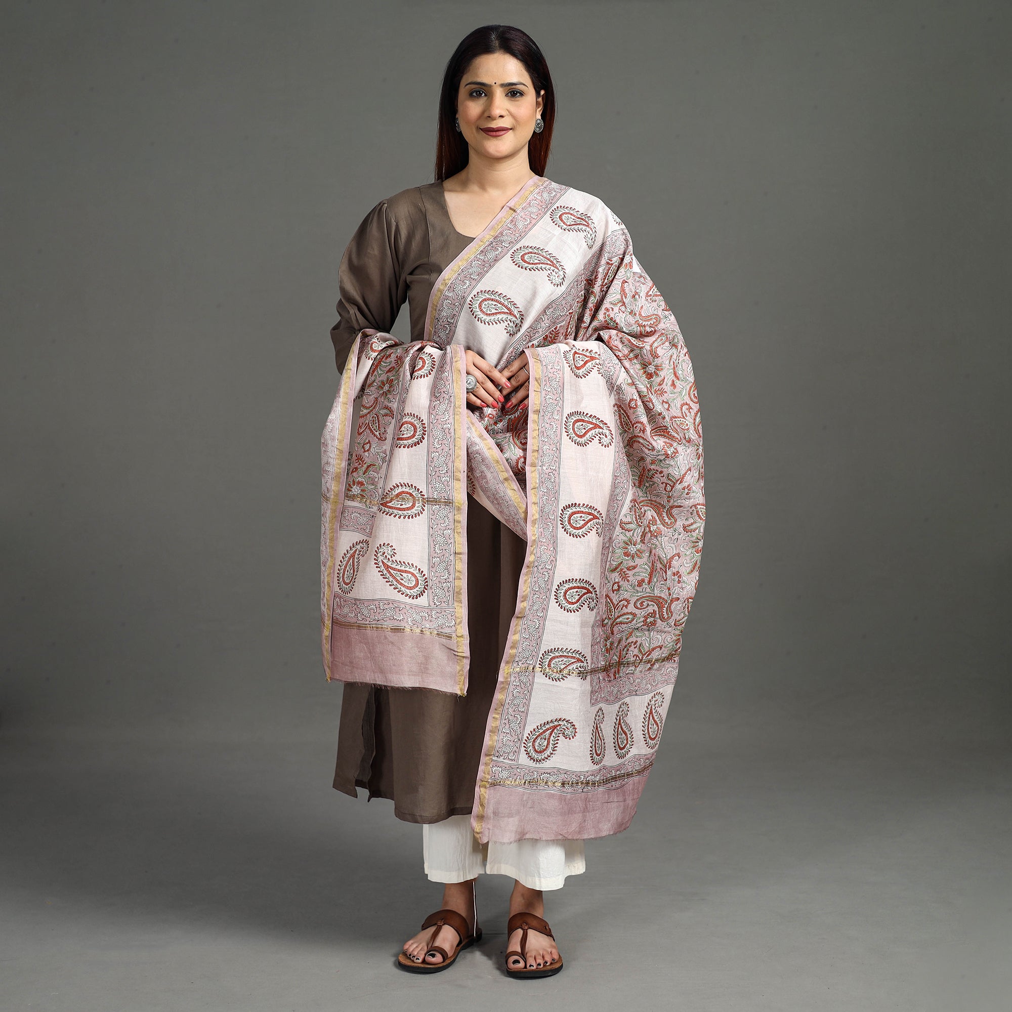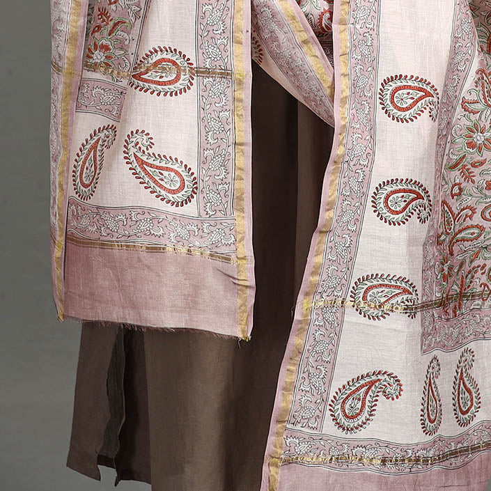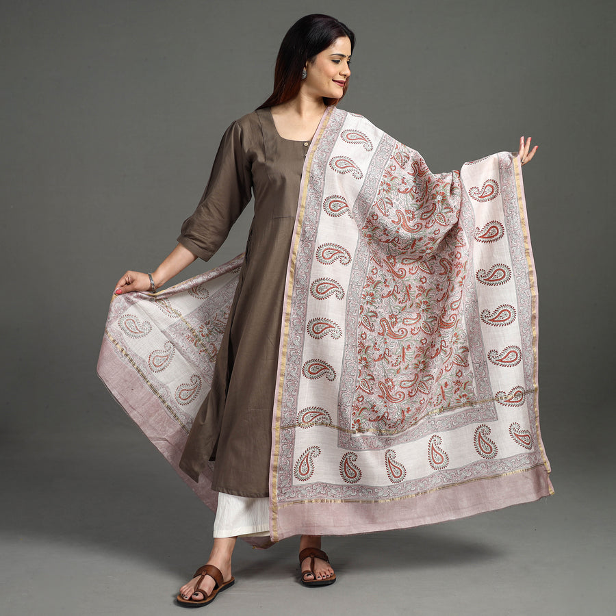 Experience the rich heritage of Rajasthan with our sanganeri hand block printed handloom chanderi silk dupatta with zari border. This dupatta is meticulously crafted from luxurious Chanderi silk-cotton, known for its gossamer looks and amazing feel. The bleed-free VAT dyes ensure lasting vibrancy. The elaborate detailing of the flowers and petals showcases the artistry of this hand-block printing technique originating from Sanganer, Rajasthan. Embrace timeless elegance and support artisanal craftsmanship with this unique accessory.