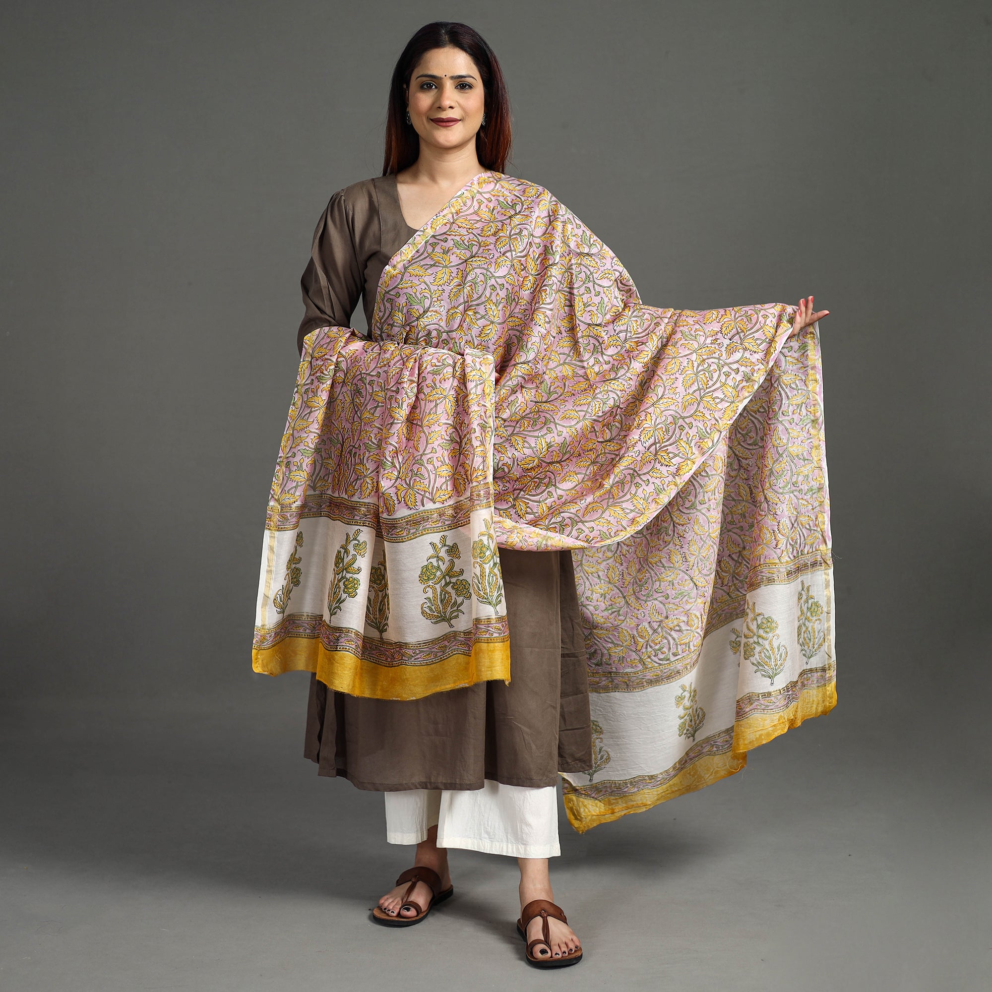 Experience the rich heritage of Rajasthan with our sanganeri hand block printed handloom chanderi silk dupatta with zari border. This dupatta is meticulously crafted from luxurious Chanderi silk-cotton, known for its gossamer looks and amazing feel. The bleed-free VAT dyes ensure lasting vibrancy. The elaborate detailing of the flowers and petals showcases the artistry of this hand-block printing technique originating from Sanganer, Rajasthan. Embrace timeless elegance and support artisanal craftsmanship with this unique accessory.