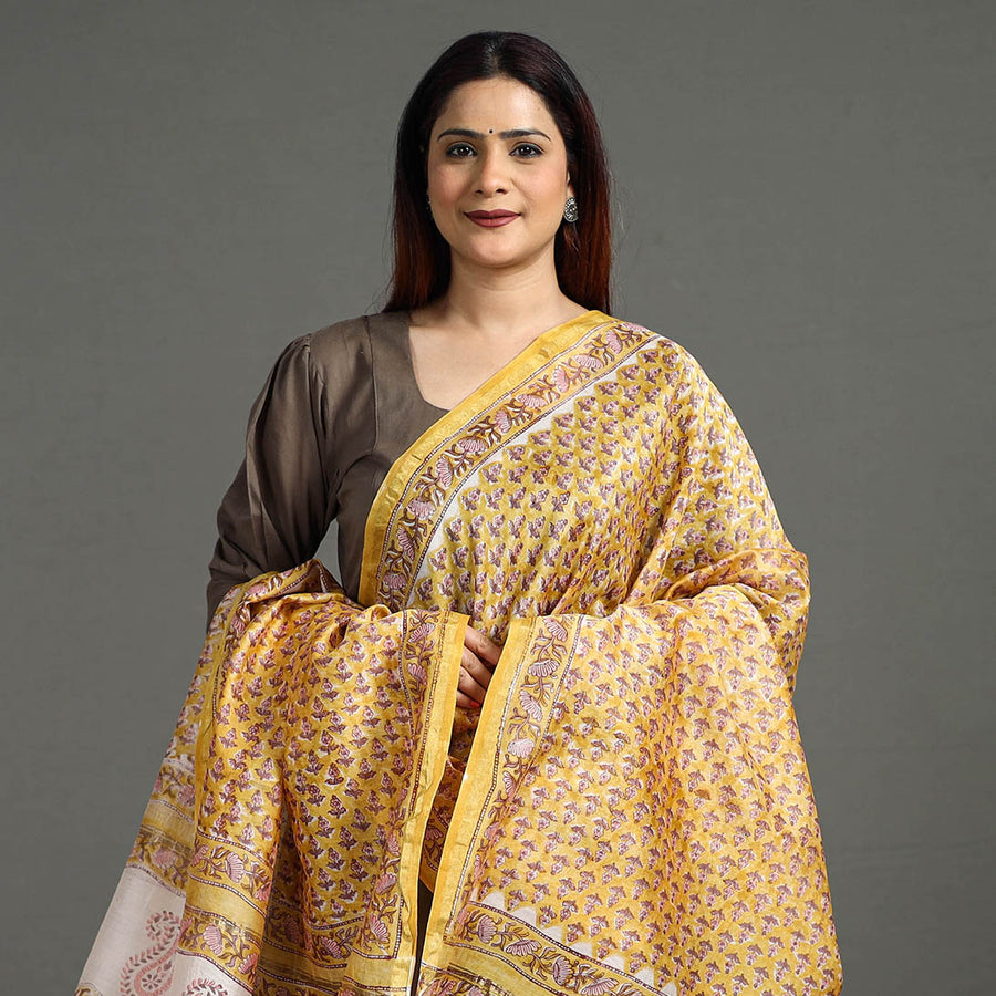 Experience the rich heritage of Rajasthan with our sanganeri hand block printed handloom chanderi silk dupatta with zari border. This dupatta is meticulously crafted from luxurious Chanderi silk-cotton, known for its gossamer looks and amazing feel. The bleed-free VAT dyes ensure lasting vibrancy. The elaborate detailing of the flowers and petals showcases the artistry of this hand-block printing technique originating from Sanganer, Rajasthan. Embrace timeless elegance and support artisanal craftsmanship with this unique accessory.