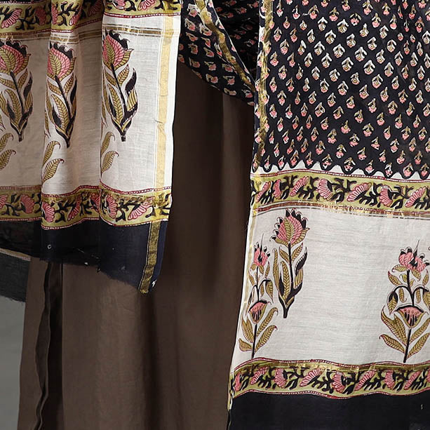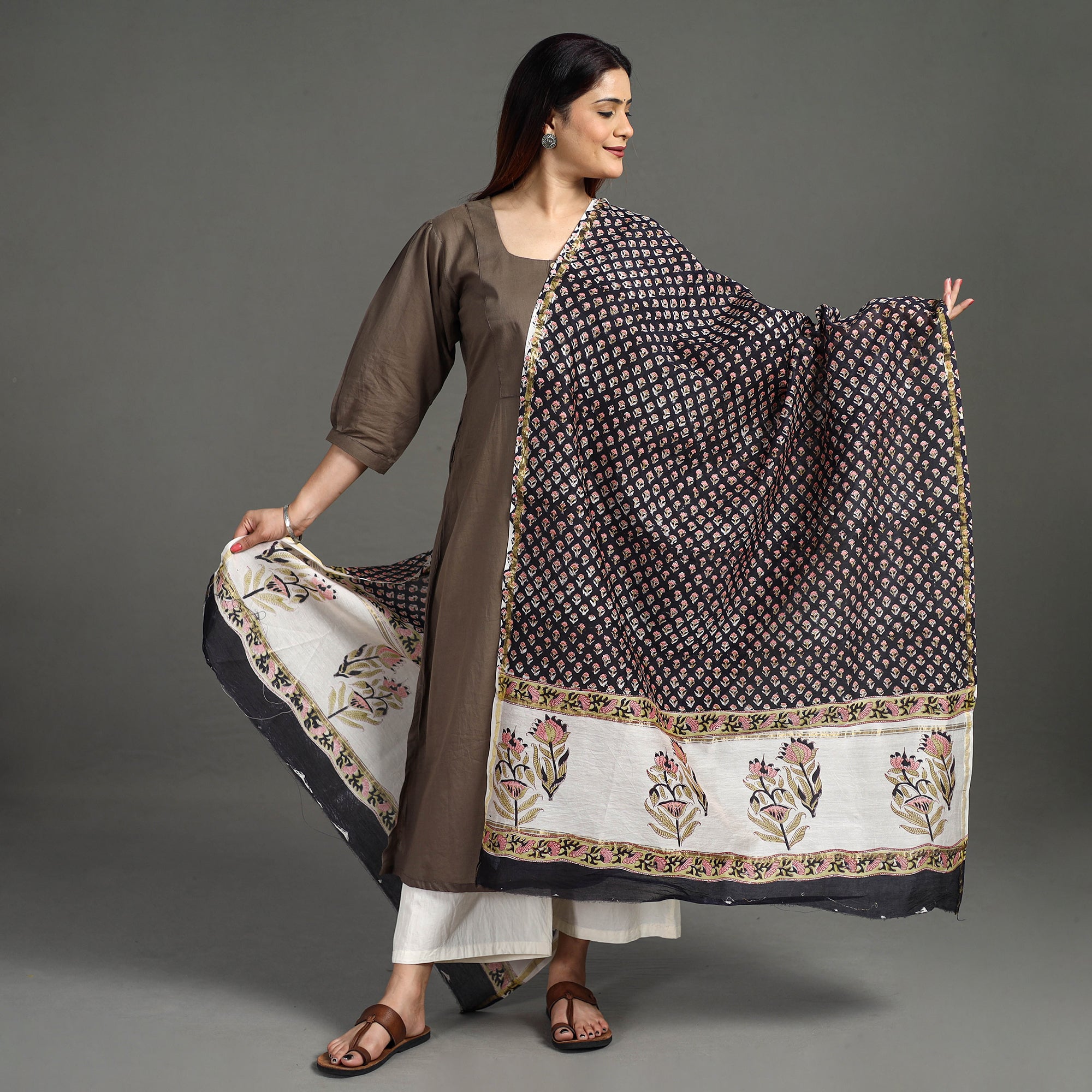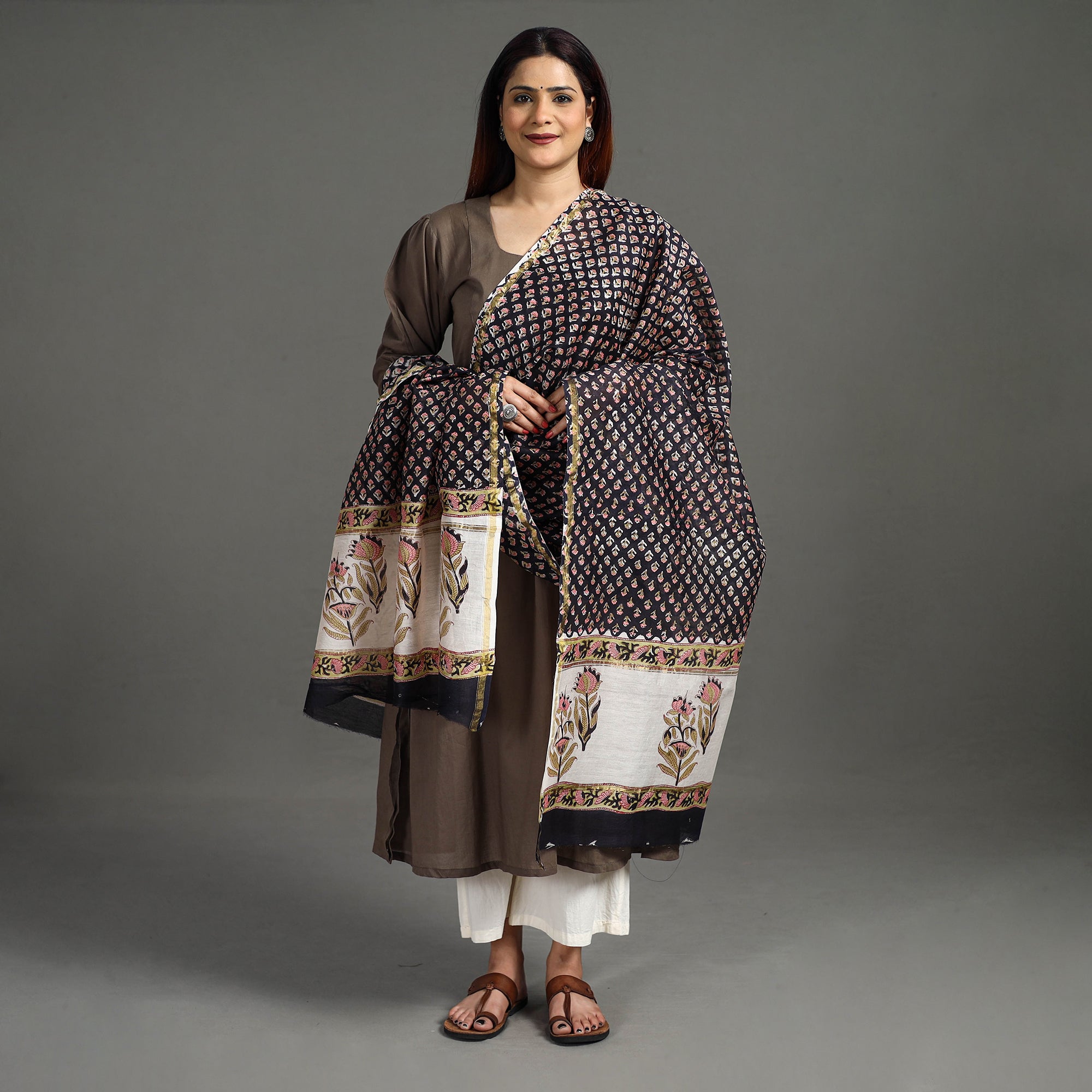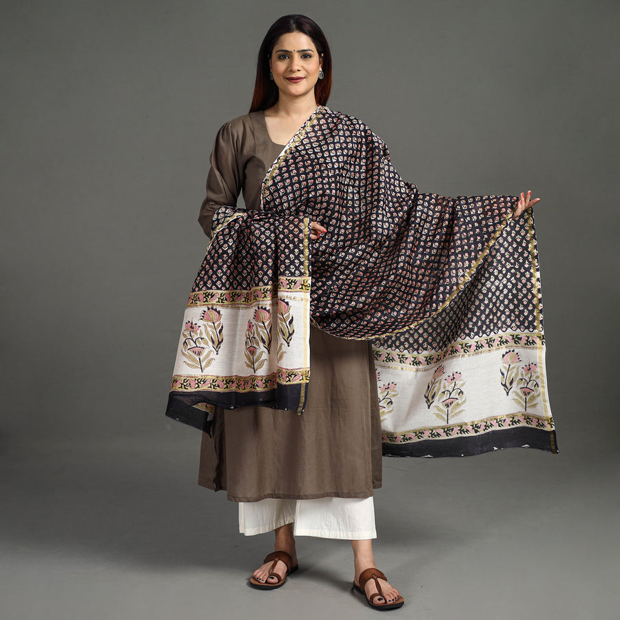 Experience the rich heritage of Rajasthan with our sanganeri hand block printed handloom chanderi silk dupatta with zari border. This dupatta is meticulously crafted from luxurious Chanderi silk-cotton, known for its gossamer looks and amazing feel. The bleed-free VAT dyes ensure lasting vibrancy. The elaborate detailing of the flowers and petals showcases the artistry of this hand-block printing technique originating from Sanganer, Rajasthan. Embrace timeless elegance and support artisanal craftsmanship with this unique accessory.