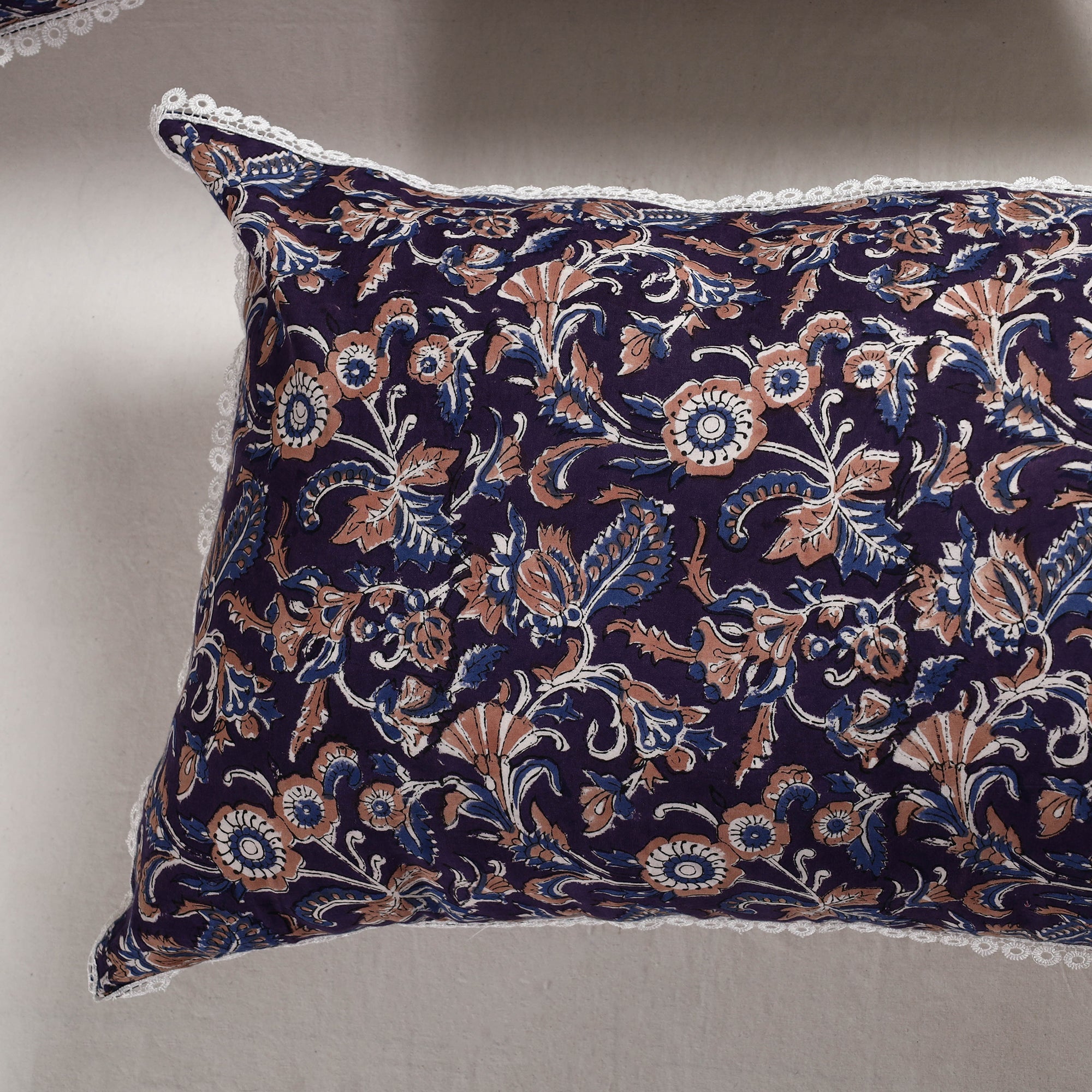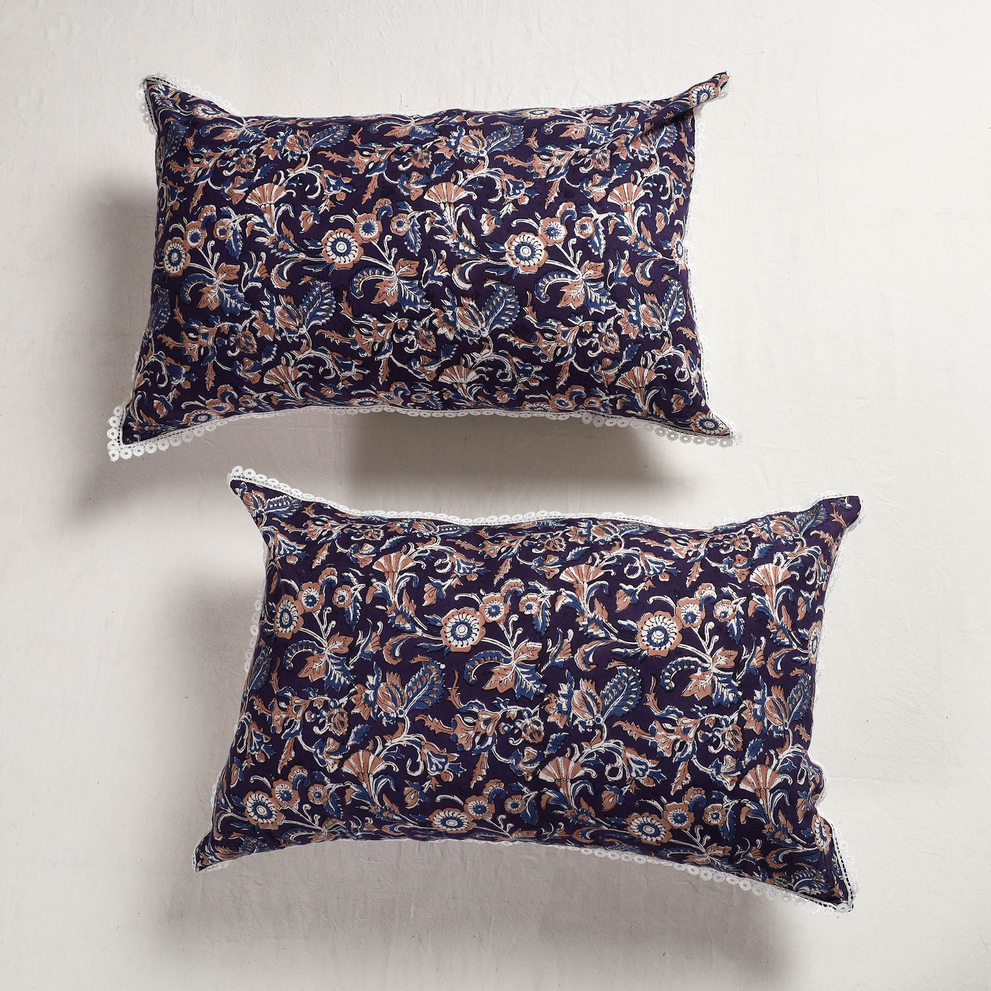 Fine-quality sanganeri hand-block-printed pure cotton pillow cover with lace. Sanganeri is a hand-block printing technique originating from Sanganer, a village in the southern part of Jaipur, Rajasthan. Bleed-free VAT dyes are used. Elevate your home decor with its vibrant patterns and soft cotton texture, adding a touch of traditional elegance to your living space.