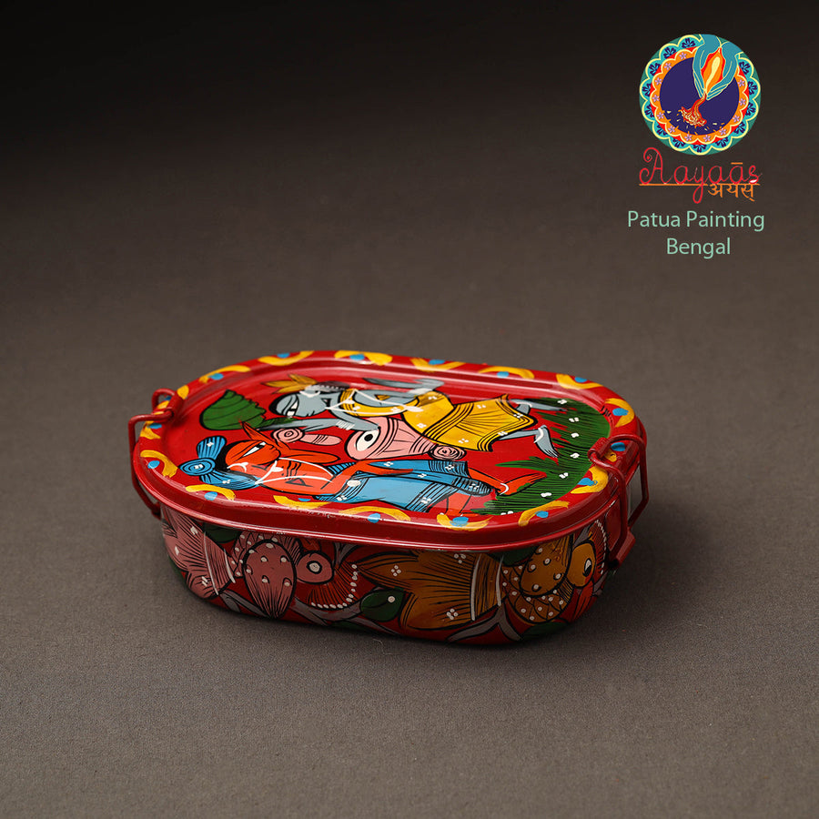 Enhance your dining experience with the red bengal patua handpainted stainless steel lunch box by Laltu Chitrakar. This masterpiece, adorned with intricate patua designs inspired by Indian epics and local folklore, showcases traditional Bengali artistry. Crafted from durable stainless steel, it ensures both style and practicality. Ideal for storing and transporting meals or snacks, this unique lunch box makes every meal a delightful and stylish affair, adding a touch of cultural richness to your daily routine.