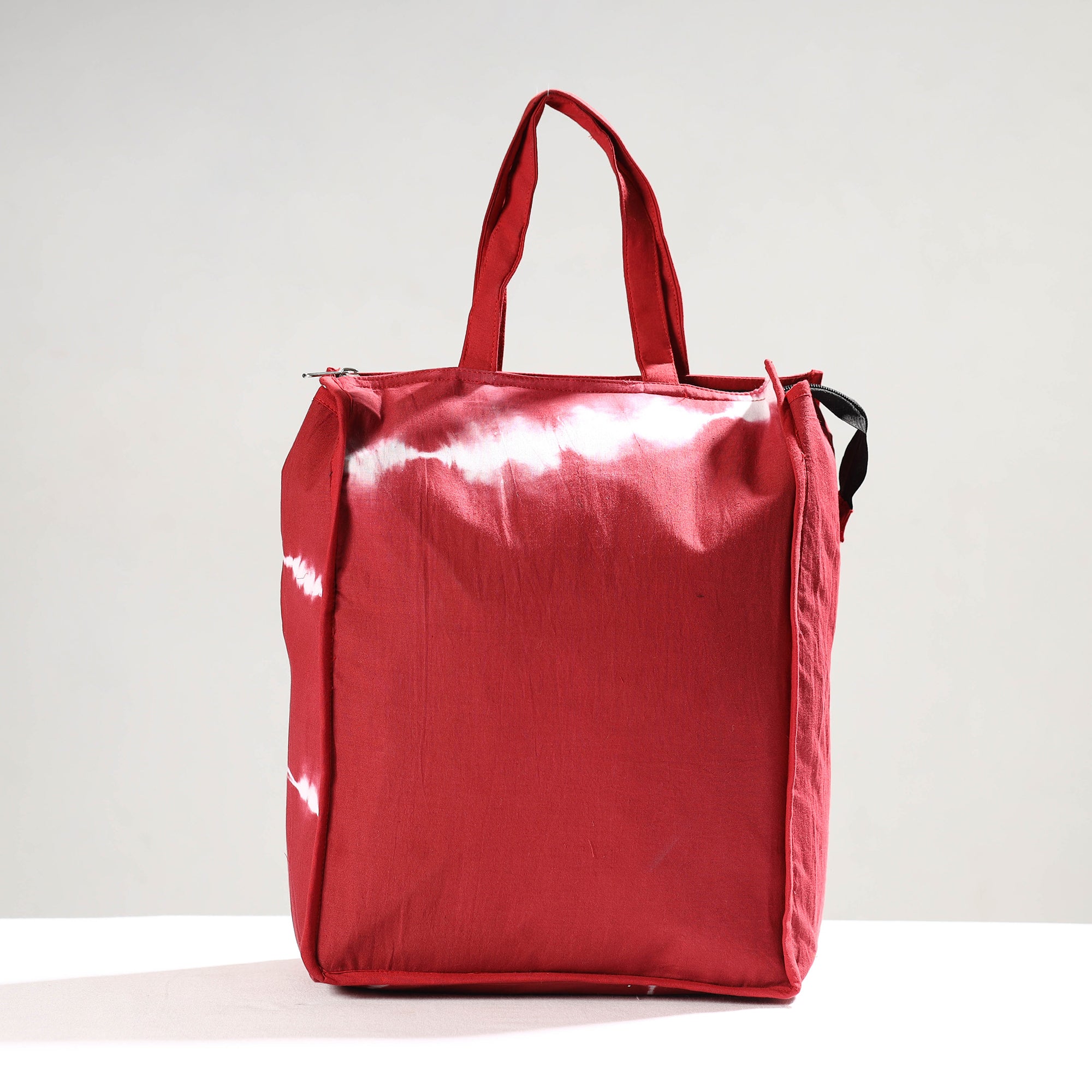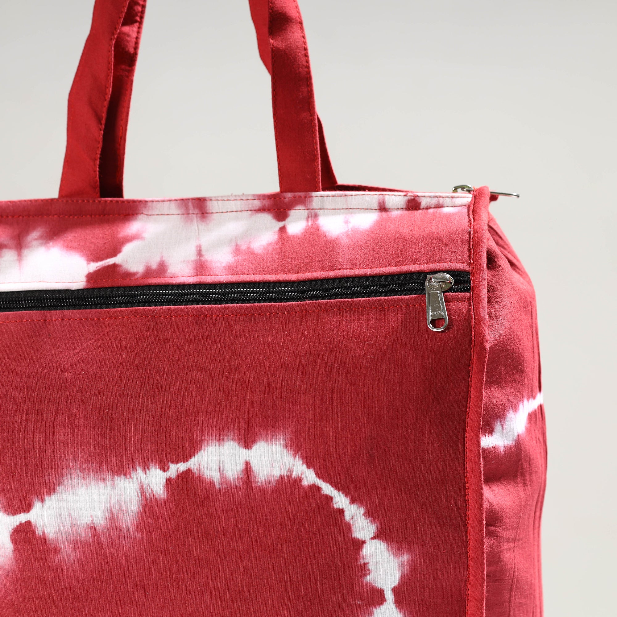 Enhance your shopping routine with our red handmade, shibori tie-dye cotton shopping bag. Crafted from premium cotton, it seamlessly blends durability and style. The spacious design accommodates daily essentials, making it a versatile accessory. Textured with handmade textiles from India, this bag serves practical purposes and also showcases artisanal craftsmanship.