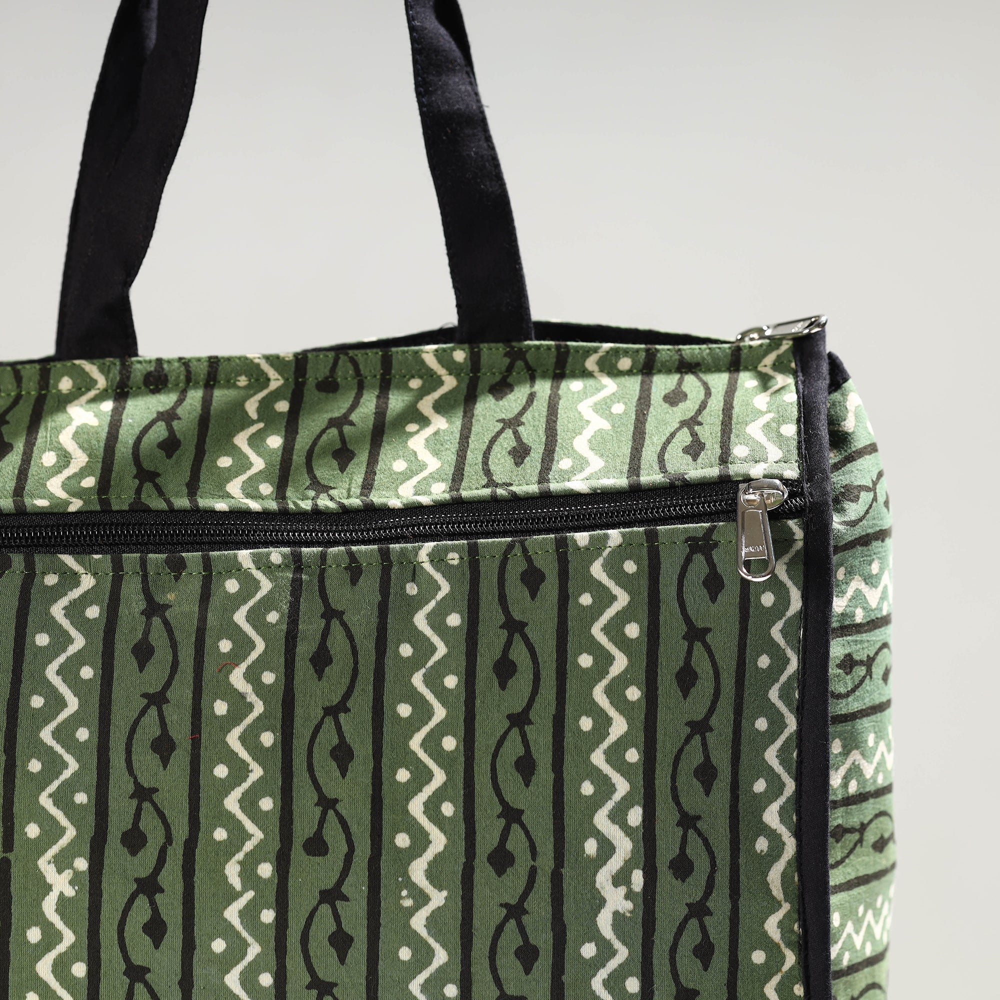 Enhance your shopping routine with our green handmade pipad block-printed cotton shopping bag. Crafted from premium cotton, it seamlessly blends durability and style. The spacious design accommodates daily essentials, making it a versatile accessory. Textured with handmade textiles from India, this bag serves practical purposes and also showcases artisanal craftsmanship.