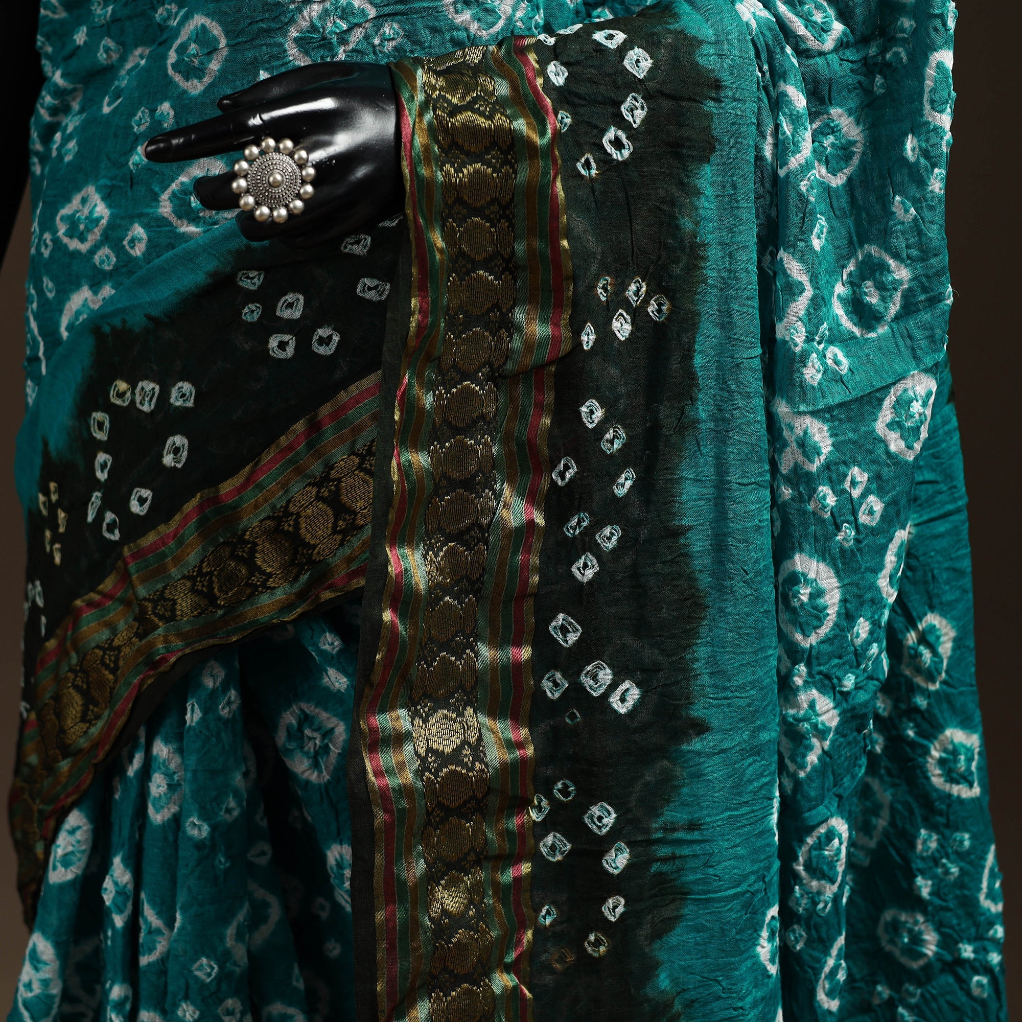 Elevate your style with the fine quality green kutch bandhani cotton saree, showcasing a majestic tie-dye pattern. Handcrafted by skilled artisans using the traditional Bandhani technique, this saree represents the rich heritage of Kutch. Each intricate design is created by tightly tying the fabric with threads before dyeing, resulting in a beautiful and unique piece. Perfect for adding a touch of elegance to your wardrobe.
