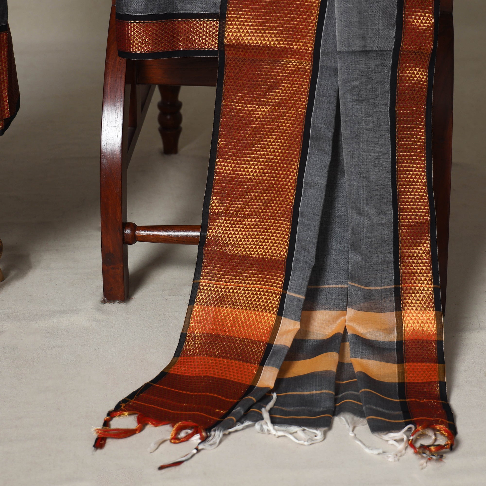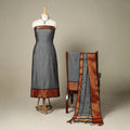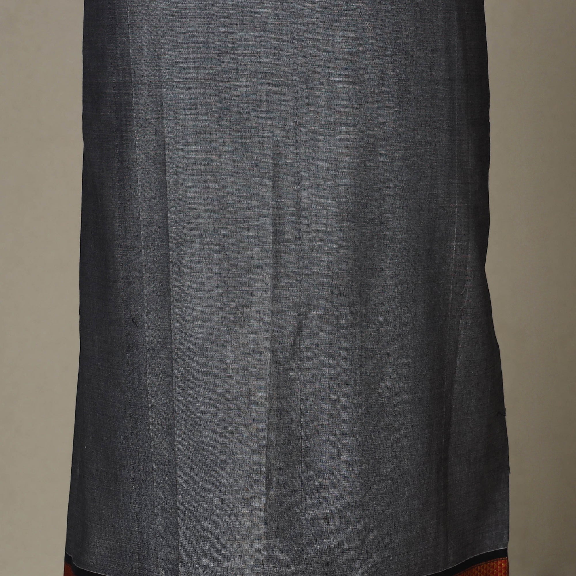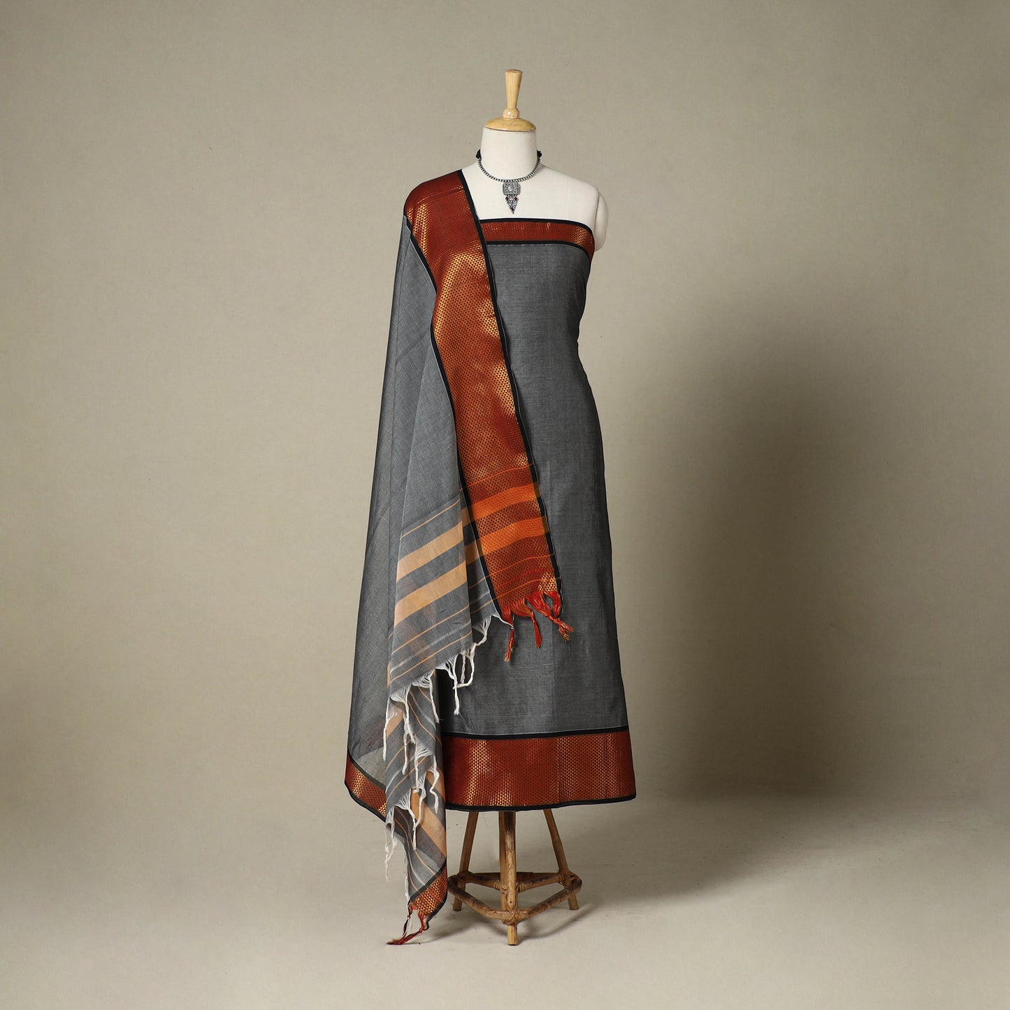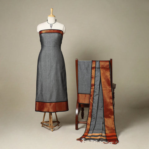 Fine-quality grey cotton 3-piece suit material set from Dharwad, Karnataka. This set is a tribute to the rich textile heritage of the region, featuring traditional thread and zari-woven border work that adds a touch of sophistication. The set includes a beautifully crafted kurta piece, a matching bottom/salwar piece, and a coordinating dupatta. Crafted with precision and care, this suit material set offers both style and comfort. Whether you're attending a festive occasion or a casual gathering, this ensemble is sure to make a lasting impression. Unleash your creativity and bring this fabric to life by designing your own unique outfit.