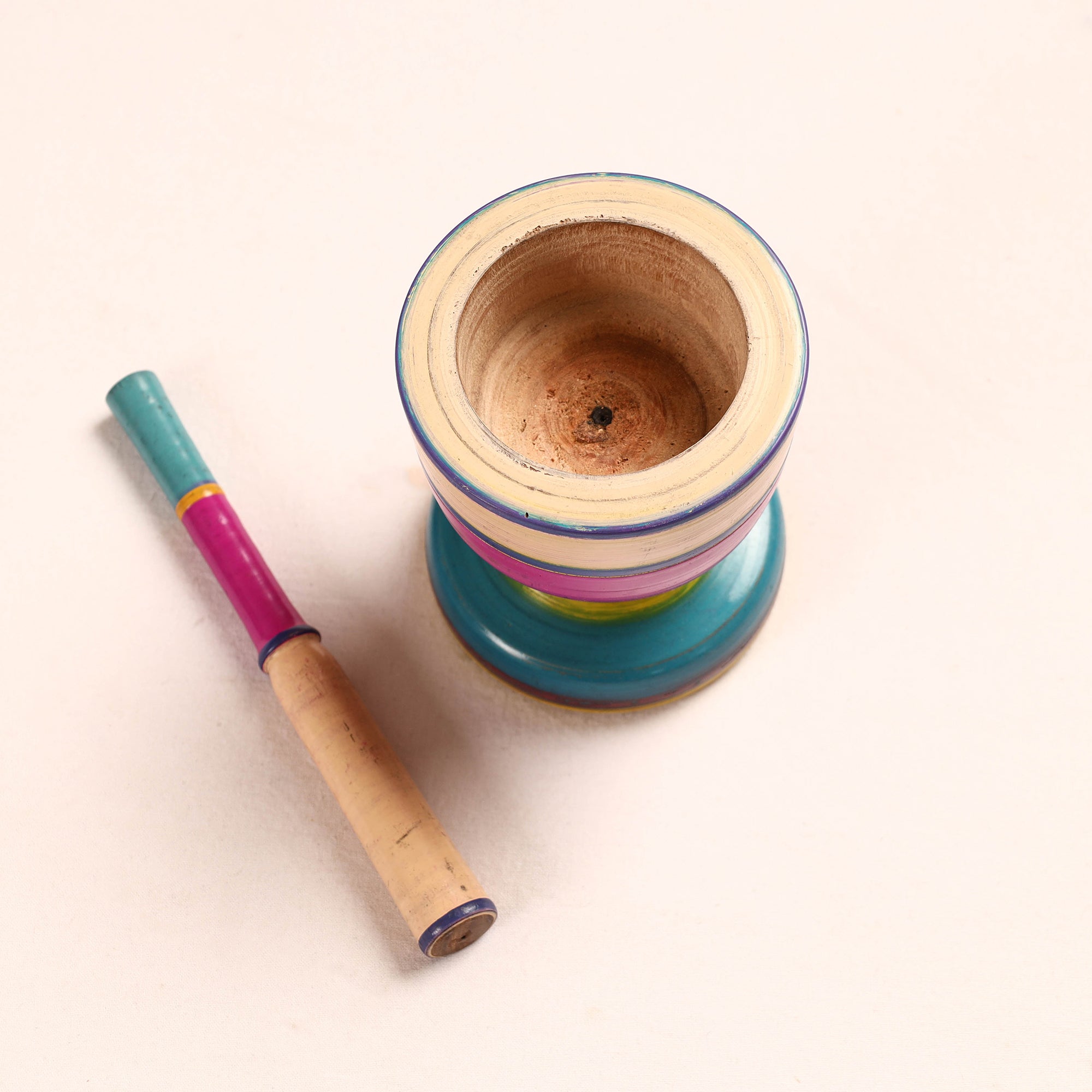 This handcrafted wooden mortar and pestle set is made of babool wood with lacquered colors. This set is meticulously handcrafted by skilled artisans from the Vadha community in villages like Nirona and Jura. They begin by selecting babool wood, which is known for its durability and strength. Layers of colored lacquer are applied to the wood, and intricate designs and effects are chiseled to create a stunning visual appeal.