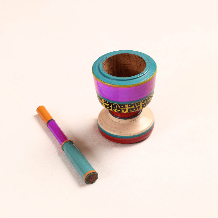 This handcrafted wooden mortar and pestle set is made of babool wood with lacquered colors. This set is meticulously handcrafted by skilled artisans from the Vadha community in villages like Nirona and Jura. They begin by selecting babool wood, which is known for its durability and strength. Layers of colored lacquer are applied to the wood, and intricate designs and effects are chiseled to create a stunning visual appeal.