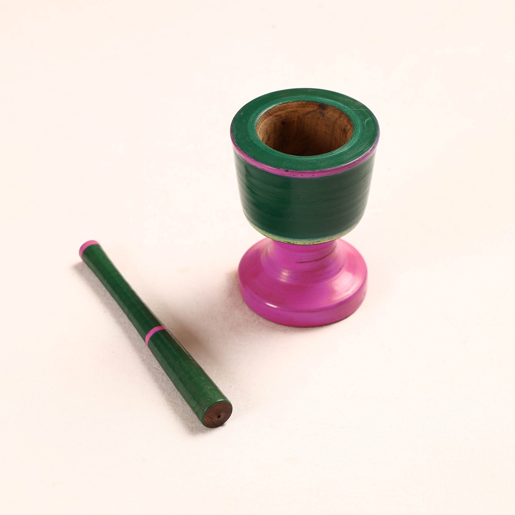This handcrafted wooden mortar and pestle set is made of babool wood with lacquered colors. This set is meticulously handcrafted by skilled artisans from the Vadha community in villages like Nirona and Jura. They begin by selecting babool wood, which is known for its durability and strength. Layers of colored lacquer are applied to the wood, and intricate designs and effects are chiseled to create a stunning visual appeal.