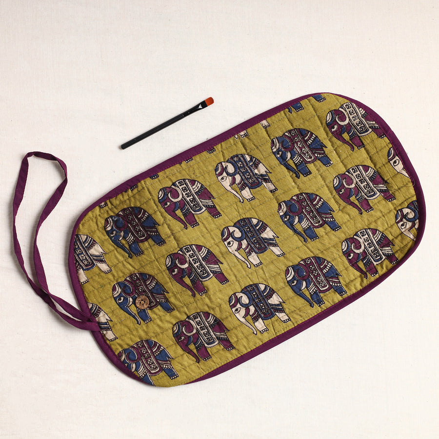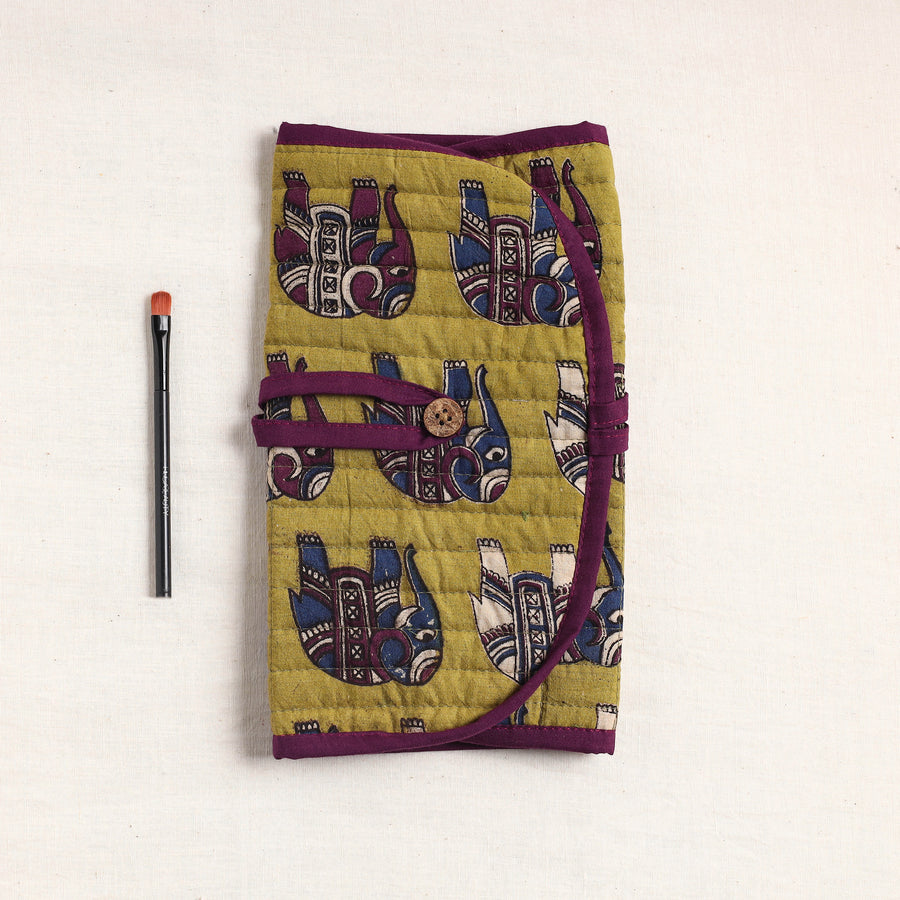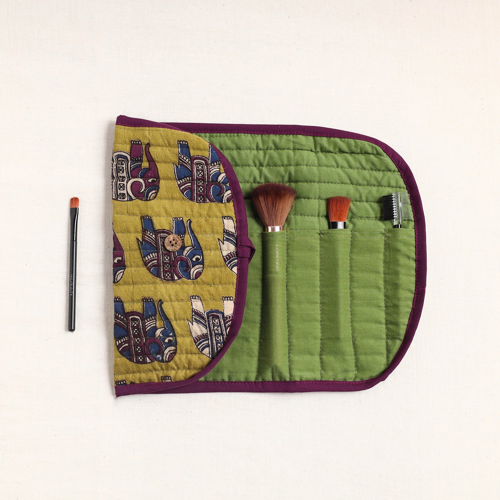 Handcrafted multipurpose segmented make-up brush wrap pouch or storage organizer made from kalamkari-printed cotton fabrics and foam, textured with handmade textiles from India. Boasting one large and five small pockets, it ensures secure and organized storage for your brushes. Ideal for travel or daily use, adding an elegant touch to your beauty routine.